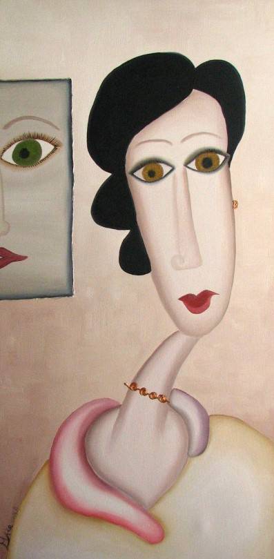 Obraz urzeka swoją prostotą i elegancją. Dominują pastelowe kolory, które nadają mu delikatności i spokoju. Główny element stanowi wydłużona twarz kobiety, z dużymi, ekspresyjnymi oczami, które przyciągają wzrok. Brązowe włosy są starannie ułożone, a usta w kolorze czerwonego wina dodają całości nuty tajemniczości. Tło jest neutralne, co podkreśla subtelność postaci. Cała kompozycja jest harmonijna, z wyraźnym podziałem na przód i tło. Atmosfera obrazu jest raczej melancholijna. Kobieta zdaje się być zamyślona lub pełna refleksji. A może zastanawia się, co ugotować na kolację? Styl artystyczny przypomina nieco kubizm, z pociągłymi kształtami i uproszczonymi formami. Techniki, które zastosował artysta, mogą wskazywać na wpływy modernizmu. Ten obraz może budzić mieszane emocje. Z jednej strony, jego delikatna kolorystyka i proste kształty przynoszą spokój. Z drugiej, wyraz twarzy może skłonić do zastanowienia i introspekcji. U mnie wywołuje uczucie nostalgia, jakbym patrzył w przeszłość i próbował zrozumieć uczucia tej kobiety. Na pewno coś tam się kryje. Ten jeden eye contact z obrazem sprawia, że zastanawiasz się, co ona myśli. Obrazy mają to coś, co sprawia, że chcesz się w nie wpatrywać bez końca.