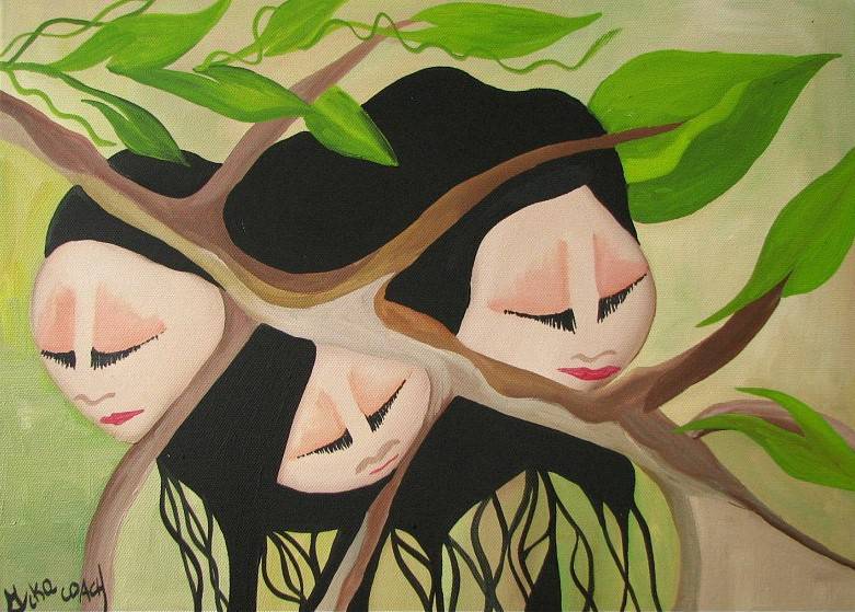 Na obrazie widzimy intrygującą kompozycję trzech twarzy subtelnie wplecionych w gałęzie drzewa. Dominują delikatne odcienie zieleni i brązu, które tworzą harmonijną i organiczną całość. Tło przechodzi od jasnej zieleni do beżu, co nadaje dziełu spokojny, naturalny klimat. Twarze mają zamknięte oczy, a ich wyraz sugeruje ciszę i kontemplację, jakby drzemały w objęciach natury. Artysta posługuje się uproszczonymi kształtami i płaską kolorystyką, co nadaje obrazowi nieco abstrakcyjny charakter. Technika ta przypomina nieco naiwne malarstwo, ale jednocześnie jest pełna wyrafinowania. Liście i gałęzie są namalowane z precyzyjną dbałością o szczegóły, legato, co wprowadza do kompozycji dynamikę i rytm. Patrząc na obraz, można poczuć spokoj, może nawet nostalgia, jakby przypominał o dzieciństwie spędzonym na świeżym powietrzu. Czuję, że ta scena emanuje jakąś magiczną "connection" z naturą. Jest w niej coś głęboko kojącego, ale i prowokującego do refleksji. Ja bym tam chciał zamieszkać, z tymi twarzami drzew. To obraz, który zatrzymuje i zmusza do zatrzymania na chwilę.