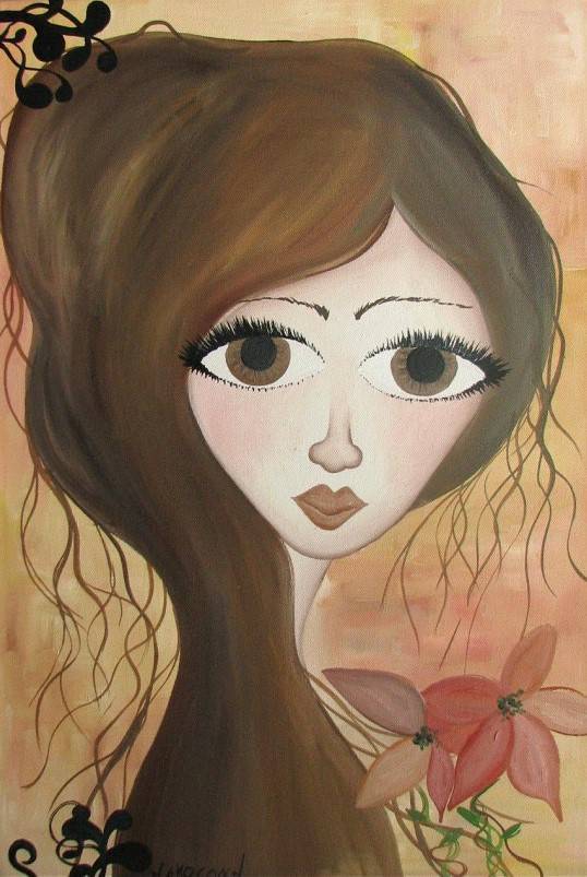 Ten obrazek przedstawia portret tajemniczej postaci o dużych, okrągłych oczach, które przyciągają wzrok i zdają się śledzić cię po jego powierzchni. Tło jest pastelowe, subtelne, z przewagą ciepłych odcieni różu i beżu, co dodaje całości łagodności. Kobieta na obrazie ma długie, brązowe włosy, które wydają się być jednością z tłem, splatając się w delikatne fale. Jej twarz jest nienaturalnie wydłużona, co dodaje elementu surrealizmu. Kwiat w dolnej części obrazu, z różowymi płatkami, wnosi do kompozycji lekkość i kontrast. Nastrój obrazu jest spokojny, lekko melancholijny - jakby postać kogoś wyczekiwała. Styl, w jakim jest namalowana, przypomina trochę technikę naiwną, z prostymi, lecz wyrazistymi liniami i kształtami. Artysta zastosował "soft" podejście do szczegółowości, co nadaje obrazowi dziecięcej czystości. Obraz może wywoływać uczucie zagadkowości i zastanowienia. Czujesz, że chcesz poznać tę postać bliżej, dowiedzieć się, co kryje się za tymi wielkimi oczami. Jakby na chwilę świat zatrzymał się w chwili, którą artysta uchwycił na płótnie. Tyle różnych myśli i uczuć, które w nas budzi. Więc super by było, jakby obraz coś do nas mówił, prawda? Jest w nim coś, co przyciąga, co nie pozwala oderwać wzroku. Może to jest właśnie ta magia sztuki. A może się mylę? What do you think?