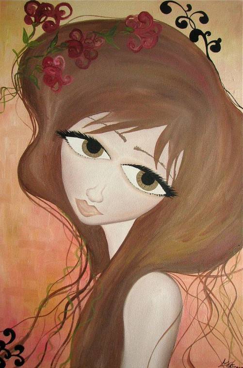 Obraz przedstawia młodą kobietę z ogromnymi oczami, które wydają się patrzeć prosto w duszę widza. Dominują ciepłe odcienie brązu i beżu, które otulają jej długie, płynne włosy. Tło subtelnie przechodzi od złotego do różowego, dodając kompozycji delikatności. Kwiaty wplecione we włosy mają ciemnoczerwony odcień, dodając dramatyzmu całości. Atmosfera obrazu jest nostalgiczna, z nutką tajemniczej melancholii. Można by rzec, że emanuje dreamy vibe, który przyciąga uwagę i każe zatrzymać się na chwilę dłużej. Artysta używa łagodnych pociągnięć pędzla, a kontury są miękkie, co nadaje dziełu marzycielskiego charakteru. Patrząc na tę postać, można odczuć pewną tęsknotę i zamyślenie. Jest w tym coś z dziecięcej wyobraźni. „Ona wygląda jak bajkowa księżniczka!” - pomyślałoby dziecko. Takie przedstawienie postaci pozostawia szerokie pole do interpretacji, pozwalając widzowi na własne odczytanie emocji. Osobiście, obraz budzi we mnie uczucie spokoju, ale i lekkiego niepokoju. Coś w spojrzeniu tej postaci jest intrygującego, może nawet lekko smutnego. To uczucie, które pozostaje w pamięci na dłużej.