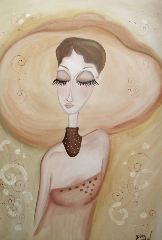 Obraz przedstawia postać o delikatnych rysach twarzy, zanurzoną w pastelowych odcieniach beżu i brązu. Dominują tu miękkie, płynne linie, które krążą wokół centralnej postaci, nadając kompozycji organiczny character. Jej oczy, zamknięte niczym podczas snu, dodają całemu dziełu niepowtarzalnej atmosfery spokoju i zamyślenia. To jakby stanąć na skraju jawy i snu. Artysta użył subtelnych pociągnięć pędzla i laserunków, co dodaje obrazowi lekkości. W powietrzu czuć nutkę eterycznej tajemnicy. Patrząc na ten obraz, można poczuć się jak w bajce, gdzie świat realny splata się z magicznym. Mamo, ona jest taka piękna! Te zakręcone wzory wokół mają coś z dziecięcej zabawy, jakby małe spiralki w wirujących chmurach. Obraz zdaje się mówić o wewnętrznym pięknie i spokoju ducha. Można się zastanawiać, czy ta postać to rzeczywista osoba, czy może tylko dream, który artysta uchwycił na płótnie. Z jednej strony to dzieło jest magiczne i subtelne, z drugiej zaś, kryje w sobie głęboki ładunek emocjonalny. Obraz zaprasza do refleksji nad tym, co skrywa się w duszy człowieka. Nieformalny urok tej kompozycji przyciąga i nie pozwala oderwać oczu. Cóż, it's mesmerizing w swojej prostocie i elegancji. Patrząc na to dzieło, czuję spokój i pewną tajemnicę wiszącą w powietrzu.