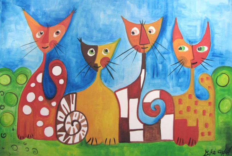 Na obrazie widzimy cztery koty o intrygującej kolorystyce i nietypowych kształtach. Barwna, żywa paleta zdominowana jest przez czerwienie, pomarańcze, żółcie i zielenie, które tworzą harmonijną kompozycję z błękatnym tłem. Każdy z kotów ma inną osobowość, którą oddają zabawne wzory na ich futrze – kropki, spirale i geometryczne kształty. Atmosfera tego dzieła jest radosna i beztroska, wręcz zachęca do uśmiechu. Artysta zastosował technikę stylizacji, z nutą kubizmu, by oddać abstrakcyjną wizję tych zwierzaków. Patrząc na ten obraz, można poczuć się, jakbyśmy byli w magic world, gdzie wszystko jest możliwe. Koty mają przenikliwe spojrzenia, które zdają się podążać za widzem. Jest w tym coś z dziecięcej radości, swojskości – jakbyśmy byli na chwilę w kolorowym śnie. Mówi się, że malarstwo to emocje na płótnie, a w przypadku tego obrazu faktycznie czuć energię, radość i lekkość. "Koty są takie śmieszne", mógłby powiedzieć mały Jaś, widząc te urocze stworzenia. To dzieło wywołuje u mnie uśmiech i chęć do zanurzenia się w dzieciństwie.