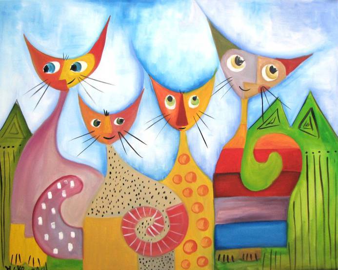 Na obrazie widzimy cztery abstrakcyjne koty, które od razu przyciągają uwagę swoimi intensywnymi kolorami i nietypowymi kształtami. Dominują tu odcienie pomarańczowego, żółtego i zielonego, kontrastujące z błękitnym tłem. Kompozycja jest dynamiczna, a kształty kotów są wyraźnie geometryczne, przywodząc na myśl kubizm. Atmosfera obrazu jest radosna i lekko surrealistyczna. Technika artysty ma w sobie coś z zabawy formą i kolorem, co nadaje dziełu dziecięcą świeżość. Coś jak "colorful explosion", można by rzec. Wydaje się, że koty mają swoje osobowości, każda inna, patrzą na widza dużymi, błyszczącymi oczami, co wywołuje uśmiech. Te zabawne kocie łobuziaki mogą budzić skojarzenia z dziecięcymi rysunkami, pełne są energii i radości. Gdy patrzę na ten obraz, przypomina mi się beztroski czas dzieciństwa, kiedy rysowałem wielkimi kredkami po całym papierze. Może ktoś dostrzeże w nich chaos, inni harmonię, ale na pewno nie przejdą obok obojętnie. To jak odkrywanie małych cudów w świecie pełnym dorosłych spraw.