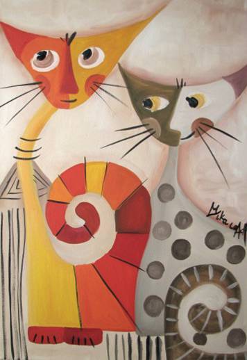 Obraz, pełen żywych barw, przedstawia dwie abstrakcyjne postacie kotów. Ich długie szyje i spiralne ogony wibrują odcieniami żółci, pomarańczu i czerwieni, przez czerń po zieleń. Artysta używa wyraźnych konturów i geometrycznych kształtów, by nadać dziełu nowoczesny, surrealistyczny styl. Ten obraz ma w sobie coś takiego, co sprawia, że czujesz się trochę jak w bajce, w takim świecie, gdzie wszystko jest możliwe. Jest jak dream, pełen prostych, ale hipnotyzujących elementów. Kiedy się na niego patrzy, można niemal usłyszeć cichy mruczek kotów, co dodaje całości intymnej atmosfery. Patrzenie na ten obraz to jak wyprawa w dziwny, ale przytulny świat. Technika artystyczna jest tu dość śmiała; to nie tylko kwestia kolorów, ale i form, które wydają się tancerzyć przed oczami. Za każdym razem gdy na niego patrzę, znajduję nowe szczegóły, które wcześniej przeoczyłem. A mój brat powiedziałby: "Te koty wyglądają, jakby umiały mówić!" W rzeczy samej, wzbudza to dziecięcą radość i zaskoczenie. Artysta wprowadza widza w swój świat, oferując doświadcznie pełne ciepła i zabawy. Czyż ta sztuka nie jest jakimś magicznym sposobem na oderwanie się od rzeczywistości? To coś, co pobudza wyobraźnię i daje możliwość spotkania z czymś niesamowitym oraz zaskakująco znajomym.