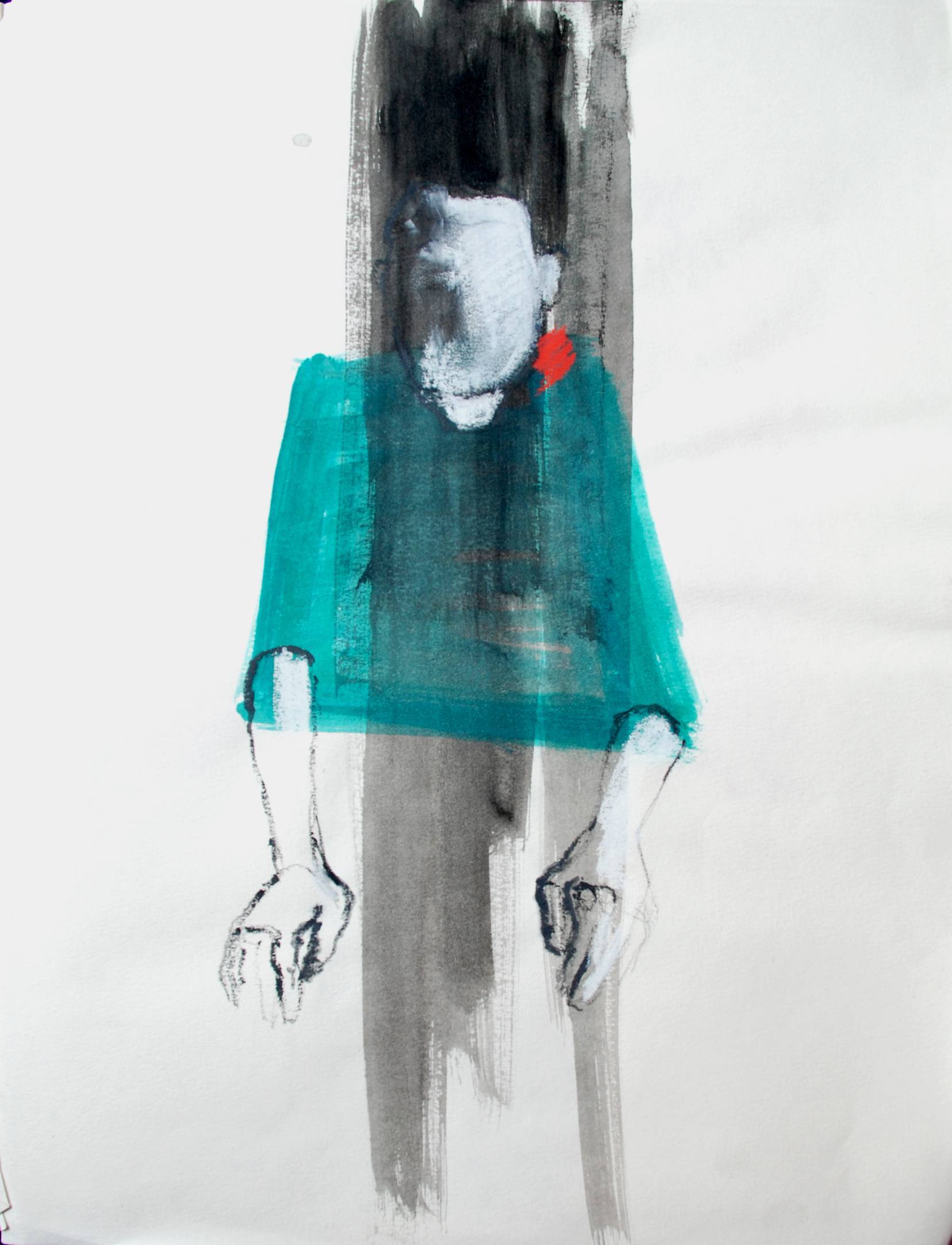 Obraz emanuje prostotą, a jednocześnie głębią emocji. Na płótnie widoczna jest postać o rozmytej twarzy. Jej kontury zanurzone w szarościach dodają dziełu mistycyzmu. Centralny element to intensywna, turkusowa plama - jakby sweter postaci, kontrastująca z bielą tła i czernią góry. Czerwona plama na ramieniu wyróżnia się niczym krzyk w ciszy. Technika malarska jest oszczędna, niemalże ascetyczna, z wyraźnymi pociągnięciami pędzla. Wydaje się, że artysta postawił na minimalizm, by wydobyć maksymalne emocje. Remarkable! Obraz wywołuje uczucie niepokoju i refleksji. Gdzie jest ta osoba? Można poczuć samotność i izolację. Ręce lekko opadające nadają postaci wrażenie rezygnacji czy zmęczenia, a może oczekiwania. Nasz umysł zaczyna snuć opowieści. Czuję, jakby obserwowanej osobie coś umykało, jak sen, który nie daje się uchwycić. Dzieciak mógłby powiedzieć: „Dlaczego tamta osoba ma takie smutne ręce?”. Subtelne przejścia między formalnością a swobodnym tonem w opisie odzwierciedlają dialog, jaki obraz nawiązuje z widzem. Rozmyta twarz nie pokazuje emocji, ale zmusza do ich poszukiwania.