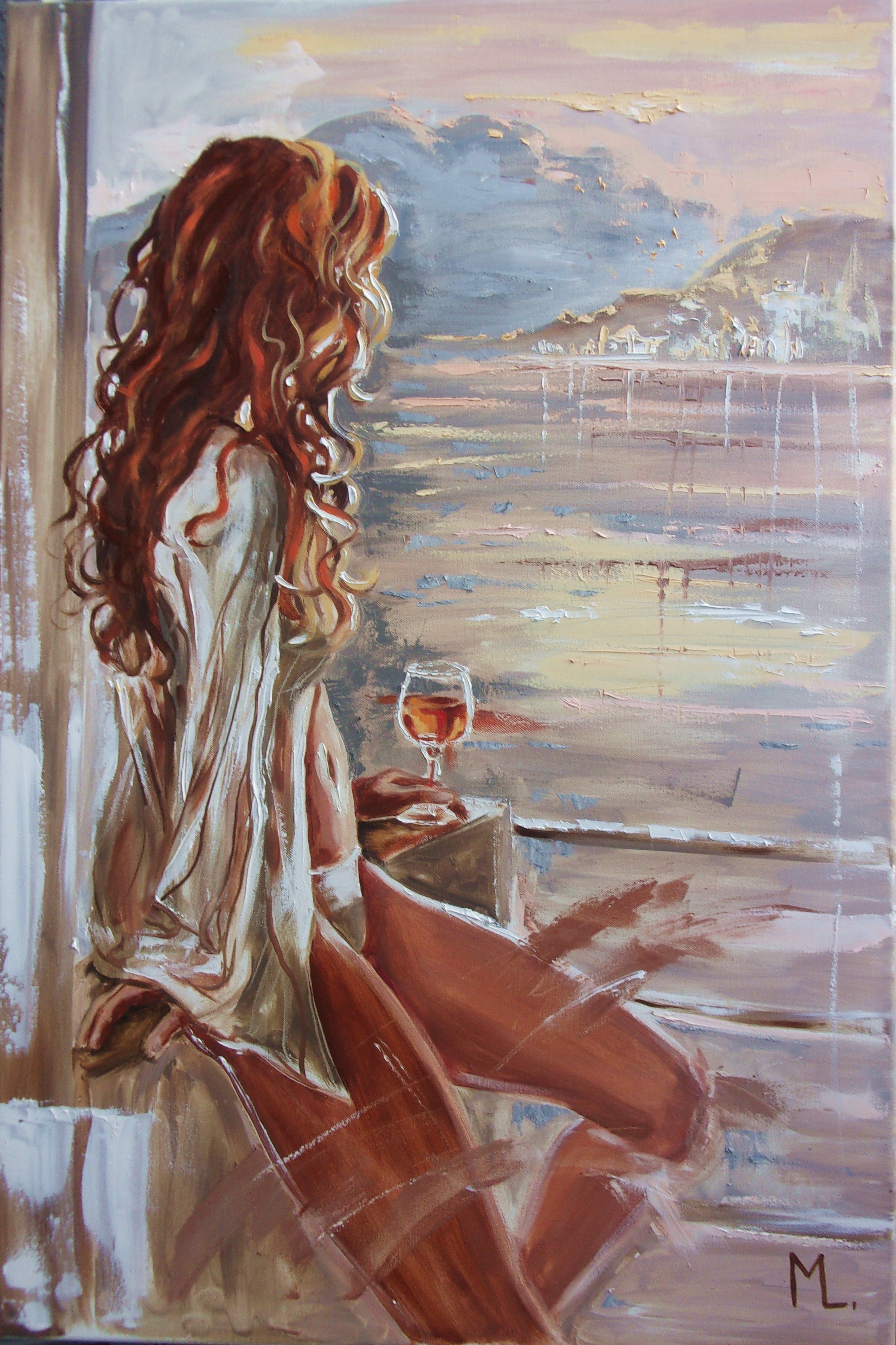 Obraz ukazuje kobietę siedzącą w półprofilu, spoglądającą na morze podczas zachodu słońca. Dominują ciepłe, stonowane barwy – złote, brązowe i różowe. Jej włosy, rozpuszczone, spływają delikatnymi falami po ramionach, mieniąc się rudymi refleksami w promieniach słońca. Kompozycja jest spokojna, zrównoważona, a postać kobiety stanowi centralny punkt dzieła. Nastrój obrazu jest pełen spokoju i refleksji, można poczuć, jak gdyby obraz mówił "relax". Styl artystyczny to impresjonizm z odrobiną romantyzmu. Użyte pociągnięcia pędzla są dynamiczne, ale jednocześnie subtelne, co dodaje teksturę całości. Technika jest luźna, nieco niedbała, co potęguje wrażenie spontaniczności. Obraz może wzbudzać uczucia tęsknoty i nostalgii, kiedy patrzymy na samotną postać u brzegu morza. Myślę że ta pani mogłaby opowiadać historie. Przechodząc do bardziej emocjonalnego aspektu, widok ten przypomina mi letnie wieczory przy plaży. Aż chciałoby się tam być i poczuć morską bryzę na twarzy. To jedno z tych miejsc, które promieniuje "calm" i zaprasza do marzeń. Fascynuje mnie, jak artysta uchwycił tę chwilę, zatrzymując czas.