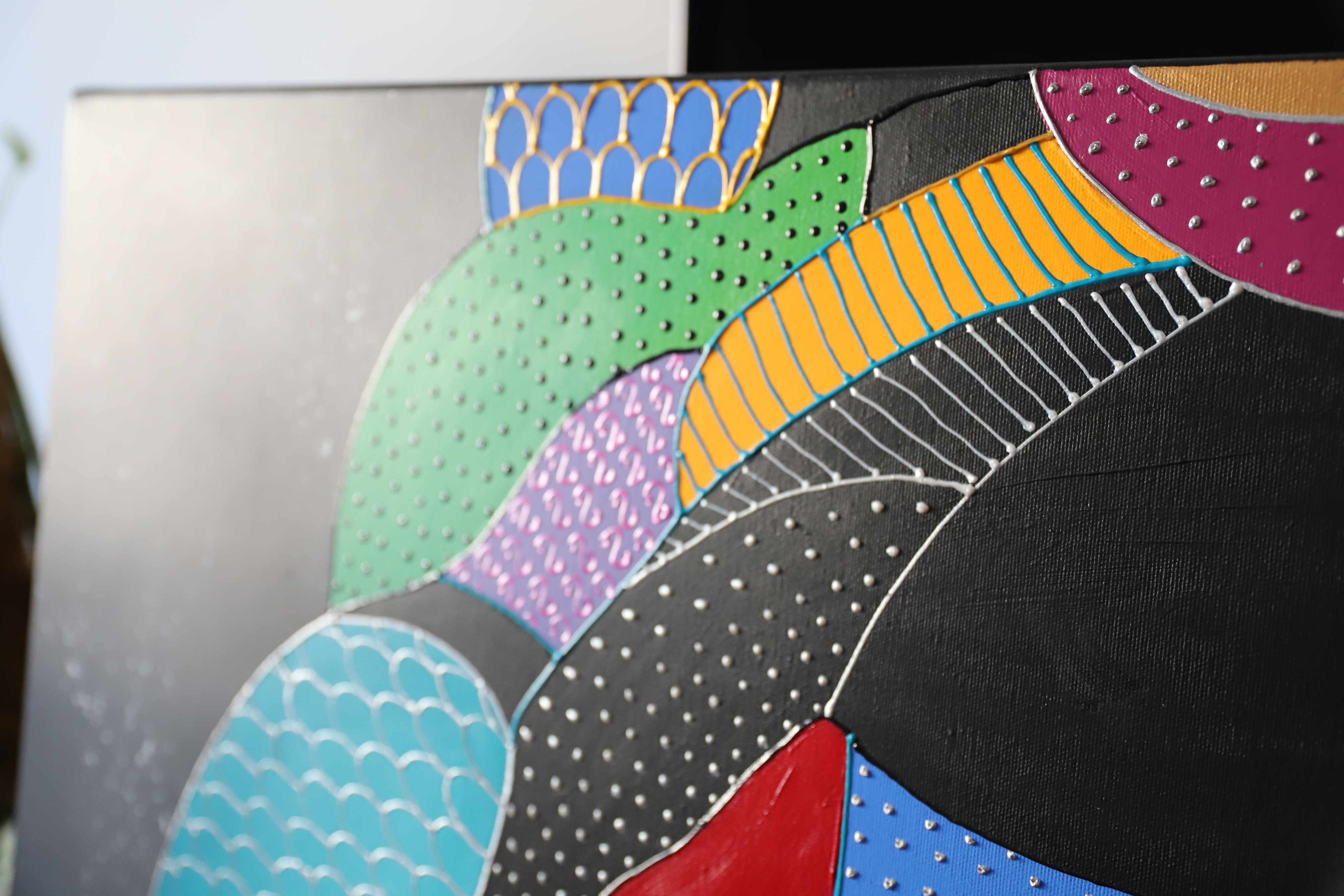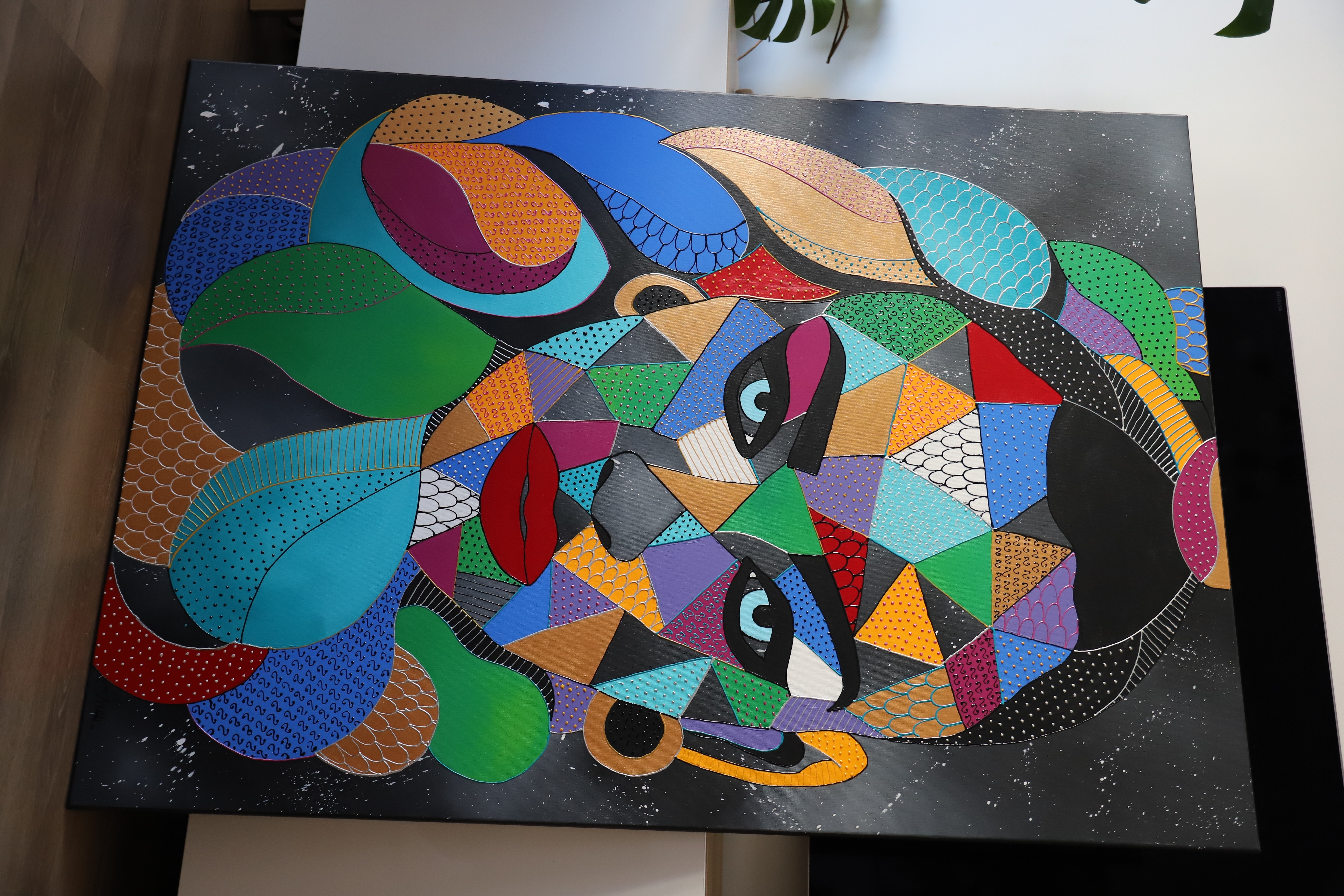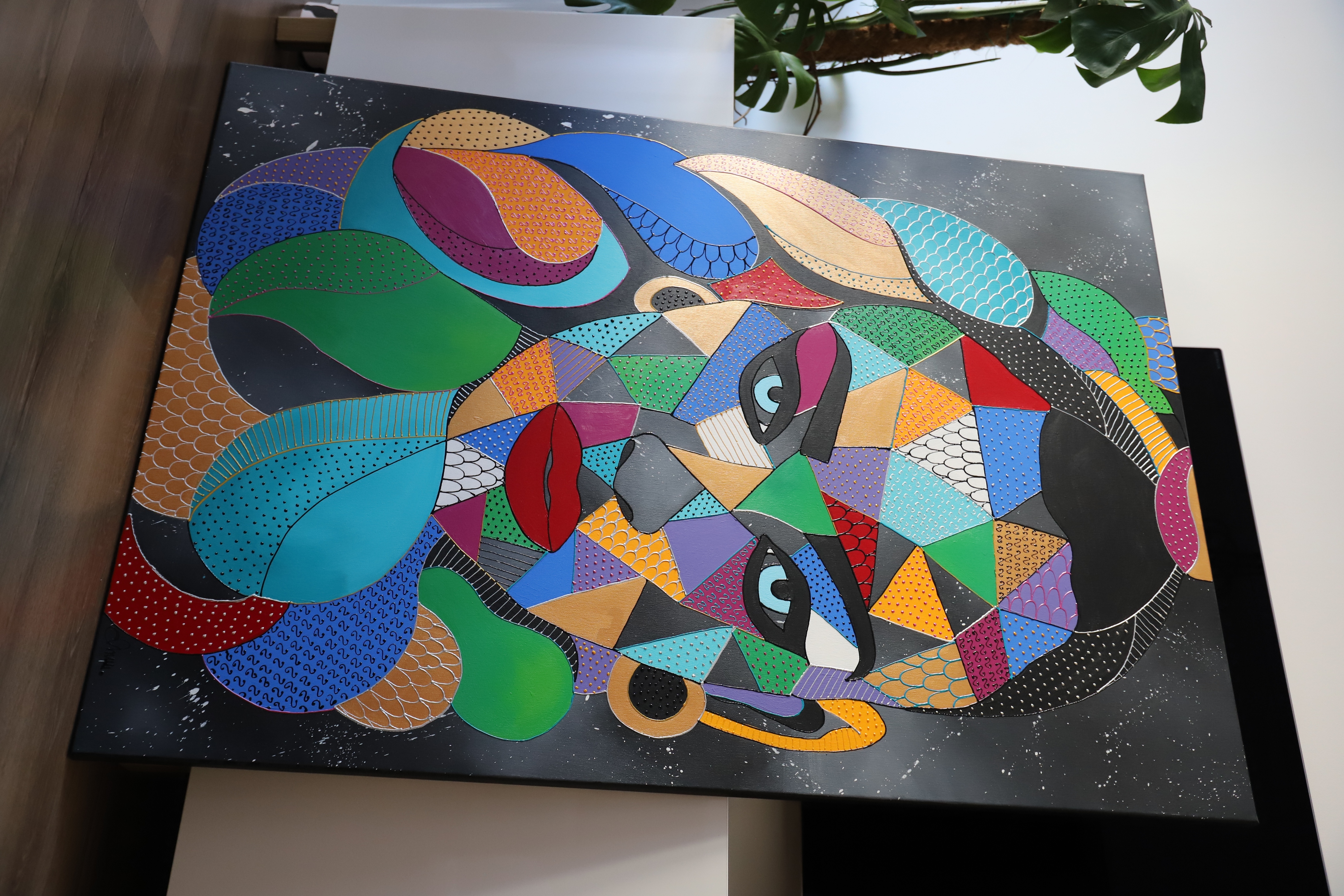 "Siła spojrzenia" to obraz, który przyciąga i hipnotyzuje, łącząc klasyczne podejście do portretu z geometryczną i abstrakcyjną formą. Wykorzystanie pasty akrylowej w tym kolorów perłowych i metalicznych, nadaje kompozycji trójwymiarowości, która zaprasza do interakcji poprzez delikatny dotyk. Centralnym punktem dzieła jest portret kobiety, której intensywne spojrzenie emanuje siłą i tajemniczością. Precyzyjnie dobrane wzory i dynamiczna gra form podkreślają złożoność postaci, nadając obrazowi wielowymiarowy charakter. Kontrastowe barwy oraz strukturalne detale potęgują ekspresję, czyniąc kompozycję niezwykle angażującą. To dzieło jest nie tylko eksploracją piękna i kobiecości, ale także zaproszeniem do atmosfery magnetyzmu, głębi i refleksji.