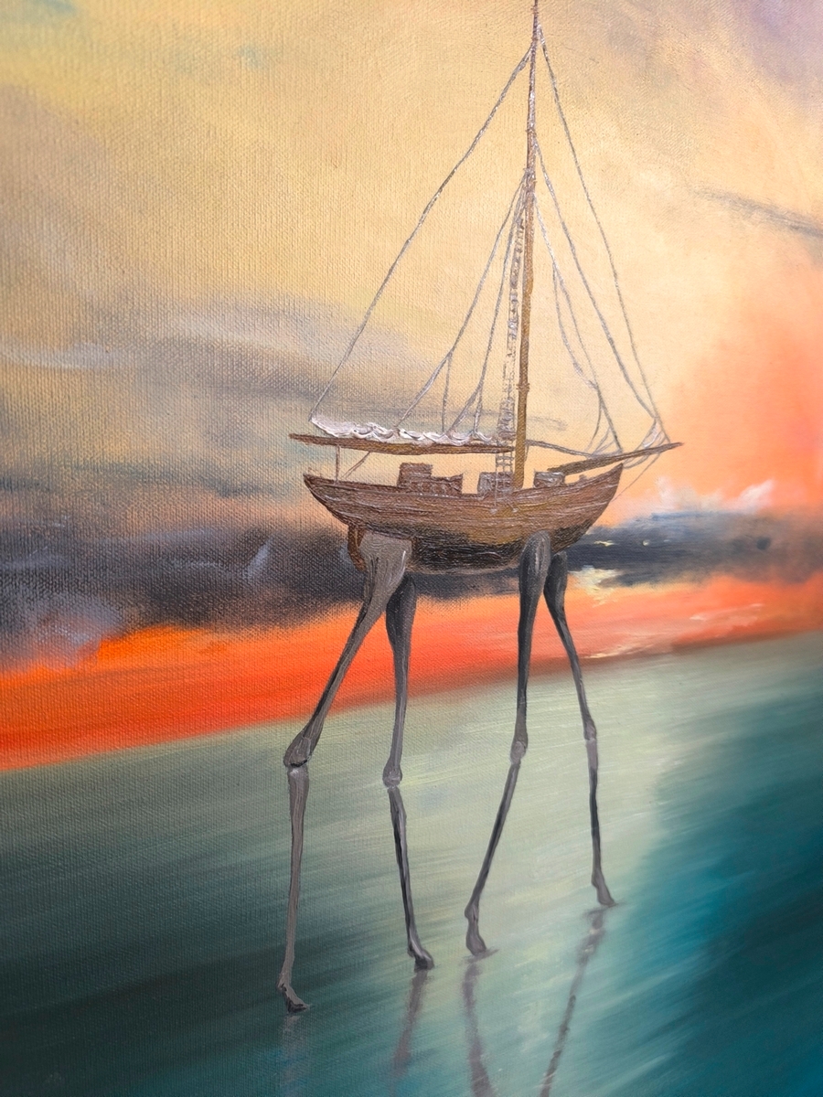 obraz olejny - surrealizm - Słoneczny akord I Rok produkcji 2025 r,. Obraz malowany pędzlem, boki malowane, pokryty werniksem Kolorystyka: ciepłe żółcienie, pomarańcze, turkus. Temat: Na obrazie widać samotną łódź żaglową stojącą jakby na długich. cienkich nogach, pośród spokojnego morza. Tło to rozlany zachód słońca, pomarańcze i żółcienie przechodzą w mleczne fiolety chmur, a niżej w chłodny turkus wody. Kompozycja jest prosta, centralna sylwetka łodzi i jej lustrzane odbicie ciągną wzrok w dół, jakby w głąb snu. Pociągnięcia farby są miękkie, lekko rozmyte, coś jak akwarela z domieszką oleju, otulone blaskiem światła. Nastrój jest cichy, trochę niepokojący ale też kojący. Można poczuć tu samotność i dziwną nadzieję. Statek stoi a za razem idzie. Myślę o podróży bez mapy i o tym. że czasem trzeba iść na cienkich nogach odwagi. Wymiary 80cm x 80 cm