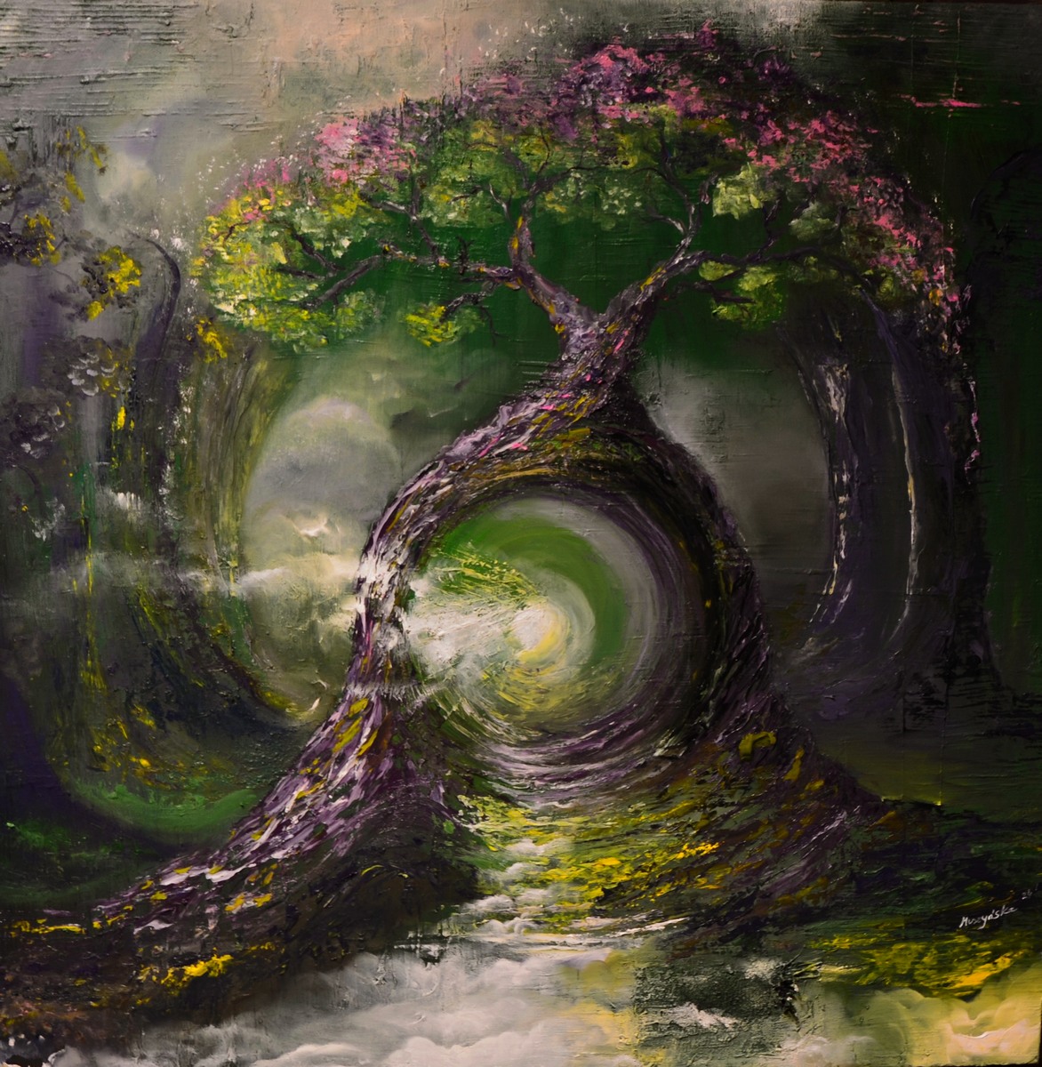 braz olejny - abstrakcja - Deep -malowany na bawełnianym płótnie. Rok produkcji 2024 r,. Obraz malowany szpachlą, pędzlem, technika własna, boki malowane, pokryty werniksem Kolorystyka: zieleń, brąz, odcienie różu Motyw: Drzewo, baśniowy. Połączenie tajemnicy, spokoju, przejście między światem realnym a magicznym. Gruba faktura na pniu, wzmacnia wrażenie głębi i ruchu Wymiary 80cm x 80 cm Sygnowany z przodu i z tyłu