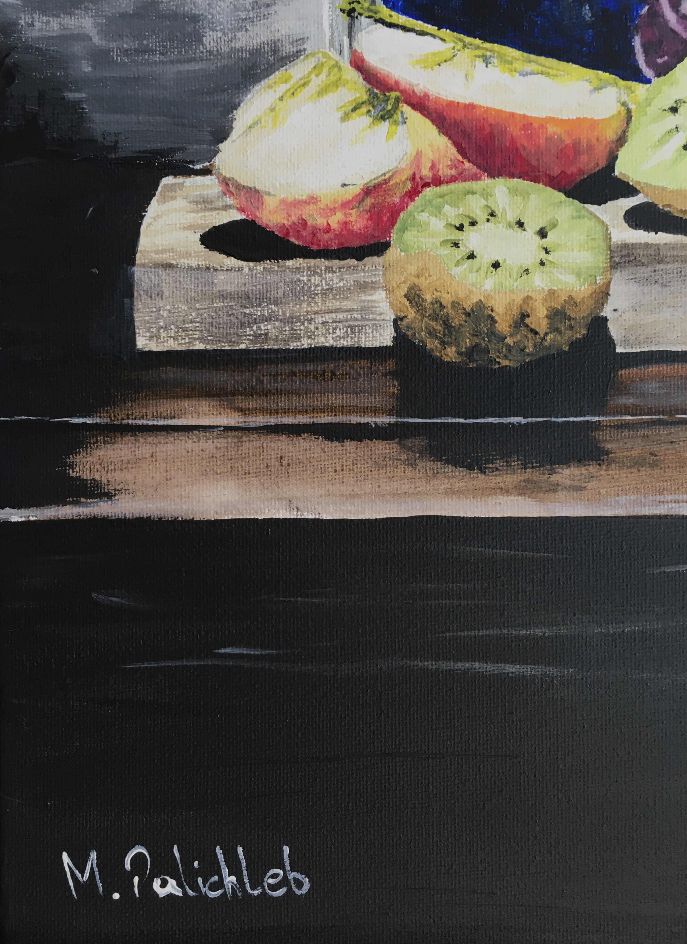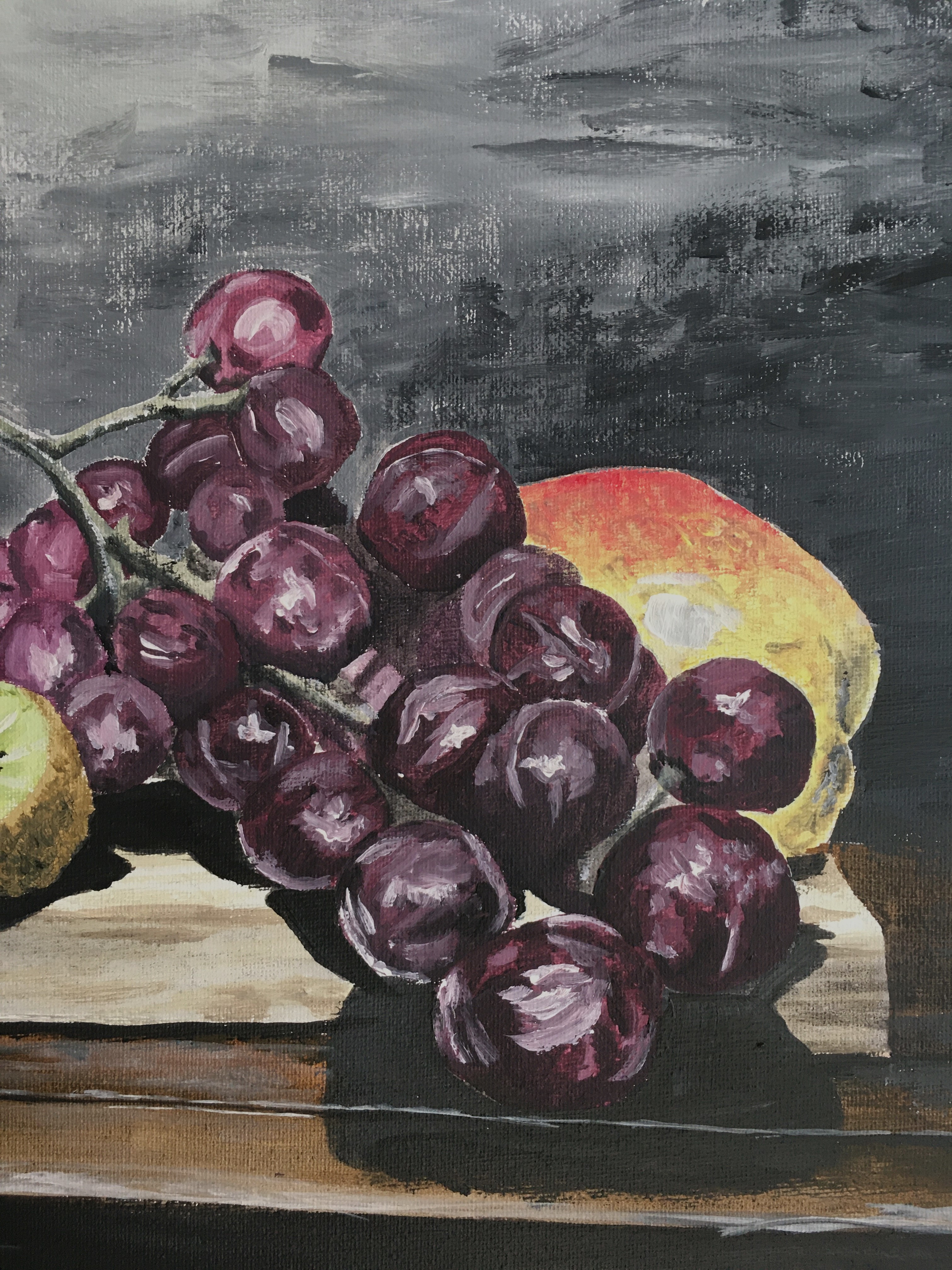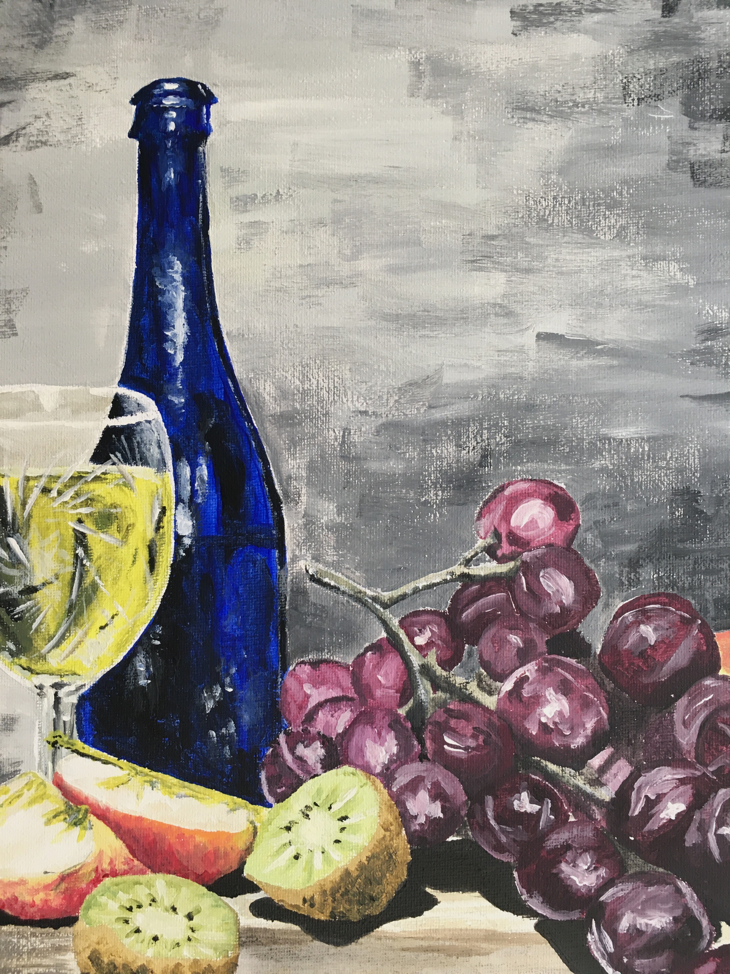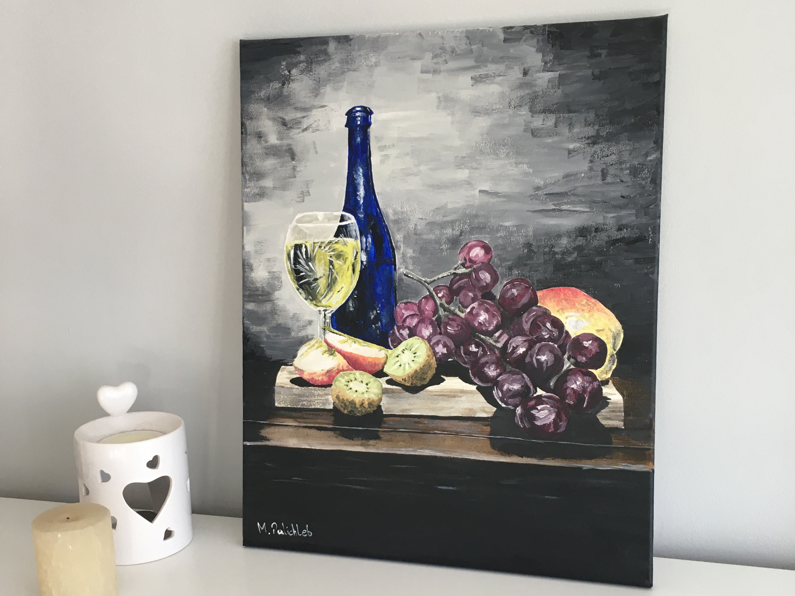 Na obrazie widać urokliwą martwą naturę pełną kontrastów. Centralnym punktem kompozycji jest szkło wypełnione złocistym winem, stojące obok smukłej, ciemnoniebieskiej butelki. Soczyste winogrona o głębokim fioletowym odcieniu, przywołują na myśl letnie wieczory w winnicy. Tło jest stonowane, w odcieniach szarości, co sprawia, że owoce i wino "wyskakują" na pierwszy plan. Obraz emanuje spokojnym, niemal medytacyjnym nastrojem, jakby artystka chciała uchwycić chwilę zatrzymaną w czasie. Widz czuje nostalgię za czasami, kiedy dni płynęły wolniej. Ktoś patrząc na ten obraz może poczuć głód, dosłownie i w przenośni. To artystyczne „delicious” zaproszenie do refleksji nad codziennymi przyjemnościami. Obraz akrylowy na płótnie. Wymiary: 40 x 50 cm Sygnowany i werniksowany. Bez ramy. Zamalowane boki. Do obrazu dołączony certyfikat autentyczności. Kolory na zdjęciu mogą nieznacznie odbiegać od tych w rzeczywistości.