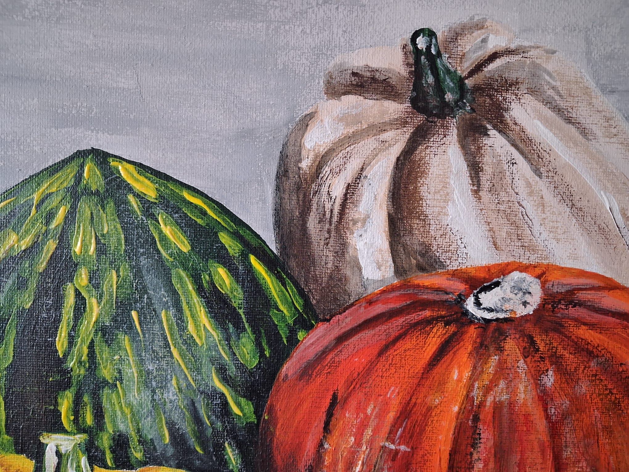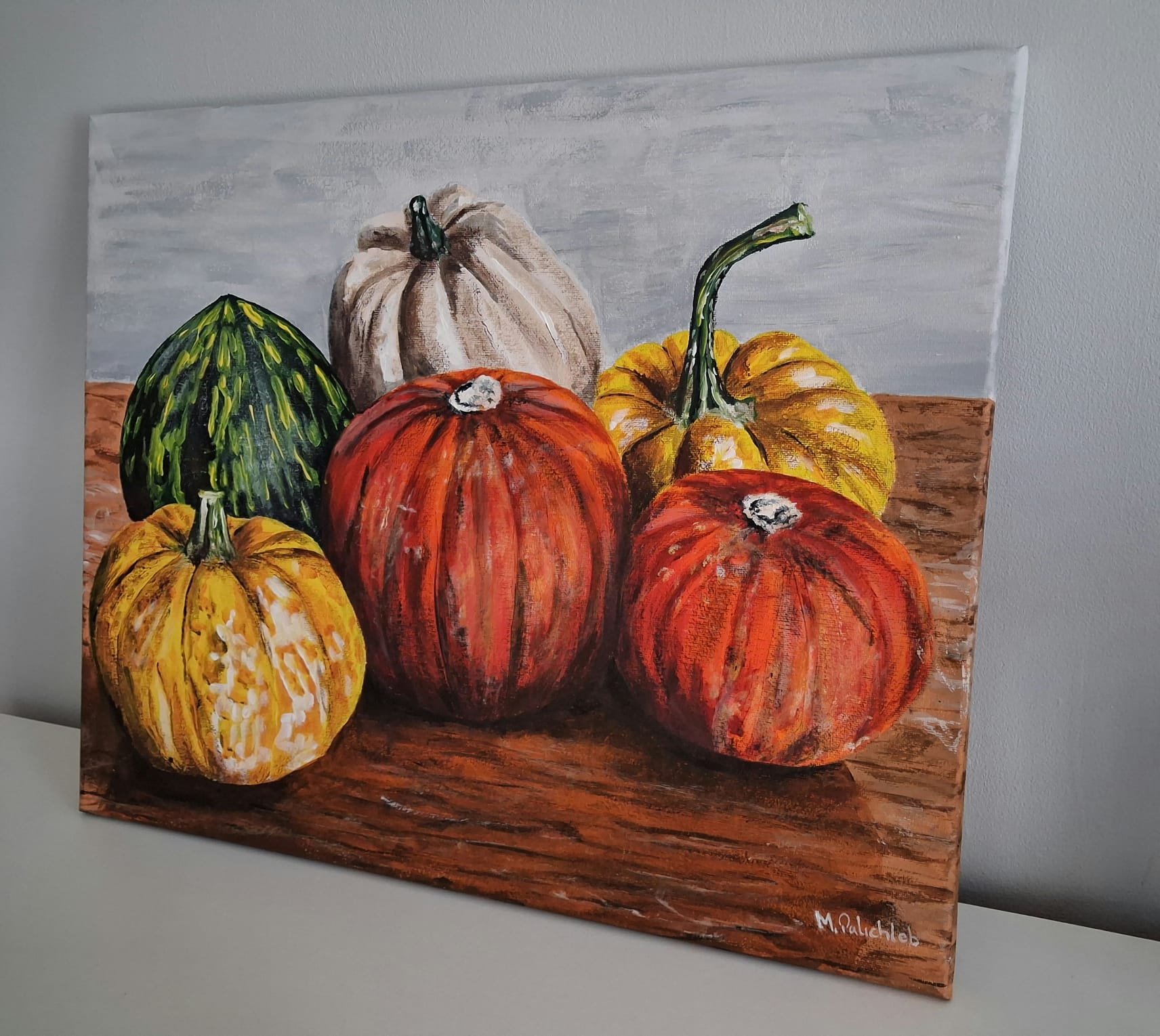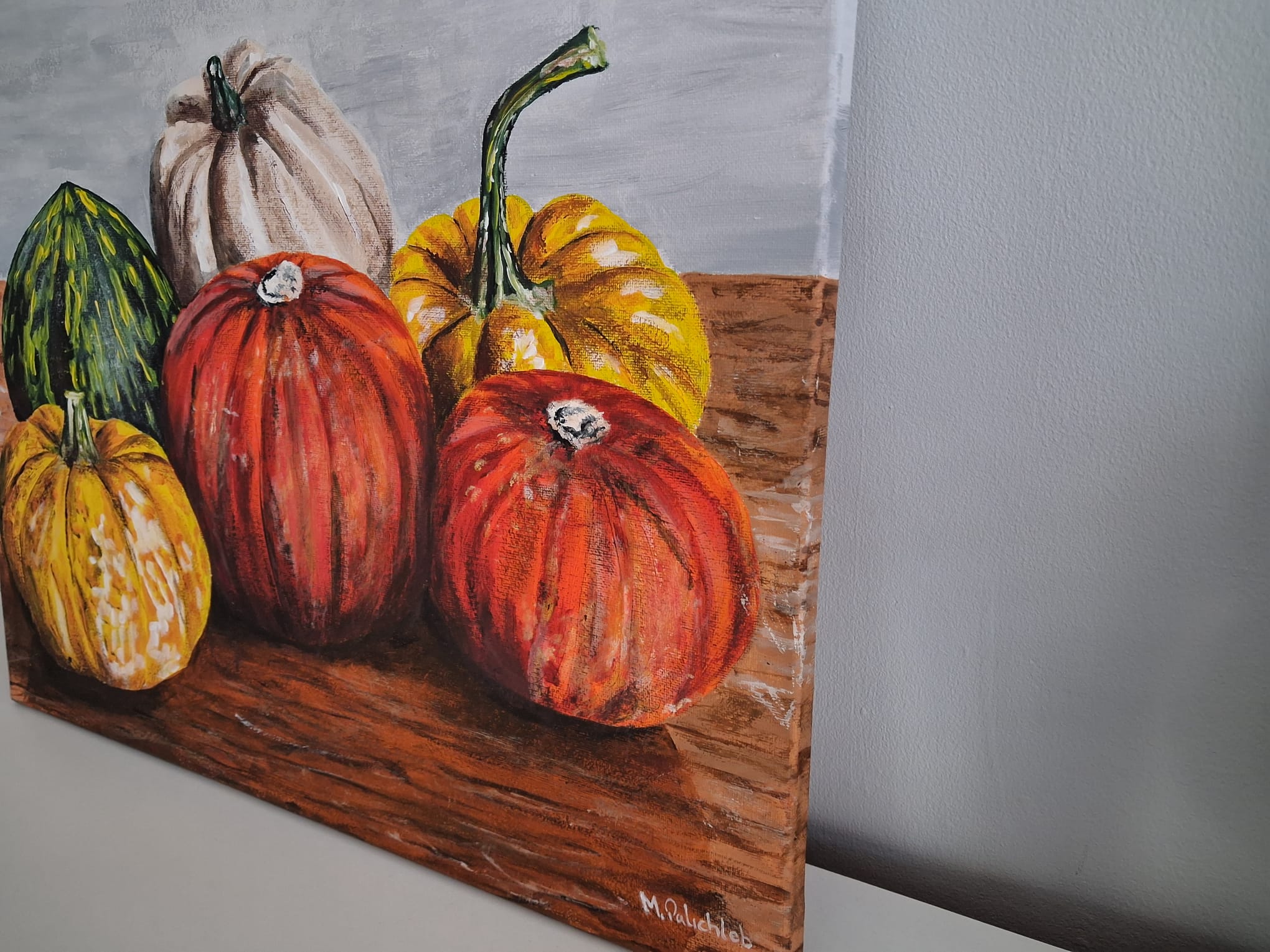 Na obrazie widzimy różnorodne dynie w pełnej krasie jesiennej eksplozji kolorów. Każda z nich ma swój unikalny charakter – od ciemnozielonej z żółtymi cętkami, przez pomarańczowe o głębokim, ciepłym odcieniu, aż po subtelną, niemal eteryczną biel największej. Są ustawione na drewnianym stole, a ich rozłożenie zdaje się być dokładnie przemyślane, by stworzyć dynamiczną, ale i harmonijną kompozycję. Atmosfera tego dzieła jest ciepła i nostalgiczna, jak spokojne popołudnie na wsi. Obraz akrylowy na płótnie. Wymiary: 50 x 40 cm Sygnowany i werniksowany. Bez ramy. Zamalowane boki. Do obrazu dołączony certyfikat autentyczności. Kolory na zdjęciu mogą nieznacznie odbiegać od tych w rzeczywistości. obraz akrylowy na płótnie, ręcznie malowany obraz, martwa natura dynie, obraz jesienny, dekoracja do kuchni, rustykalna sztuka, obraz do jadalni, sztuka współczesna, unikatowy obraz na ścianę, dekoracja do restauracji, ciepłe barwy w malarstwie