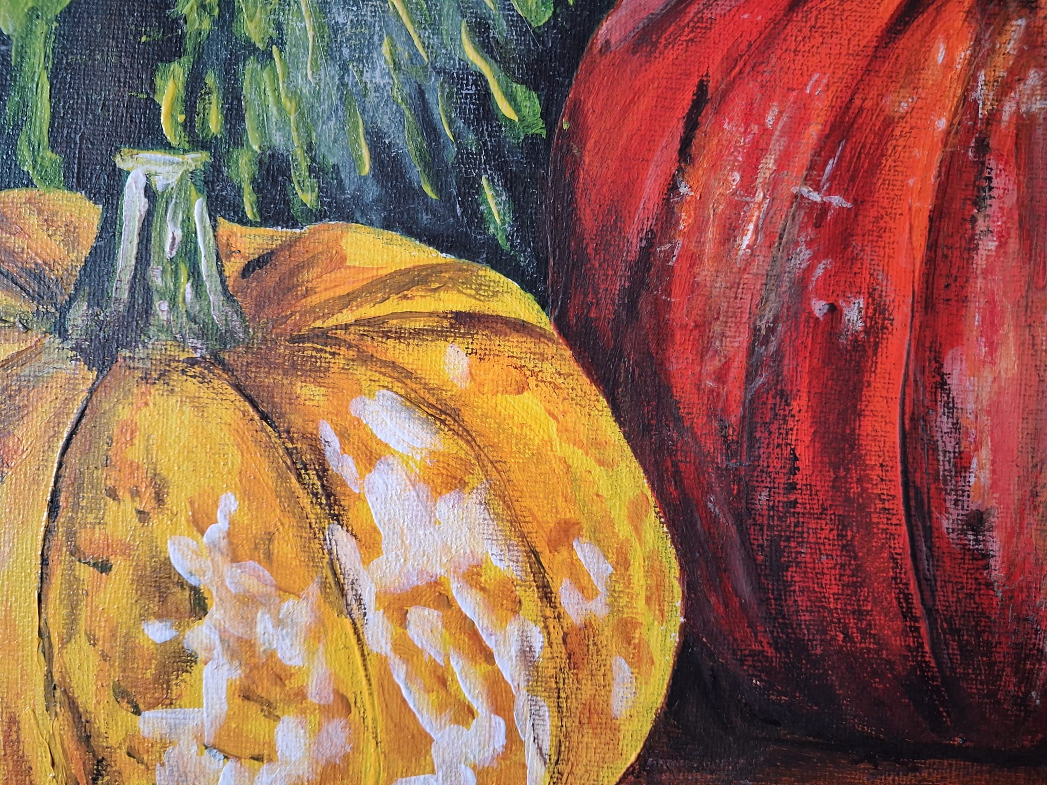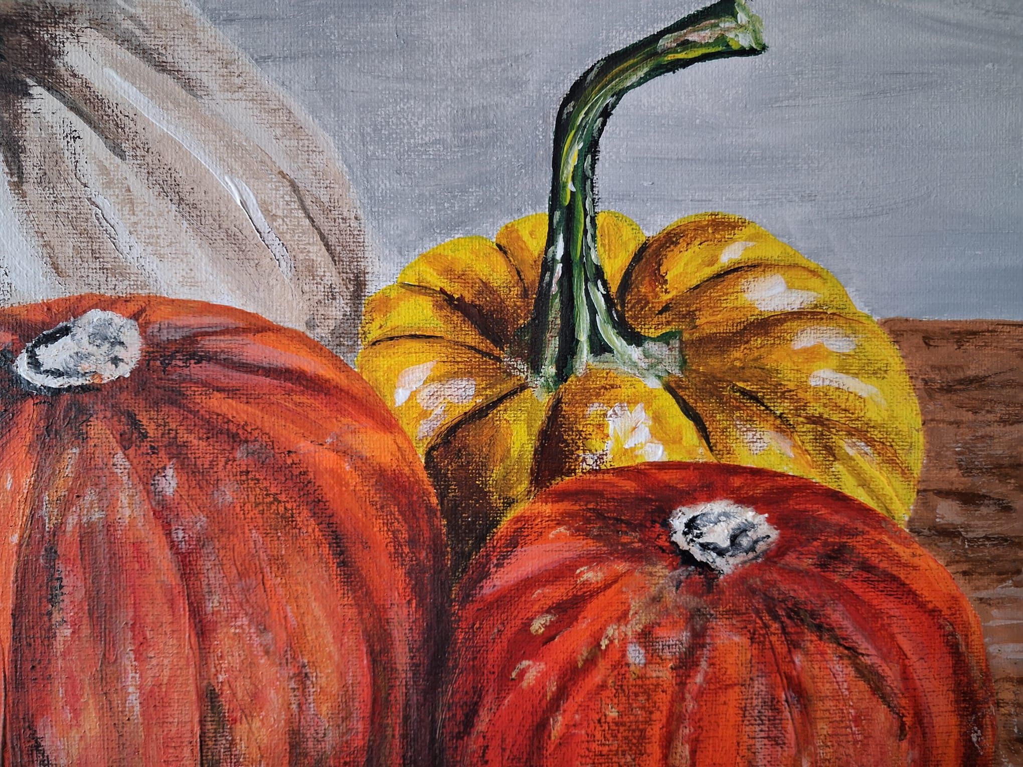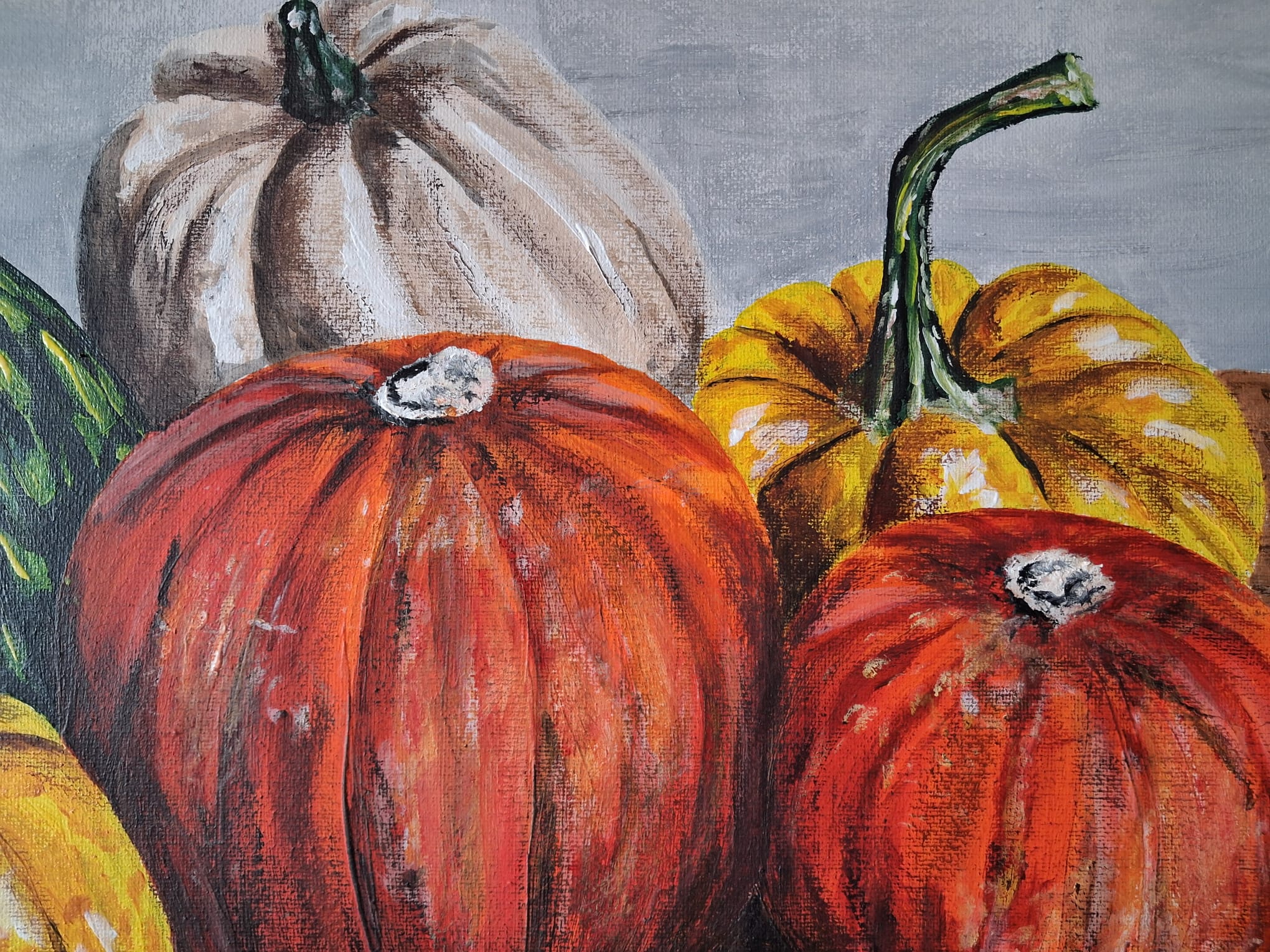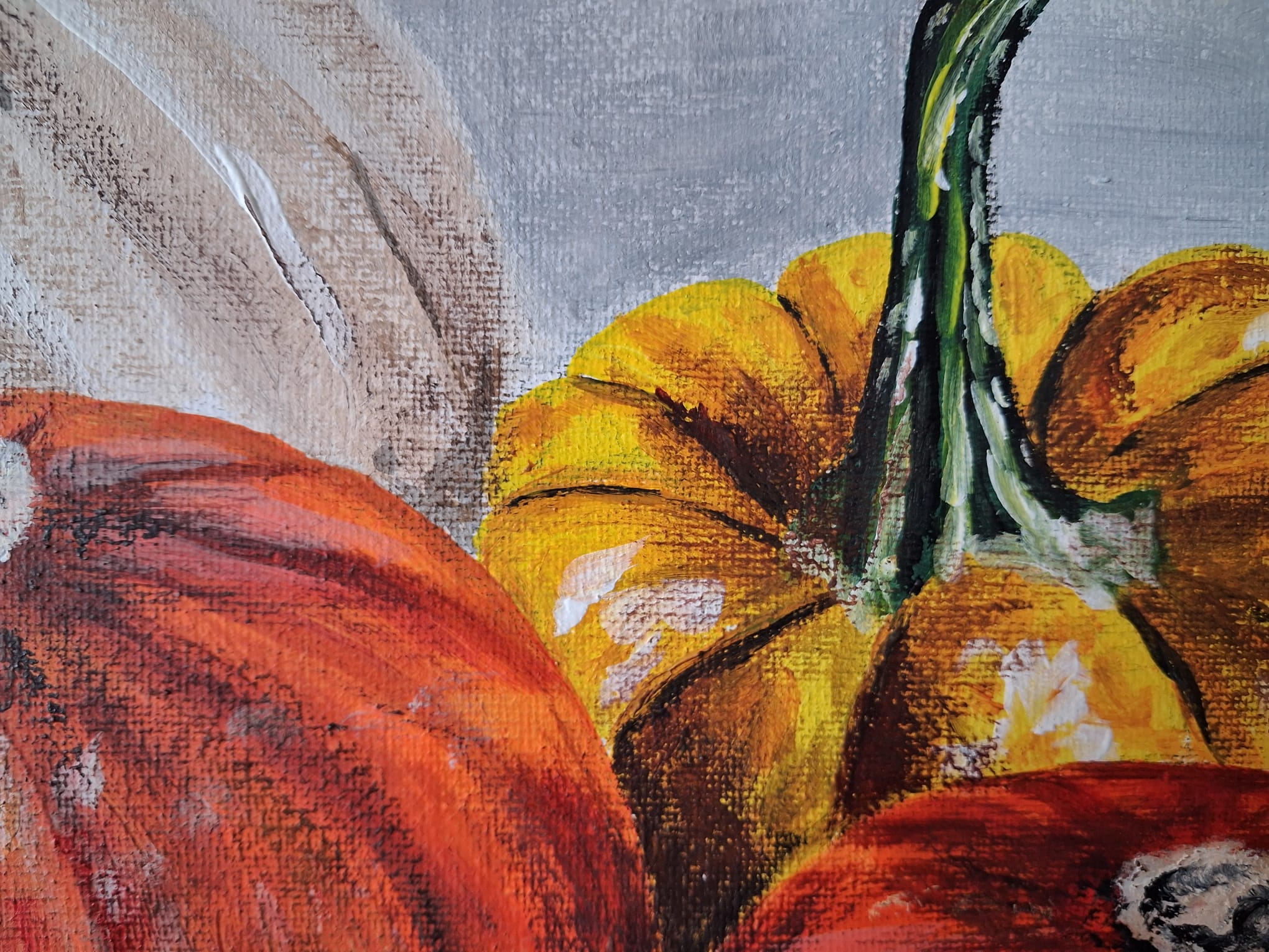 Na obrazie widzimy różnorodne dynie w pełnej krasie jesiennej eksplozji kolorów. Każda z nich ma swój unikalny charakter – od ciemnozielonej z żółtymi cętkami, przez pomarańczowe o głębokim, ciepłym odcieniu, aż po subtelną, niemal eteryczną biel największej. Są ustawione na drewnianym stole, a ich rozłożenie zdaje się być dokładnie przemyślane, by stworzyć dynamiczną, ale i harmonijną kompozycję. Atmosfera tego dzieła jest ciepła i nostalgiczna, jak spokojne popołudnie na wsi. Obraz akrylowy na płótnie. Wymiary: 50 x 40 cm Sygnowany i werniksowany. Bez ramy. Zamalowane boki. Do obrazu dołączony certyfikat autentyczności. Kolory na zdjęciu mogą nieznacznie odbiegać od tych w rzeczywistości. obraz akrylowy na płótnie, ręcznie malowany obraz, martwa natura dynie, obraz jesienny, dekoracja do kuchni, rustykalna sztuka, obraz do jadalni, sztuka współczesna, unikatowy obraz na ścianę, dekoracja do restauracji, ciepłe barwy w malarstwie