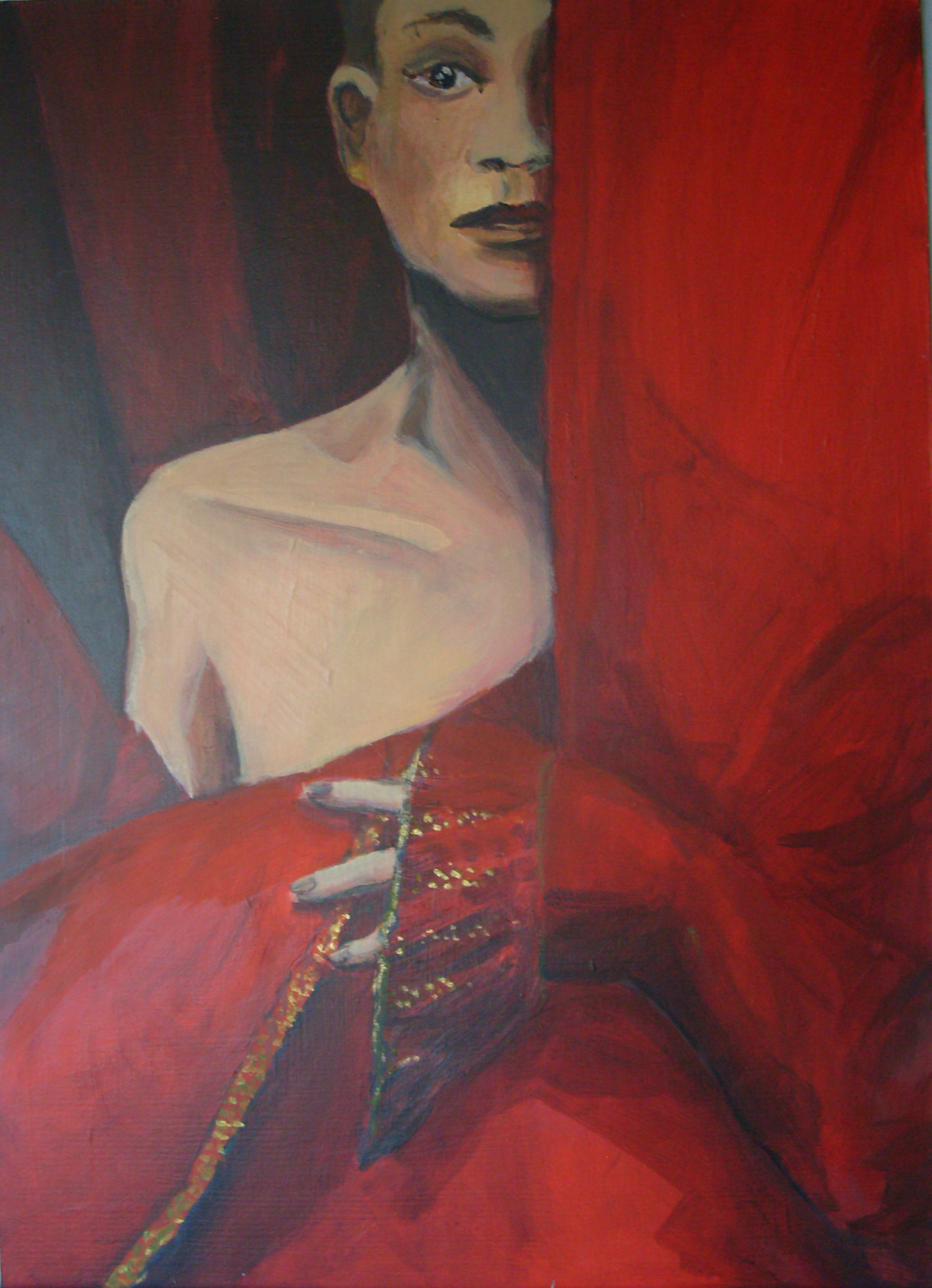 Obraz przyciąga wzrok intensywną czerwienią, która dominuje całą kompozycję. Od razu widać postać, połowę jej twarzy skrytą za kurtyną niby tajemnica nie do odkrycia. Czerwień płynie, wijąc się niczym żywy płomień, a zarazem daje poczucie schronienia. Kolory są ciepłe, ale miejscami przełamane zimnym cieniem, co tworzy nieco mroczny nastrój. Kształty miękkie, płynące, wyraziste. Cholernie intrygujące jest to połączenie światła i cienia, subtelnie prowadzące wzrok ku twarzy, która zdaje się być spokojna, a równocześnie pełna emocji. Styl? Można go odczytać jako impresjonistyczny, lekko tajemniczy, wykorzystujący śmiałe pociągnięcia pędzla. Takie podejście budzi emocje: od żądzy odkrycia do rozmarzenia. Dziecko powiedziałoby pewnie: "Ciekawe, dlaczego się tak schowało?" To obraz, który rozbudza ciekawość i giełka niepewności. Czuje się, jakby malarz chciał powiedzieć więcej, niż pokazuje. Może to echo naszych własnych emocji? Element "mystery" unosi się w powietrzu. Albo to po prostu piękny chaos skrytych emocji? Pełen odniesień do tego, co ukryte w nas samych.