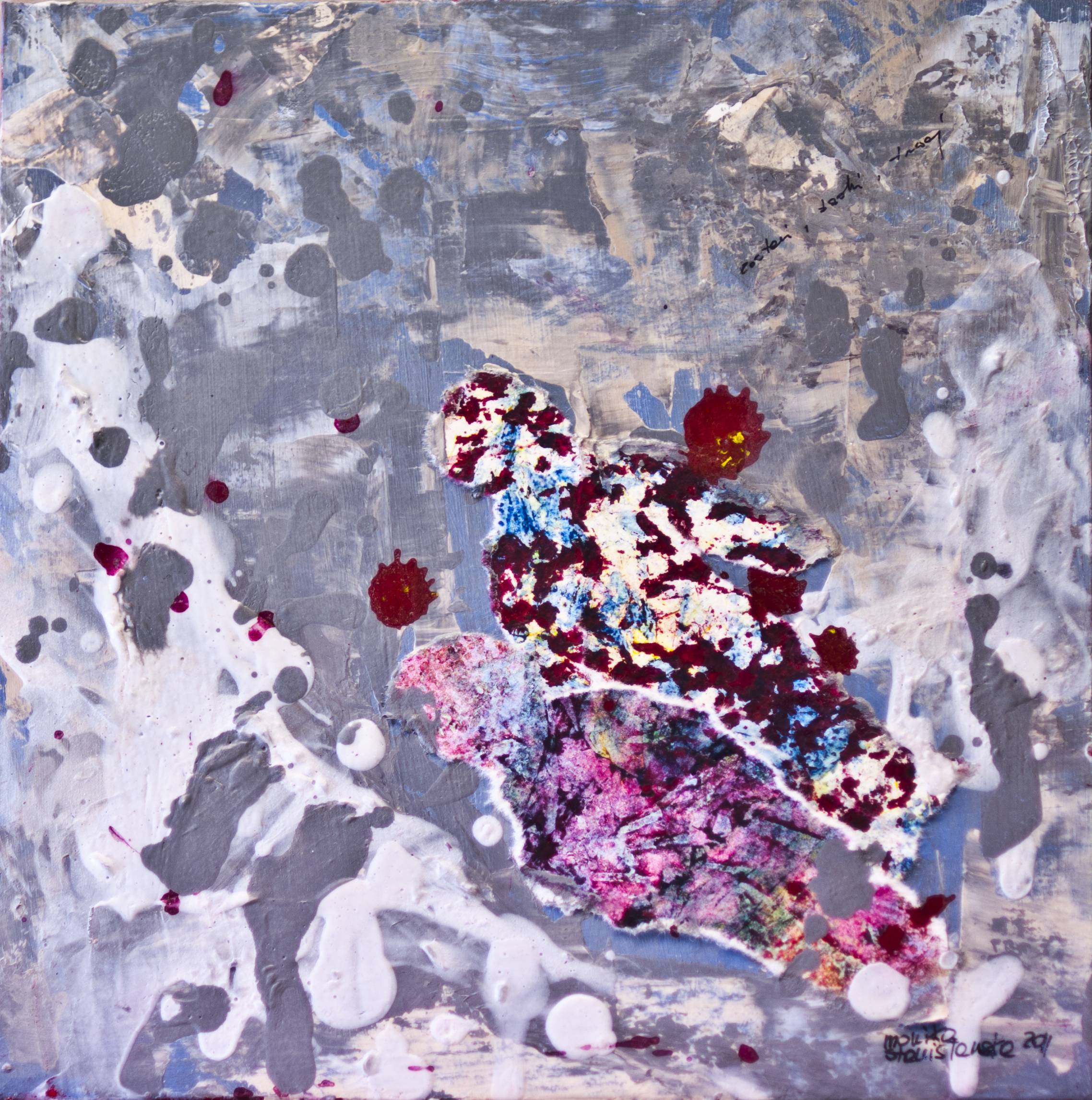 Obraz tętni abstrakcyjną energią i niewątpliwie przyciąga uwagę. Dominują w nim odcienie szarości, które są jak mgła, w którą wtapiają się kryształowe biele i głębokie bordo. Kompozycja wydaje się chaotyczna, ale właśnie w tym tkwi jej urok. Niejednolite kształty przypominające plamy farby wirują i wirują, tworząc dynamiczne wrażenie. Obraz jakby żył własnym życiem, emanuje z niego dynamiczny, trochę tajemniczy nastrój. Techniką dominującą jest impasto, dzięki czemu farba wychodzi z płaszczyzny, tworząc niemal trójwymiarowy efekt. Patrząc na ten obraz, można poczuć się jak w innej, magicznej krainie. "Wow, to jak kosmos z plamkami!" – powiedziałby pewnie 7-latek. Obraz może budzić nostalgię, ale i zachwyt nad chaotycznym pięknem abstrakcji. Dla niektórych może być to pure freedom – wolność wyrażona w sztuce. Widz dosłownie zanurza się w tej enigmatycznej przestrzeni, gdzie każde spojrzenie odkrywa nowe, ukryte warstwy emocji.