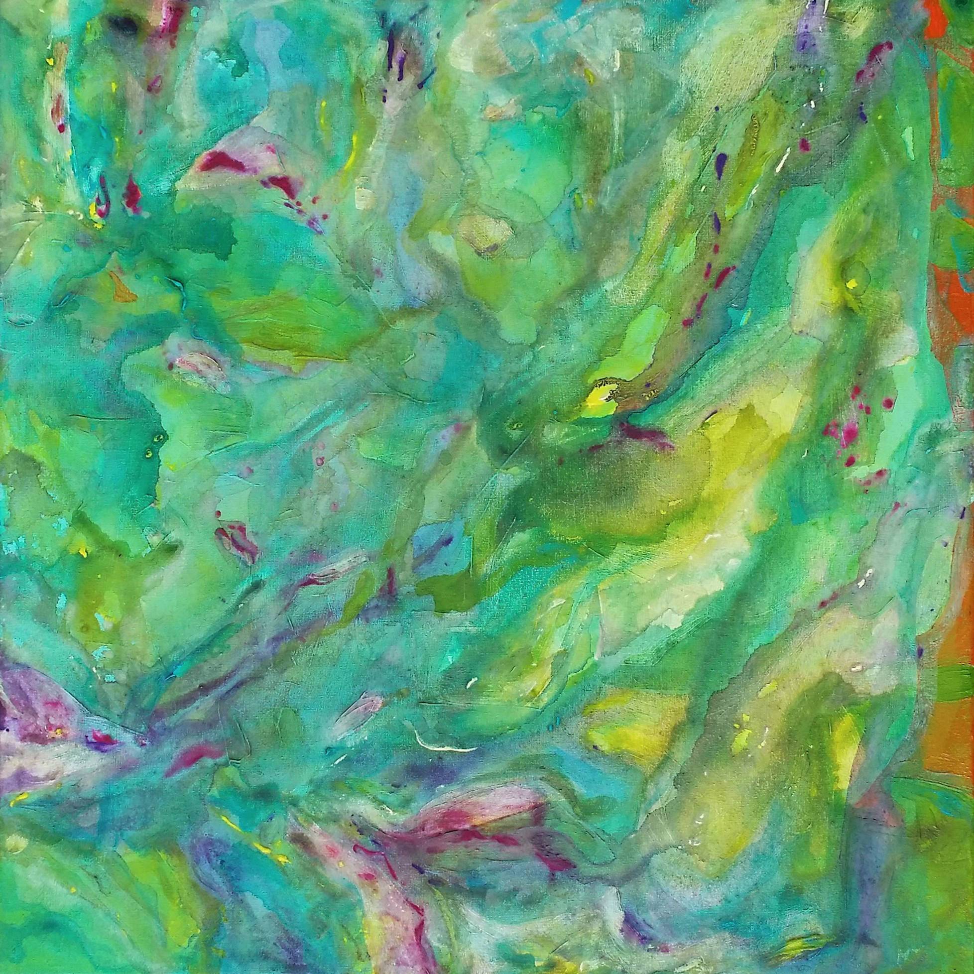 Obraz jest prawdziwym kalejdoskopem barw, gdzie dominują zielenie, turkusy i błękity, przeplatające się z subtelnymi odcieniami fioletu i różu. Kształty są nieregularne, falujące jak płynna masa, tworzące wrażenie ruchu i dynamiki. Kompozycja przypomina podwodny świat, gdzie plamy barw tańczą niczym prądy oceaniczne. Atmosfera jest lekka i świeża, emanująca spokojem, ale też energią. Artystyczny styl można opisać jako abstrakcję, w której dominuje radosna swoboda gestów. Techniki użyte przez artystę zdają się być luźne, jakby twórca pozwolił farbom płynąć naturalnie po powierzchni. Obraz wywołuje w odbiorcy poczucie odkrywania nieznanego, jakby patrzył przez szybkę do nowego, kolorowego świata. Może to być raj dla dziecięcej wyobraźni, pełen kolorowych smoków i magicznych stworzeń. Patrząc na niego, czuję się, jakbym był częścią czegoś większego, jakby znajdował się na dnie oceanu, otoczony przez vibrant life. Czy to nie dziwne, jak sztuka potrafi nas tak porwać? Myślę, że każdy znajdzie w tym obrazie coś dla siebie. Mama mówi, że wygląda jak sen. Malarskie plamy, jakby rozmazane światło wody, niosą ze sobą spokój i ukojenie, a może i obietnicę przygody.