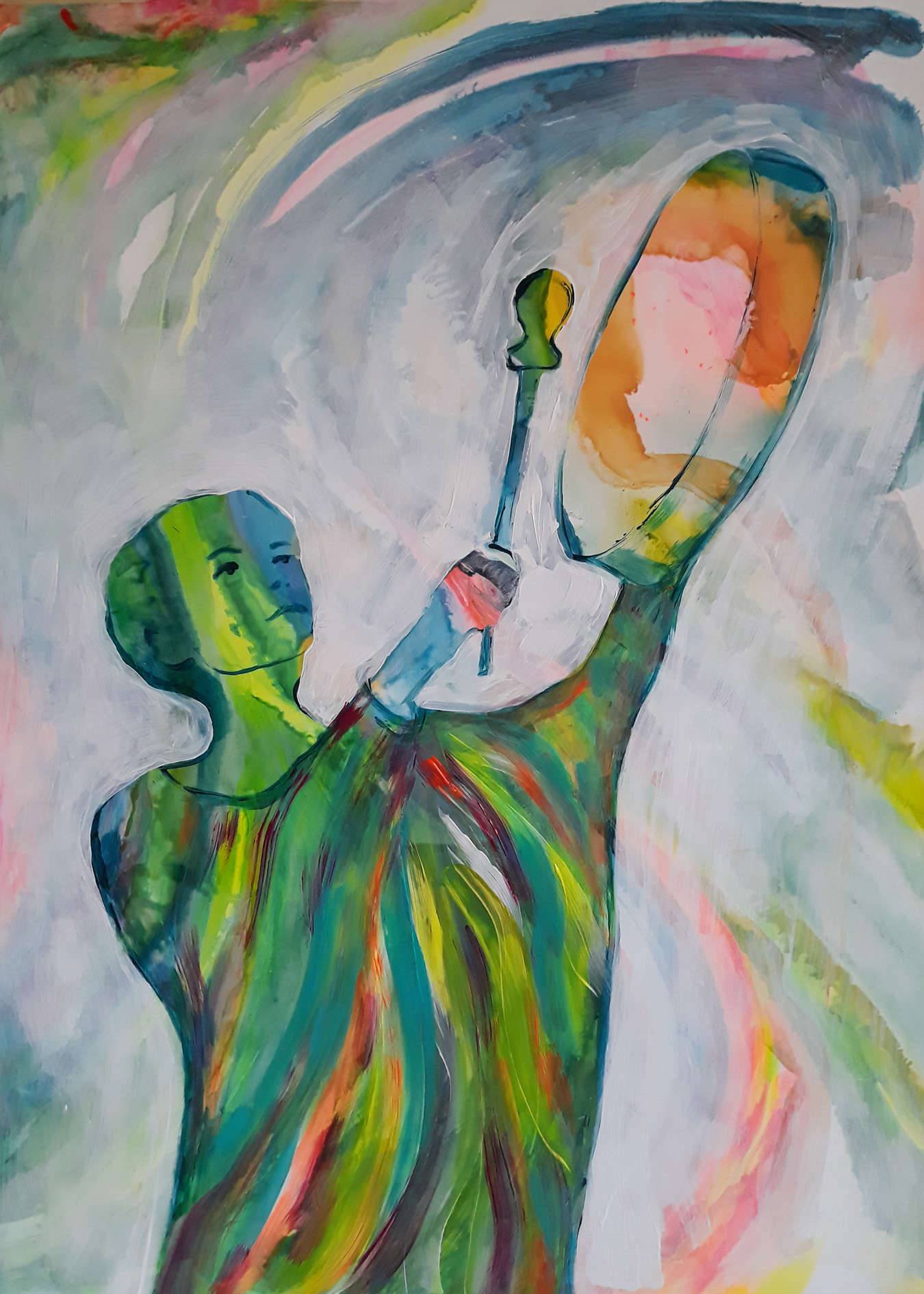 Obraz jest prawdziwą eksplozją kolorów. Dominują zielone i niebieskie odcienie z odrobiną ciepłych pomarańczowych i czerwonych refleksów, które tworzą dynamiczny kontrast. Figury na obrazie są abstrakcyjne, a linie falujące, co nadaje dziełu niemal magiczny charakter. Dzięki temu wydaje się, jakby postać tancerza była w wiecznym ruchu, unosząc się w rytmie niewidocznej muzyki. Tańczące kształty wydają się być osadzone w wirującej przestrzeni, jakby cały świat obracał się wokół nich. Obraz emanuje poczuciem wolności i ekstazy, jakby chciał powiedzieć: "Feel the rhythm!" Artystycznie obraz przypomina dzieła impresjonistyczne, z naciskiem na eksperymentowanie z formą i kolorem. Technika wielowarstwowego nakładania barw nadaje mu głębię i trójwymiarowość, a co za tym idzie, zanurza odbiorcę w swój świat. Zastanawiające jest, jak artysta balansuje między formalnym porządkiem a chaotycznym geniuszem kompozycji. Czuć w tym pewną lekkość, jakby obraz mówił "Ej, po prostu ciesz się chwilą!" Obraz może budzić w człowieku wzruszenie i zachwyt, szczególnie gdy dostrzeże się, jak barwy oddziałują na siebie, tworząc harmonijną całość. Widz czuję się jak podróżnik w nieznanym świecie, pełnym tajemniczych emocji i nieodkrytych historii. Dzieci powiedziałyby pewnie: "O jejku, to jakby ktoś pomalował marzenie!". To dzieło, które wciąga uwagę, tworzy magiczny nastrój i sprawia, że serce bije trochę szybciej.