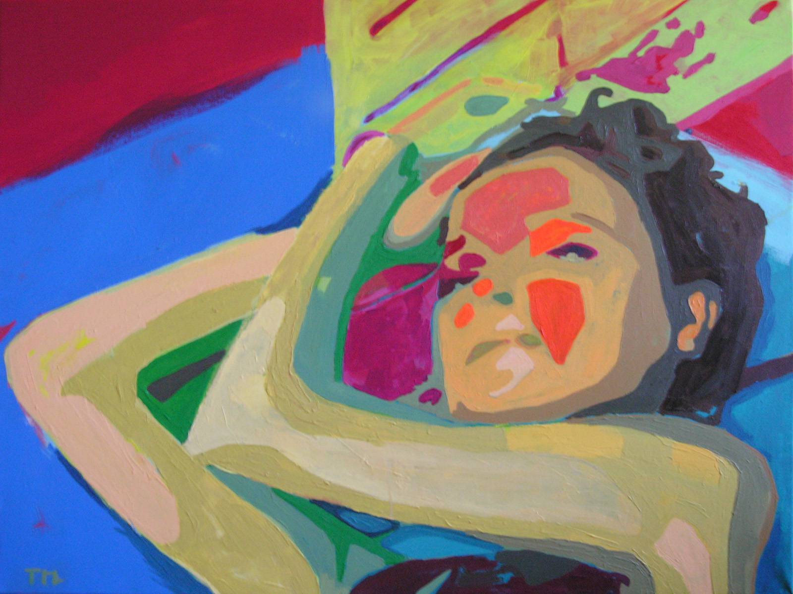 Obraz emanuje feerią barw, gdzie dominują intensywne czerwienie, błękity i zielenie, tworząc żywą mozaikę na płótnie. Postać spogląda lekko w górę, zatopiona w abstrakcyjnym tle. Kontury twarzy są zarysowane mocnymi pociągnięciami pędzla, co nadaje im wyraźny, niemal graficzny charakter. Atmosfera, jakby otulona miękkim kocem nostalgii, emanuje spokojem i delikatnością. Artysta zastosował efekt mixed media, co nadaje obrazu trójwymiarowej tekstury, sprawiającej wrażenie, że niemal można dotknąć poszczególnych warstw. Patrząc na to dzieło, można usłyszeć dźwięk „wow” w powietrzu. Kolory są jak smocze cienie, które tańczą i wirują na wietrze. To wygląda jak magiczny koc! Dzieło może budzić różnorodne emocje, od zachwytu nad śmiałością kolorów po refleksję nad zamyśloną postawą postaci. W tej kompozycji jest coś niezwykle kids-friendly, jakby obraz mówił do nas wprost. Czuć tu swobodę interpretacji i uchwycenie chwili, która wydaje się być zarazem dynamiczna i statyczna. Z każdym spojrzeniem ukazuje coś nowego, co zaklina widza do pozostania na dłużej. Magic!