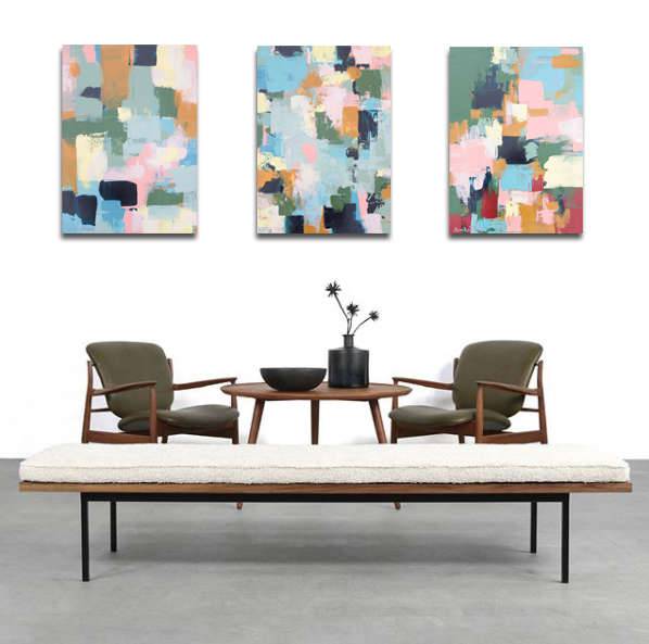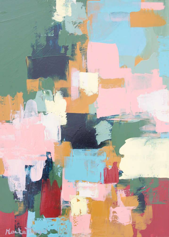 Obraz to prawdziwa eksplozja kolorów. Mamy tu subtelne róże i błękity, przeplatane mocnym pomarańczem i zielenią. Kolorowe plamy tworzą nieskończoną mozaikę, pełną chaosu, ale też dziwnego porządku. Takie połączenie, niczym układanka bez końca. Kompozycja jest nieformalna, z lejącymi się płaszczyznami, które zdają się płynąć po powierzchni. Atmosfera jest lekka, ale też dość dynamiczna – jakby migawką uchwycono moment w ruchu. Trochę to jak skok do basenu w upalny summer day. Artysta wykorzystał technikę impasto, z warstwami farby nałożonymi grubymi pociągnięciami. Styl abstrakcyjny przywodzi na myśl spontaniczność i wolność ekspresji. Emocje? Oj, budzi się w człowieku chęć do refleksji, poszukiwania znaczeń. Może to być radość, może zamyślenie nad złożonością życia. Trochę jak bałagan w głowie, ale przyjemny. A jakby to zobaczyło dziecko? "Ojej, to wygląda jak wielkie klocki Lego rozsypane na podłodze!" Zaskakująco szczera refleksja. Obraz jest pełen życia, bawi się kolorami i formą. Pozwala odbiorcy na momenty zatrzymania, chwilę zapomnienia o codzienności. Świetne energy, które przyciąga i angażuje.