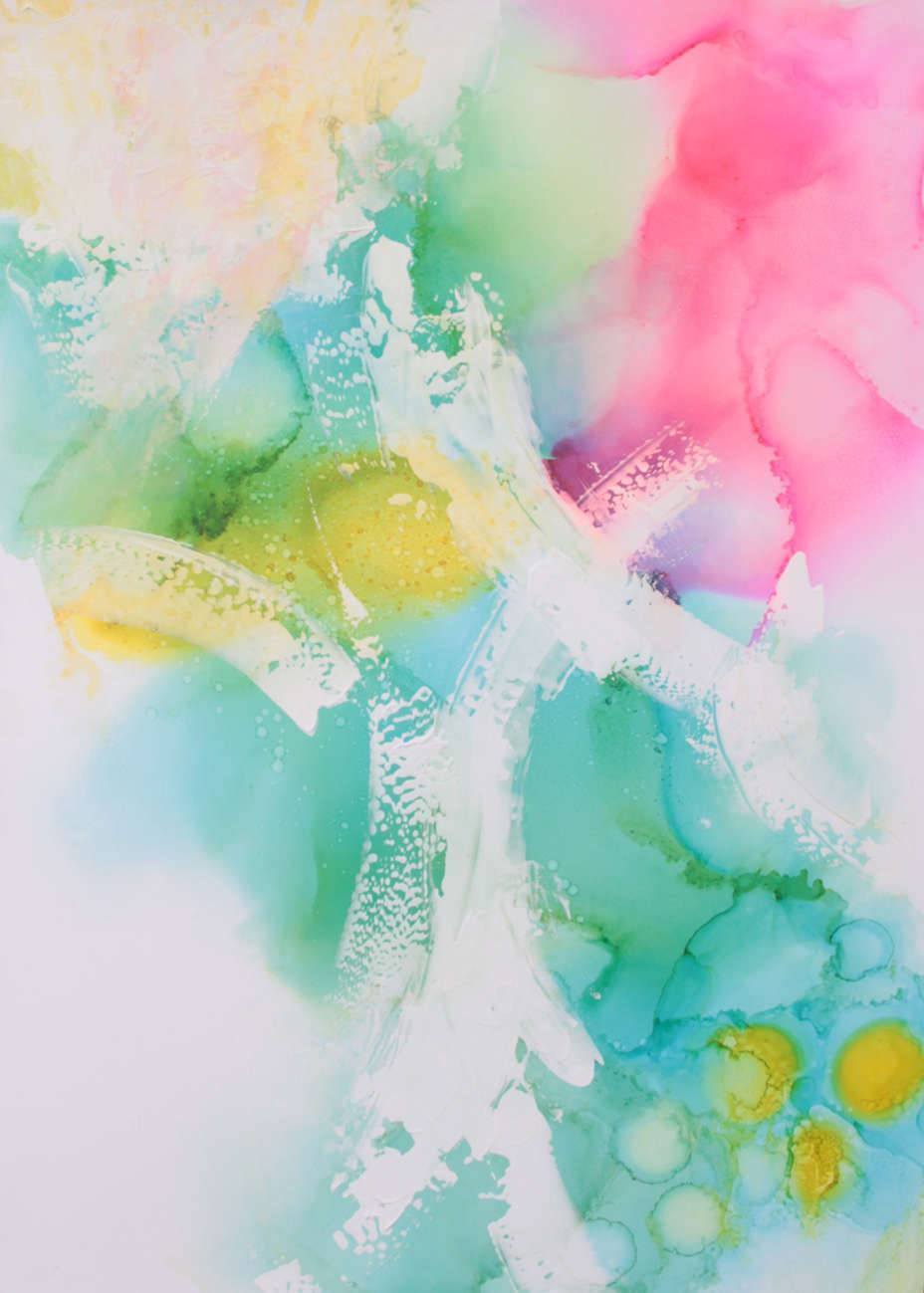 Na obrazie dominują pastelowe kolory, które tworzą subtelną, aczkolwiek dynamiczną kompozycję. Plamy różu, zieleni i błękitu mieszają się ze sobą, przypominając delikatne pociągnięcia pędzla na akwarelowym tle. Żółte akcenty tworzą koncentryczne kształty, dodając energii temu spokojnemu krajobrazowi. Niby chaos, a jednak wszystko tu do siebie pasuje. Atmosfera obrazu emanuje spokojem i beztroską. Jakbyś patrzył na coś szczególnego, ale jednocześnie całkiem przyziemnego. Może to zasługa lekkości barw, które wydają się unosić w powietrzu. Całość przypomina senne marzenia lub letni poranek, kiedy czas płynie wolniej. Artystycznie, artysta zastosował technikę rozwodnionych farb, co daje efekt płynnego przejścia między kolorami. Czuć tu intuicyjność i głęboki spokój, jakby artysta malował to, co mu w duszy grało. Interpretując obraz, można pomyśleć o przyjaźni barw i harmonii. Każdy znajdzie tu coś innego. Dzieci powiedziałyby: „To jak bajka!”. Dla dorosłych być może przypomnienie o potrzebie równowagi w życiu. Ten image zachęca do refleksji nad prostotą w sztuce i w nas samych.