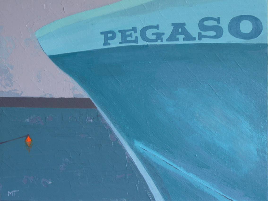 Na obrazie widzimy fragment statku z dominującym kolorem błękitu i napisem "PEGASO" dumnie widniejącym na jego burcie. Całość jest utrzymana w spokojnych tonacjach niebieskiego, co tworzy harmonijną i przemyślaną kompozycję. Kiedy patrzysz na ten obraz, przywodzi na myśl uczucie ciszy i spokoju morskiej podróży. Trochę jakbyś siedział na pomoście z wiatrem we włosach. Artysta zastosował technikę, która przypomina nieco mural, z grubymi pociągnięciami pędzla. Mogło by się zdarzyć, że skłoni cię to do refleksji o samotnych wyprawach i przygodach. Obraz wywołuje we mnie nostalgiczne wspomnienia z dzieciństwa. "Moi i starszy brat budowali kiedyś takie statki w piaskownicy!" Taki jest właśnie jego urok, że zdaje się wywoływać emocje na różne sposoby. Myślę sobie, że nawet dzieciak mógłby spojrzeć na ten statek i po prostu uznać go za cool. Bo jest w nim coś nieuchwytnego, co pobudza wyobraźnię. W odbiorcy może wzbudzać uczucie marzeń o dalekich podróżach. Trochę mystery, ale i nadzieja na nowe przygody.