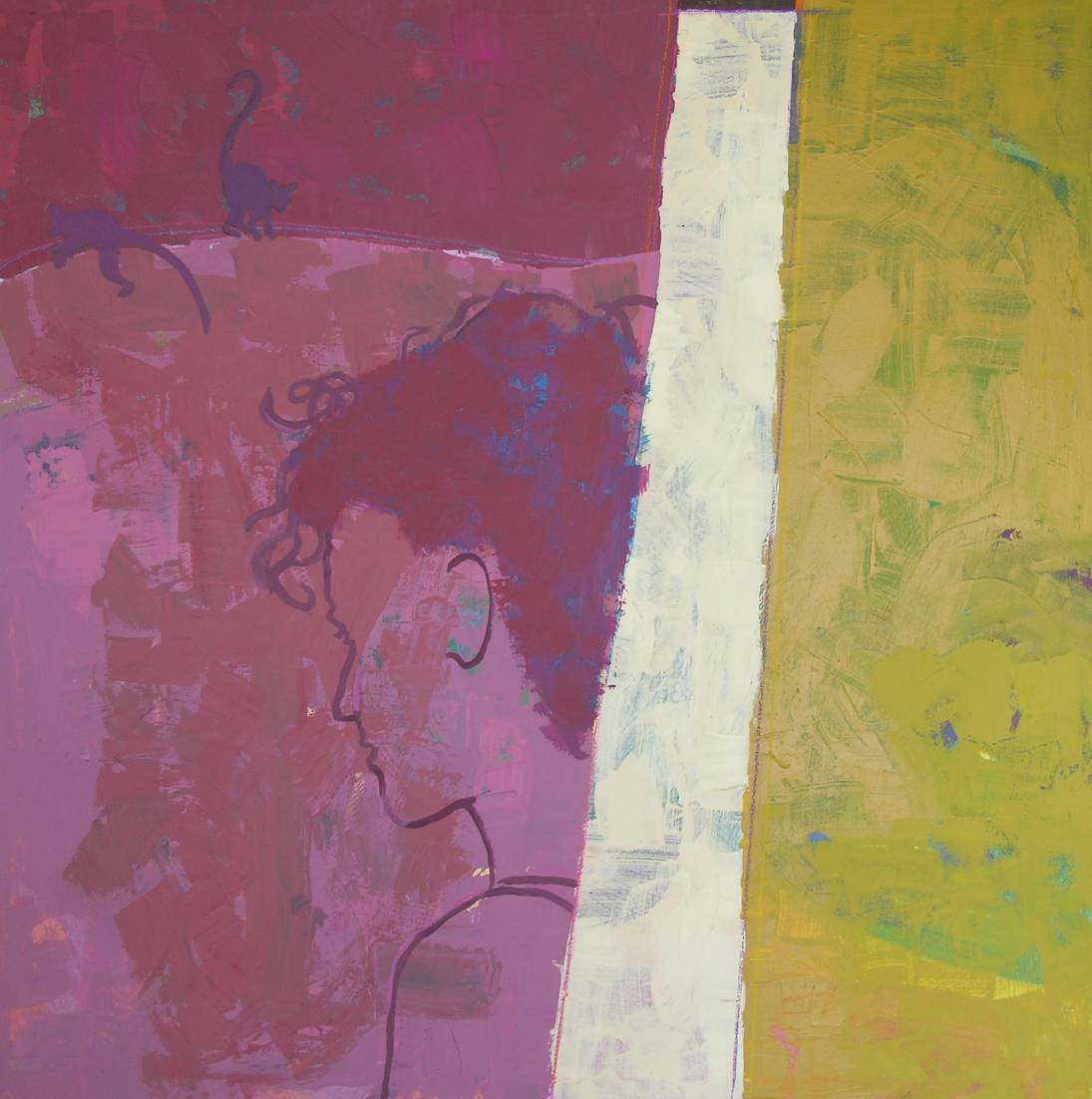 Obraz przyciąga uwagę swoją niecodzienną kompozycją i intensywnymi kolorami. Po lewej stronie dominuje głęboki fiolet, łagodnie przechodzący w różowe niuanse. Linie tworzące sylwetkę osoby są delikatne, niemalże eteryczne, jakby same się rozpływały w tle. Napotykamy tu coś w rodzaju kontrastu – po lewej stronie chaos, po prawej spokój. Jasny pas bieli oddziela te dwie sfery jak swoista kurtyna między snem a jawą. Prawa część obrazu zaskakuje zieleniną, emanującą spokojem i świeżością. Nastrój obrazu jest niejednoznaczny i tajemniczy. Przywodzi na myśl ulotne chwile zamyślenia czy nostalgicznych refleksji nad codziennością. Technika, której użył artysta, to swobodna gra barwą i formą. Można by powiedzieć – taki trochę freestyle. Na pewno nie trzymał się kurczowo linijki i ekierki. Sylwetka osoby? Czysta ekspresja, a równocześnie oszczędność środków. Spoglądając na to dzieło, można odnieść wrażenie, że dotykamy czułych strun ludzkiej psychiki. Czy to nostalgia? Tęsknota za dzieciństwem? „O, to bardzo ładny kolorowy kociak!” - powiedziałoby dziecko. Może to przypomnienie pewnych chwil, które tak łatwo umykają z pamięci. Obraz wywołuje w nas mieszankę emocji – od melancholii po spokój. Daje poczucie bycia w dwóch miejscach naraz. Jednym słowem: fascinating.