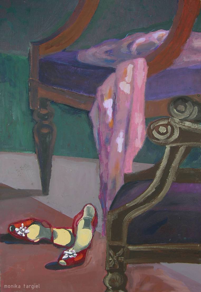 Na obrazie widać elegancki fotel obity purpurową tkaniną, ustawiony w prawym rogu kompozycji. Na jego ramie niedbale spoczywa jasnoróżowy szal, który dodaje całości nuty ulotnej delikatności. Na podłodze leżą czerwone pantofelki z białymi kwiatowymi ozdobami, które przyciągają wzrok swoim kontrastowym akcentem. Kolory są przytłumione, ale z nutą głębokości, co nadaje scenie nostalgicznego uroku. Można poczuć cichy spokój późnego popołudnia, jakby miejsce to zapraszało do chwilowego wytchnienia. Styl obrazu przypomina impresjonistyczne podejście, z miękkimi konturami i subtelnym grą światła i cienia. Technika zamiatania pędzla sprawia, że tkaniny wydają się miękkie i dotykalne. Obraz emanuje ciszą, ale też pewną tęsknotą. Czy ktoś tu niedawno był? Czy to echo minionej chwili radości? Dla kogoś, ta scena może być jak „mój postój na kropelkę marzenia”, gdzie codzienność ustępuje pola dziecięcej fantazji. Pantofelki wyglądają jak te, które mogłaby założyć Disney princess. To miejsce zachęca do refleksji o przemijalności chwili. W sumie, nie mogę przestać myśleć o tym, jak piękna prostota przedmiotów potrafi mówić „story” o uczuciach.