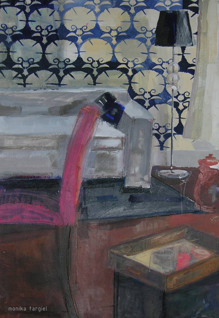 Obraz jest pełen kontrastów. Dominują w nim stonowane odcienie szarości, przełamane żywym różem krzesła i głęboką niebieskością tapety. Na pierwszym planie widzimy prosty stolik, na którym spoczywa kilka przedmiotów, jakby czekających na użycie. Tapeta w tle wyróżnia się ciekawym, powtarzalnym wzorem przypominającym symetryczne motywy geometryczne. Patrząc na ten obraz, czujemy się jak w salonie, który zatrzymał się gdzieś w czasie. Co za ciekawa aranżacja! Atmosfera jest zagadkowa i nieco nostalgiczna. Wydaje się, jakby pomieszczenie ukrywało jakąś tajemnicę sprzed lat. Artystka zastosowała technikę malarstwa akrylowego, co nadaje powierzchniom delikatną teksturę i głębię. Obraz może wywoływać u odbiorcy skojarzenia z domowym ciepłem, ale także z chwilą zatrzymaną w czasie, pełną refleksji. Można poczuć się trochę jak na old-schoolowej pocztówce z dawnych lat. Dla mnie osobiście to takie "cozy place", gdzie chciałabym napić się porannej kawy. Hej, mama! To jest fajny pokój, tak myślę. Subtelne zestawienie kolorów z dynamicznym akcentem sprawia, że całość jest i intrygująca, i kojąca zarazem. Dzięki temu dzieło przyciąga wzrok i pobudza wyobraźnię, zapraszając na chwilę refleksji.