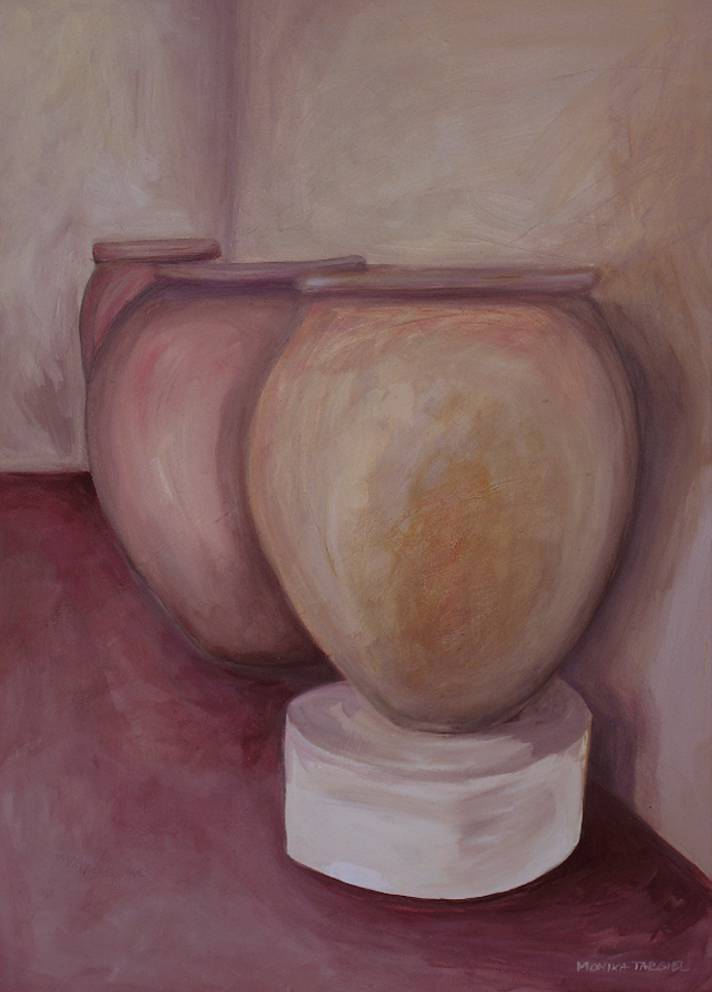 Obraz przedstawia dużą glinianą wazę, dumnie stojącą na białej podstawie. Kolory są stonowane i ciepłe, dominują beże i subtelne róże. Tło lekko rozmyte, tworzy delikatny kontrast dla gładkiej powierzchni naczynia. Kompozycja wydaje się prosta, ale przemyślana, z wazą ustawioną w centrum uwagi. Ten obraz emanuje spokojem jak niedzielny poranek. Praca artystyczna sugeruje użycie technik impresjonistycznych, gdzie miękkie pociągnięcia pędzla ożywają w subtelnych refleksach światła. To takie jakby waza była bohaterem opowieści, którą każdy widz może snuć na swój sposób. A teraz to jedno magiczne słowo: tranquility. Dzieciak mógłby powiedzieć: "Ta waza jest jak wielki, magiczny garnek na zupę". Obraz budzi nostalgię, sprawiając, że przypominamy sobie o prostocie i pięknie codziennych przedmiotów. Patrząc na niego można nabrać ochoty na chwilę refleksji, zatopić się w myślach o pojedynczych chwilach, które uczynią dzień wyjątkowym.