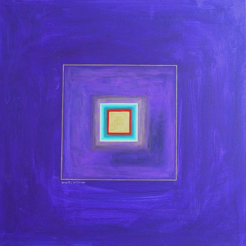 Obraz to prawdziwe arcydzieło geometrii i koloru. W centrum kompozycji znajduje się seria kwadratów, jeden wewnątrz drugiego. Dominuje kolor purpury, przechodzący przez odcienie od głębokiego fioletu na zewnątrz do jaśniejszego, niemalże święcącego pomarańczu w samym środku. Pośrodku powoli rozświetla się błękit, który stopniowo przechodzi w jasną biel, jakby prowadził do tajemniczego wnętrza obrazu. Całość zdaje się przyciągać wzrok do centralnego punktu, tworząc efekt głębi i przestrzeni. Atmosfera tego dzieła jest spokojna, ale i lekko zagadkowa. To jak patrzenie w kosmiczną otchłań, która jednocześnie intryguje i uspokaja. Nastrój obrazu przypomina senne marzenia, w których granice rzeczywistości stają się płynne. Artysta zgrabnie bawi się kolorem, używając subtelnych przejść tonalnych, by stworzyć wrażenie ruchu i dynamiki. Styl obrazu jest nowoczesny, minimalistyczny. Można by powiedzieć, że to inny wymiar abstrakcji. Technika opiera się na precyzyjnych liniach i płaskich plamach koloru. Niby proste, a jednak nie sposób oderwać wzroku. To obrazy przemawiający do serca, a nie tylko do oczu. Obraz wywołuje cały wachlarz emocji. Dla jednych może być synonimem harmonii, dla innych – zaproszeniem do medytacji. Ktoś się może poczuć jak w magicznym pokoju z bajki. Myślę, że to art na najwyższym poziomie. To trochu jak patrzeć w kalejdoskop. Coś niby zwykłego, ale za każdym razem zaskakuje. Ciekawe, co by pomyślało 7-letnie dziecko? Może powiedziałoby po prostu: "To jak światło w ciemnym tunelu!". I miałoby rację.
