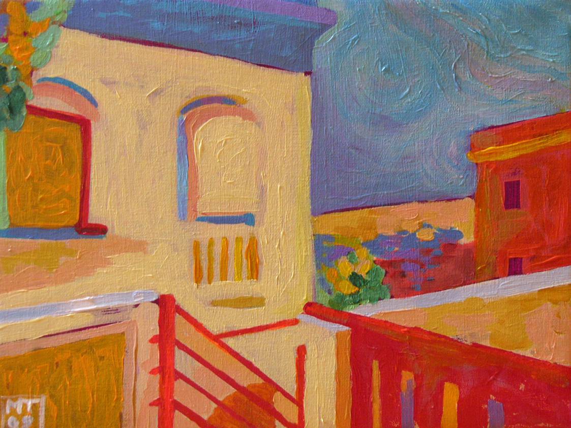 Obraz zachwyca feerią żywych kolorów. Dominuje ciepła żółć budynku, który delikatnie sąsiaduje z intensywną czerwienią i pomarańczem. Te barwy tworzą dynamiczną kompozycję, przełamaną chłodnym błękitem nieba. Artysta zastosował technikę impasto, co dodaje dziełu trójwymiarowości. Również widoczna faktura pociągnięć pędzla wprowadza ruch do statycznej sceny. To malarska gra światła, która może przypominać letni dzień pełen słońca. Patrząc na ten obraz, czuję coś w rodzaju nostalgii. Nastrój jest zdecydowanie pogodny, choć z nutą tajemnicy. Jakby to była scena z odległych wspomnień lub marzeń. Styl artystyczny, przypominający trochę impresjonizm, przenosi odbiorcę w świat dziecięcej fantazji. "To taki dom, gdzie zawsze świeci słońce!" Wzór na niebie, jakby lekko wirujący, dodaje mu odrobiny magii. To miejsce, gdzie chciałoby się zamieszkać. Kolory są vibrant i wpływają na radość z samego oglądania. To dzieło skłania do refleksji, ale i po prostu cieszy oko.