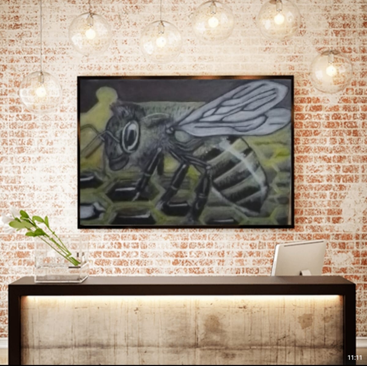 Na obrazie widzimy wielką pszczołę, która przypomina precyzyjnie rozrysowaną mozaikę. Kształty skrzydeł delikatne jak pierwsze podmuchy wiosny, a tułów pszczoły lśni ciemnymi barwami na tle złocistych plastrów miodu. Ogół kompozycji przyciąga uwagę, emanując spokojem i ciepłem, zupełnie jak leniwe popołudnie na łące. Ściana za obrazem – surowa, ceglasta, dodaje industrialnego charakteru, który kontrastuje z naturalnym pięknem pszczoły. Mówiąc bardziej technical, artysta użył mieszanki technik malarskich i rysunkowych, co nadaje dziełu unikalny wygląd. Poprzez tę grę światła i cieni, obraz przywołuje uczucia komfortu i nostalgii. Patrząc na niego, wyobrażam sobie szum pszczół i smak słodkiego miodu. To jest świetne, bo przypomina nam o pięknie prostoty. A lampki wiszące nad obrazem tworzą przytulną atmosferę, jak w moim ulubionym "cozy" kącie domu. Moje, jako dorosłego, spojrzenie dostrzega tu geniusz w sposobie, w jaki cienka linia oddziela światło od cienia. Mama mówi, że pszczółki są bardzo pracowite. Może obraz ma nam przypominać, jak ważna jest harmonia pracy i natury. W A jednym słowem, to czysta magia na płótnie.