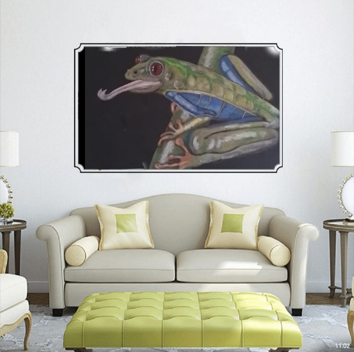 Obraz przedstawia niezwykle barwnego, egzotycznego jaszczura, którego ciało pokryte jest soczystymi odcieniami zieleni, błękitu i brązu. Wkomponowany perfekcyjnie na tle ciemnego tła, zwierzę wydaje się wyskakiwać z obrazu, przyciągając uwagę swoimi intensywnymi czerwonymi oczami. Jest coś magicznego w tej kompozycji, coś co sprawia, że czujemy się jakbyśmy tajemniczo zaglądali do innego świata. Atmosfera jest pełna napięcia, jak w momencie zaraz przed burzą. Artystyczny styl wydaje się inspirowany surrealizmem, z domieszką realizmu, a technika wykorzystująca intensywne kontrasty kolorystyczne przywodzi na myśl klasyczne pastelowe prace. Obraz budzi w nas mieszankę podziwu i niepokoju, daje poczucie obcowania z czymś magicznym. Mała żabka na obrazie mogłaby mówić "patrz, jak daleko potrafię skoczyć!". To feeling when widzisz ten obraz – jest jak chłodny powiew w letni dzień. Patrząc na ten jaszczur zastanawiam się, jakie historie skrywa jego świat. Użycie ciemnego tła sprawia, że wydaje się być z innej bajki. Może trochę się boję tej tajemniczej, ale jednocześnie czuję dziecięcą radość z odkrywania nieznanego.