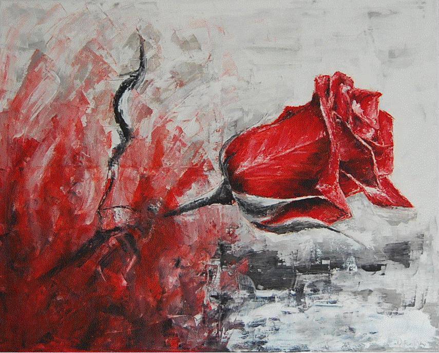 Obraz namalowany szpachlą w technice olejnej. Werniksowany. Płótno jest na blejtramie więc obraz nie wymaga oprawy. Boki zostały zamalowane. "Róża w płomieniach" świetnie komponuje się w nowoczesnych wnętrzach. Na żywo wygląda jeszcze lepiej jak na zdjęciu.