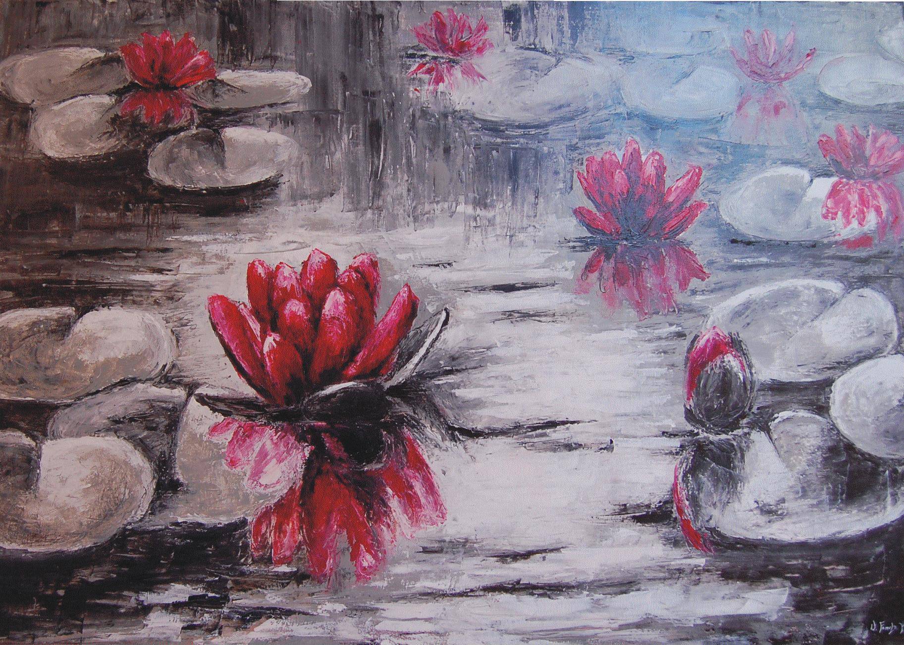 Obraz jest pełen subtelnych kontrastów i magii. Wyraźnie widać na nim intensywnie czerwone lilie wodne, które unoszą się na srebrzystym tle spokojnej wody. Kolory są żywe, niemal krzyczące, a jednocześnie pozostają w harmonii z otaczającym ich delikatnym szaro-niebieskim krajobrazem. Kompozycja jest przemyślana, z liliami rozmieszczonymi wzdłuż powierzchni, co nadaje obrazowi balans. Atmosfera obrazu jest spokojna i kontemplacyjna. Cisza tego miejsca jest niemal namacalna, jakby czas stanął w miejscu. Obraz emanuje uczuciem spokoju, ale także nostalgii za chwilą, która nigdy nie przeminie. A te kolory... wow. Czerwone lilie to prawdziwa eksplozja w tym spokojnym świecie, dodają dynamizmu i życia. Styl artystyczny, którym posłużył się twórca, łączy delikatne pociągnięcia pędzla z wyraźnym akcentowaniem detali. Dzięki temu obraz ma niemal impresjonistyczny charakter, a jednocześnie jego elementy są czytelne i precyzyjne. Techniki, jakimi operuje artysta, sprawiają, że obraz zyskuje głębię i strukturalność. Dla mnie to wygląda jak scena z bajki, miejsca, gdzie lilie szepczą sekrety. Może więc to opowieść o pięknie ukrytym w codzienności? Obraz pobudza wyobraźnię i zachęca do refleksji nad ulotnością chwili. I to jest piękne, po prostu beautiful.
