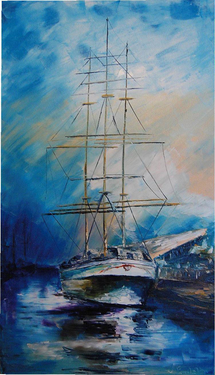 Obraz przedstawia majestatyczny żaglowiec zacumowany przy spokojnym nabrzeżu. Dominujące niebieskie i błękitne barwy nieba płynnie przechodzą w odbicie w wodzie, nadając całości chłodny, spokojny ton. Subtelnie zaznaczone kształty chmur sugerują delikatny wiatr. Sama kompozycja obrazu przyciąga wzrok centralnie umieszczoną sylwetką statku, której smukłe maszty sięgają do nieba, sugerując dążenie do nieskończoność. Atmosfera dzieła jest niezwykle nostalgiczna, niemal jakby czas się zatrzymał na chwilę. Malarskie pociągnięcia pędzla są dynamiczne i expressivo, co nadaje całości lekkość, a zarazem pewną tajemniczość. Technika impasto, widoczna w wypukłościach farby, dodaje tekstury i głębi. Obraz może wzbudzać różnorodne emocje; jedni poczują spokój i ukojenie, inni może tęsknotę za podróżami i przygodami. Jak mawiał jeden maluch: “To jest statek piracki, co płynie po chmurach!” W tej niepewności i marzycielstwie kryją się uroki takich morskich scenerii. Zastanawiam się, jakie historie mógłby opowiedzieć ten statek, stojący w jakby wiecznym oczekiwaniu. Ten element skłania do refleksji nad mijającym czasem. Czyste "blues" na obrazku zdaje się śpiewać o wolności i spokojnych wodach.