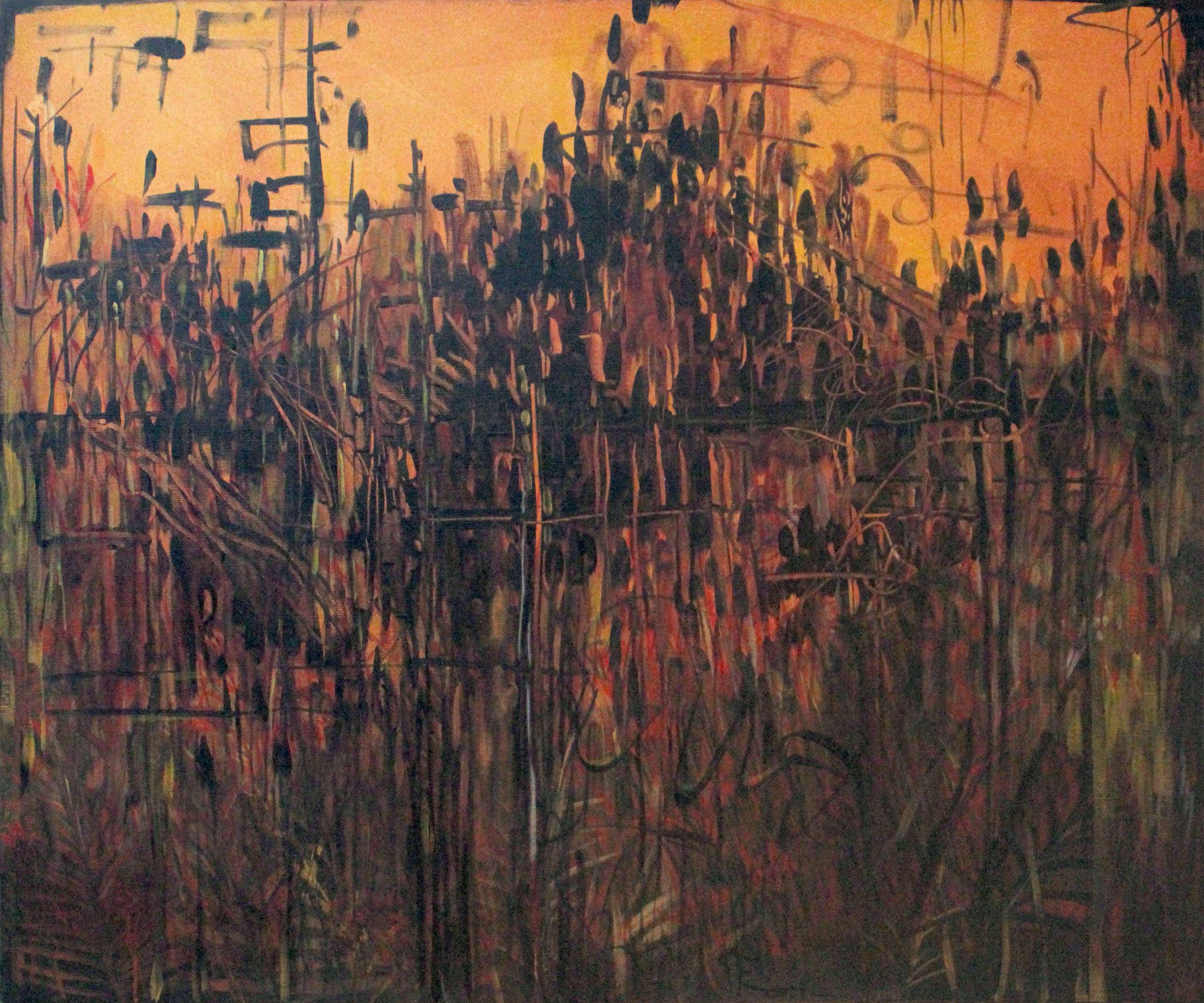 Oilfield, pejzaż po-przemysłowy. Przedstawia zapomniany już, zarośnięty, przejęty przez naturę krajobraz dawnej kolebki przemysłu naftowego w Beskidzie Niskim. Obraz nie posiada ram
