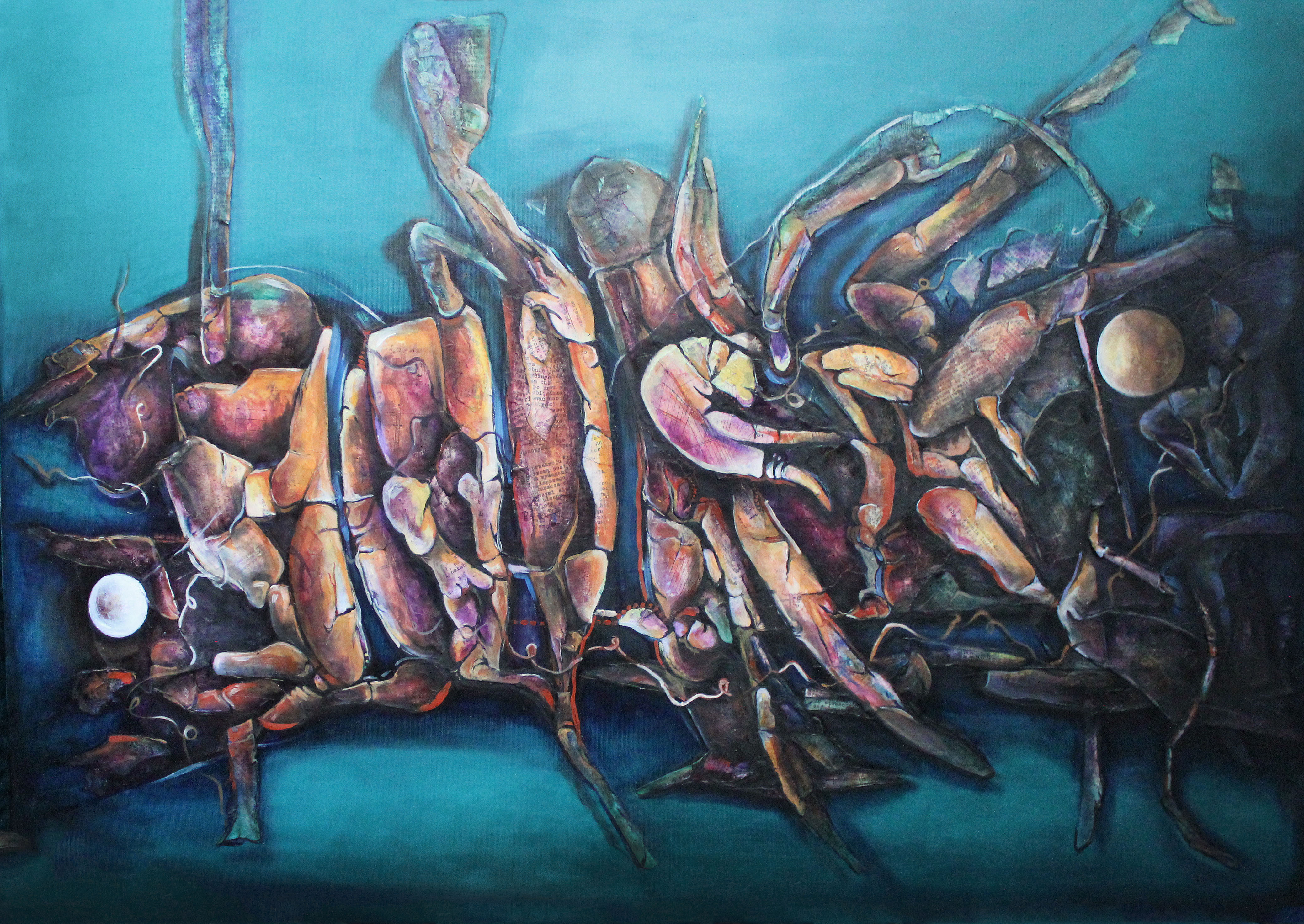 Na obrazie dominują odcienie turkusu i fioletów. Połamane kształty zdają się tańczyć w rytmie, tworząc dynamiczną kompozycję . Obraz wywołuje emocje ciekawości i zadumy. Można poczuć się jak detektyw, który próbuje rozwikłać dziwaczną zagadkę. W oglądającym dzieło budzi się potrzeba interpretacji, a może nawet stworzenia własnej historii związanej z tym, co widzi. To niesamowite, jak artysta potrafił zamknąć tak wiele emocji w jednym obrazie, sprawiając, że każdy odnajduje w nim coś dla siebie.