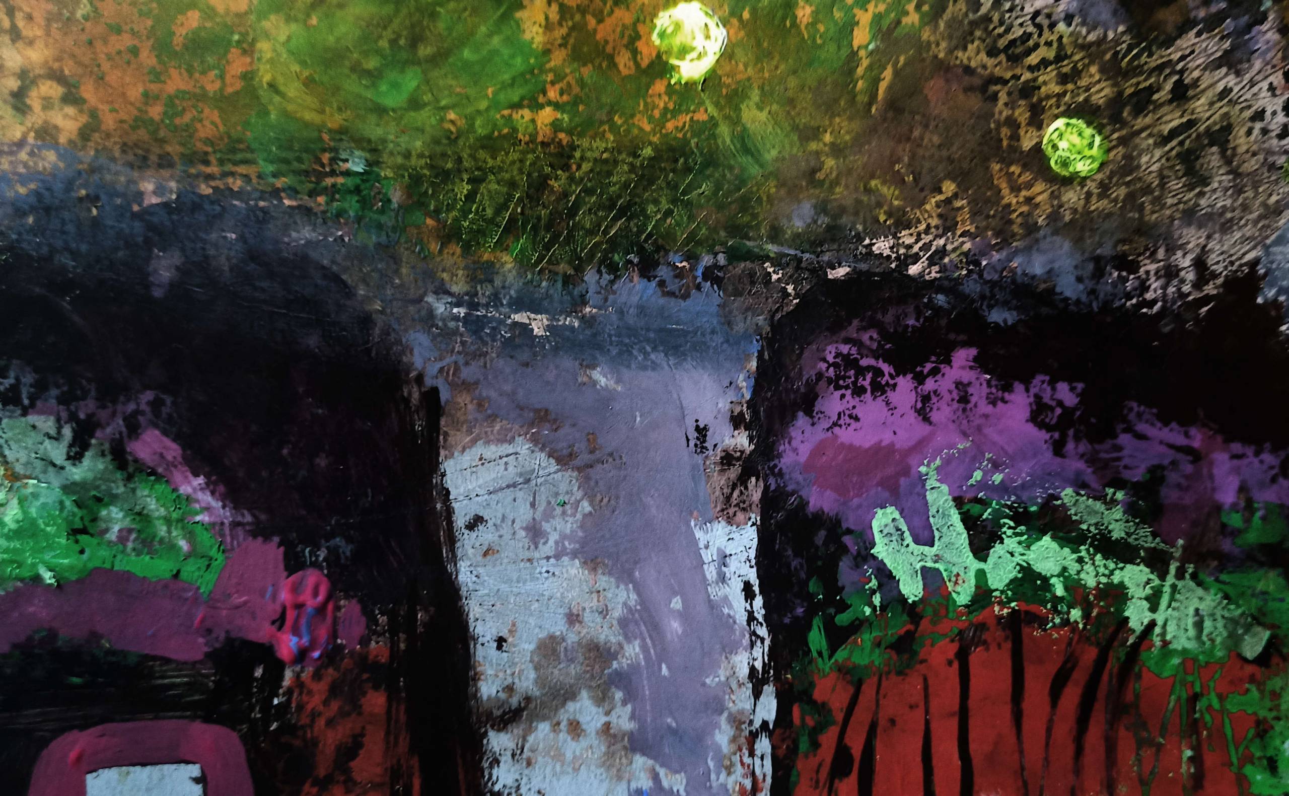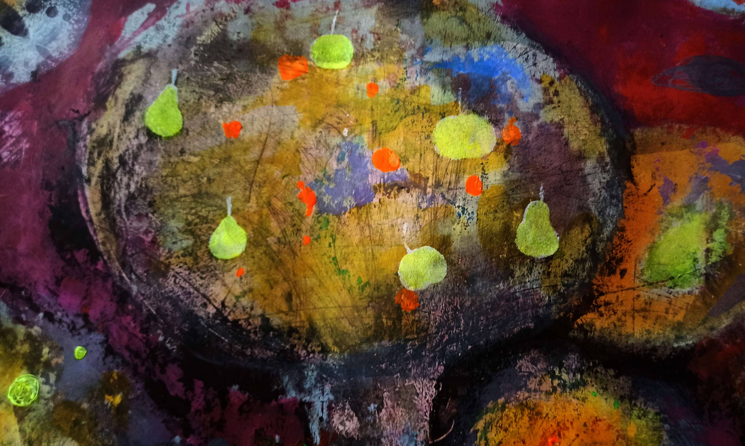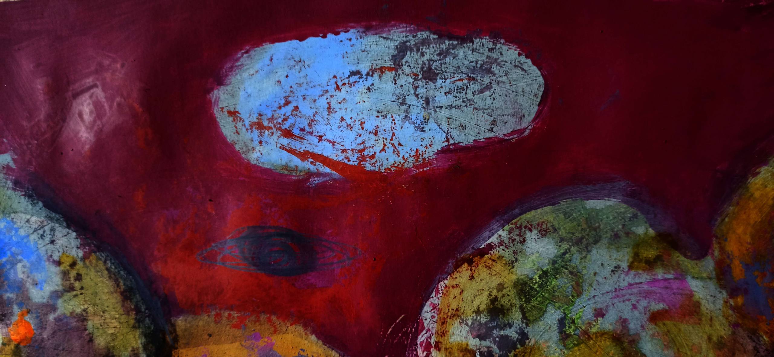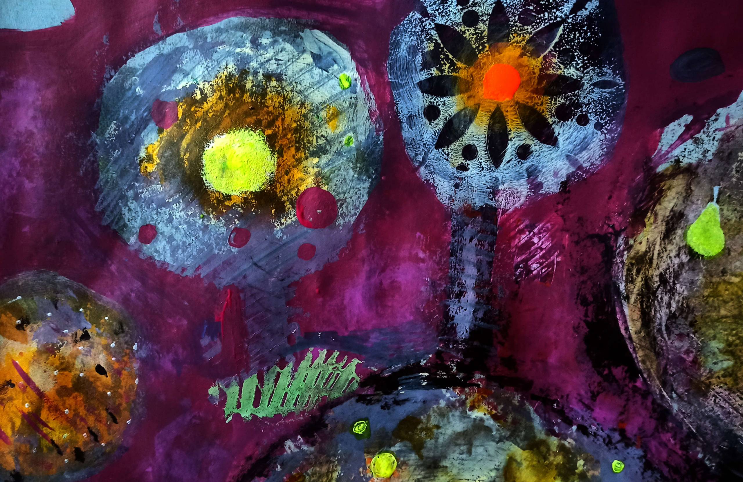 Technika autorska na grubym papierze kredowym: akryl, tusz, enkaustyka, kredki