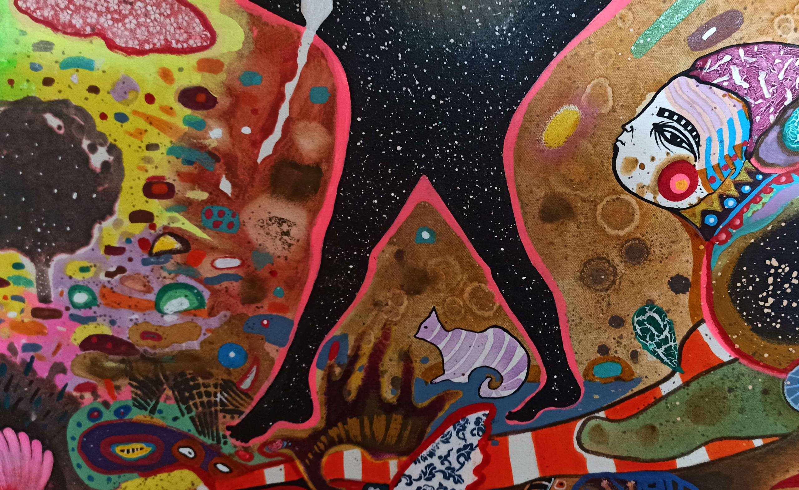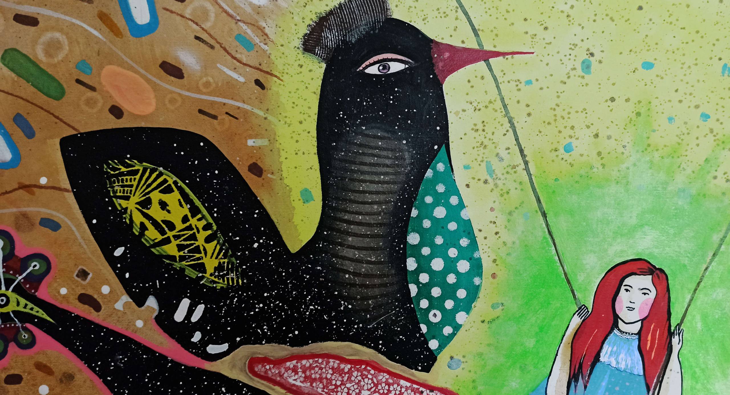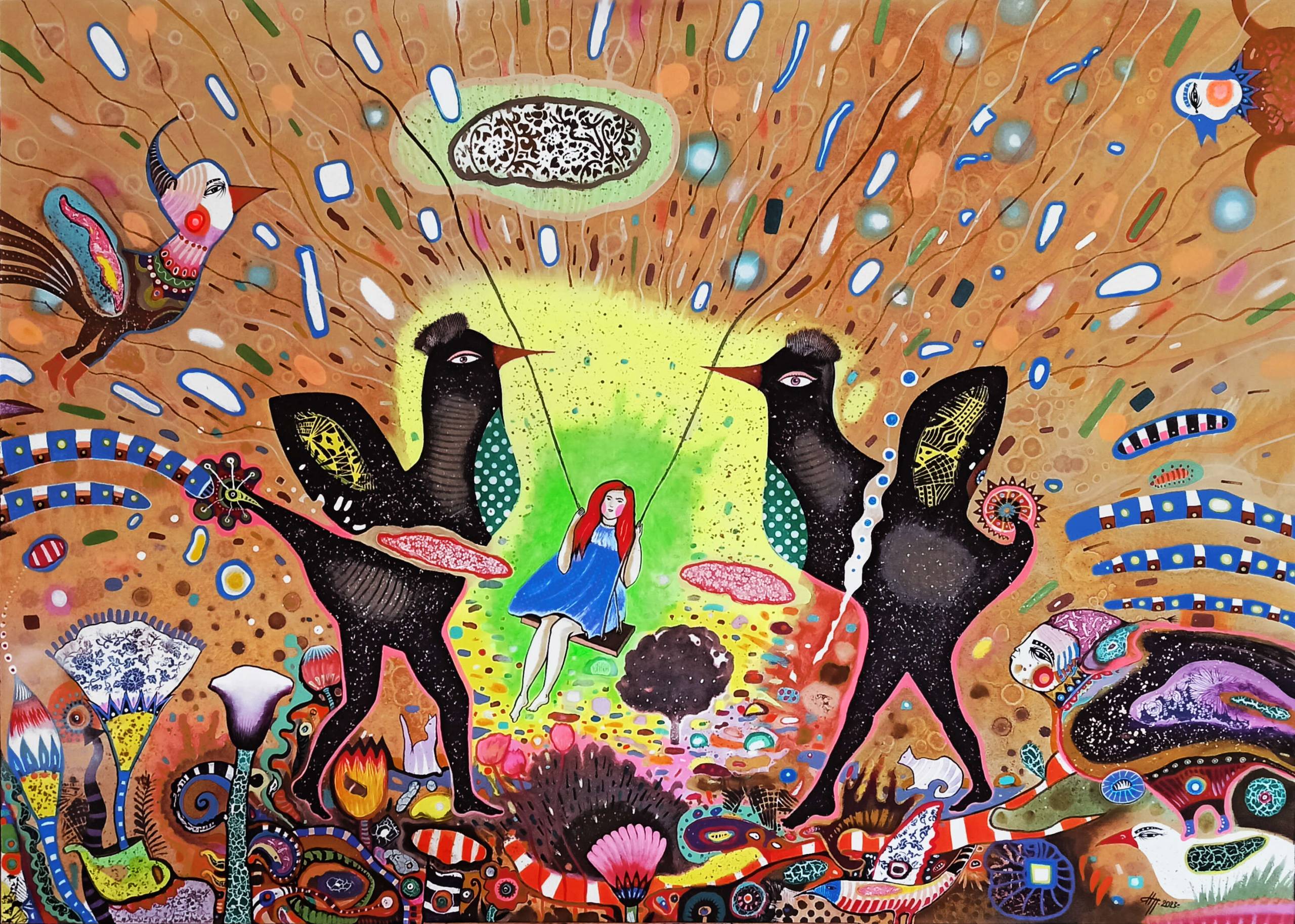 Duży format XL. Obraz na płótnie drobnoziarnistym naciągnięty na blejtram. Magiczny świat autorki, który znajduje się gdzieś pomiędzy snem, marzeniem i radosnym i ciepłym wspomnieniem o dzieciństwie. Oryginalna technika autorska: akryl, tusz, lakiery. Całość zawerniksowana lakierem w połysku, boki są pomalowane na czarno - praca nie wymaga ramy i jest gotowa do powieszenia.