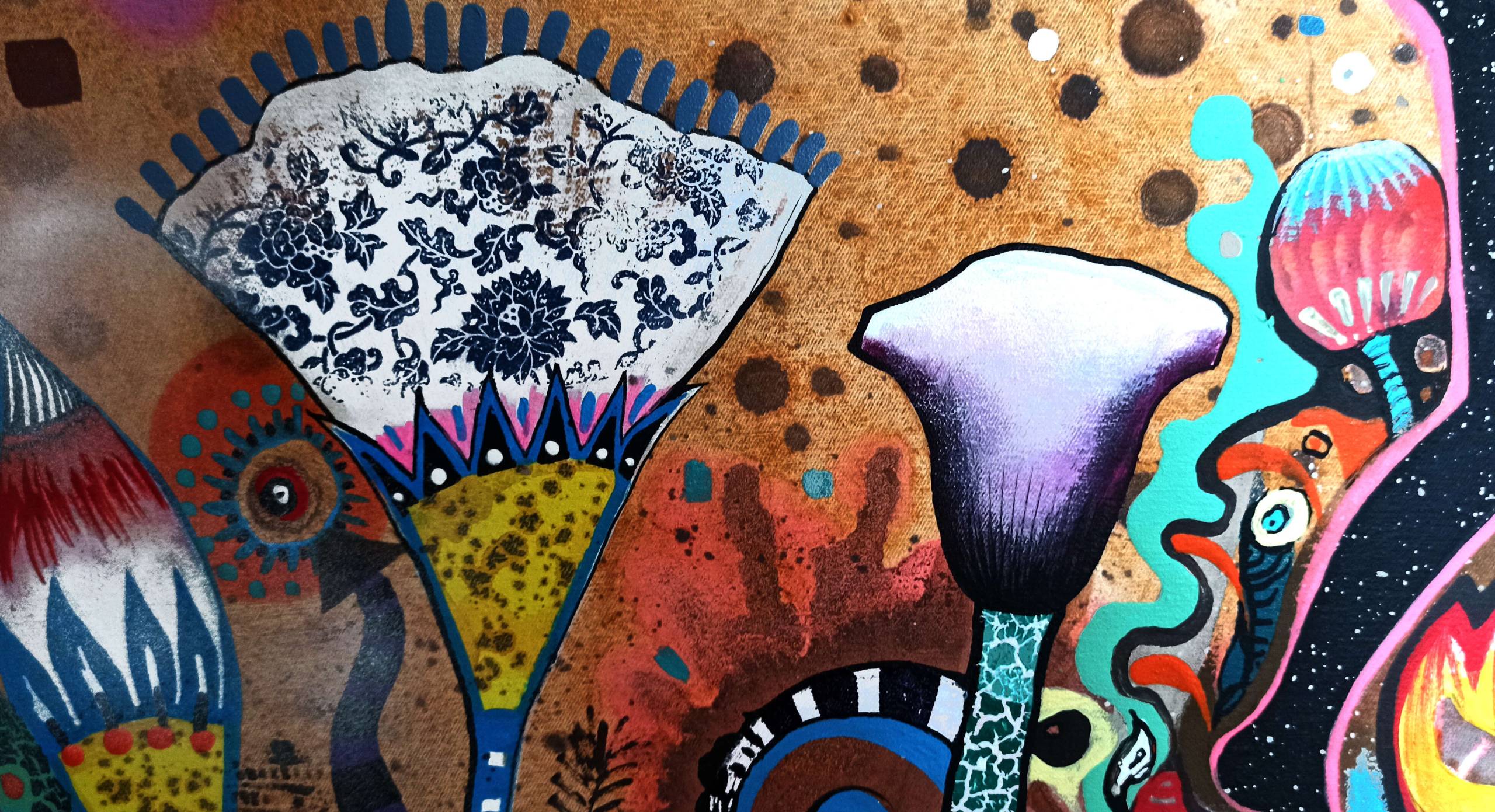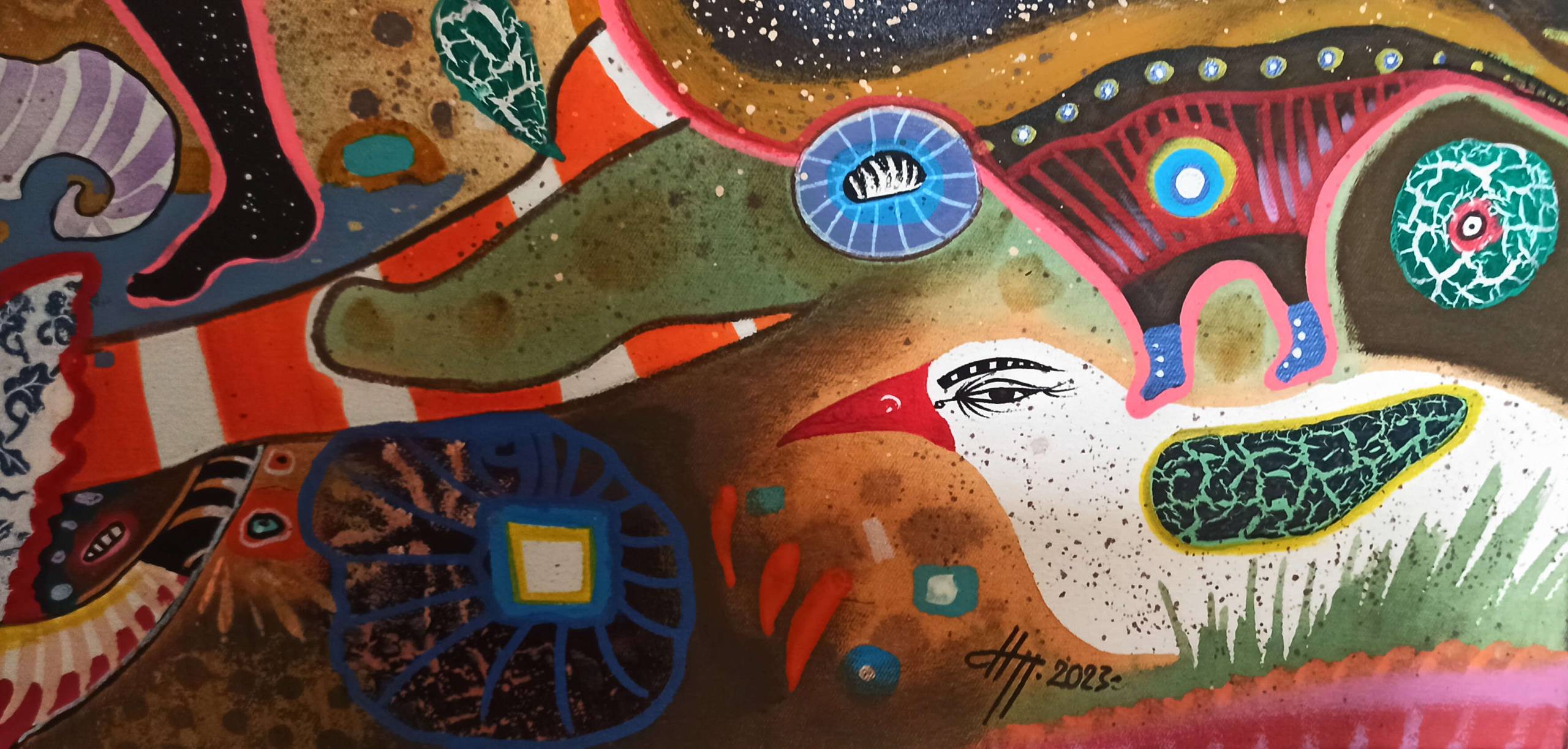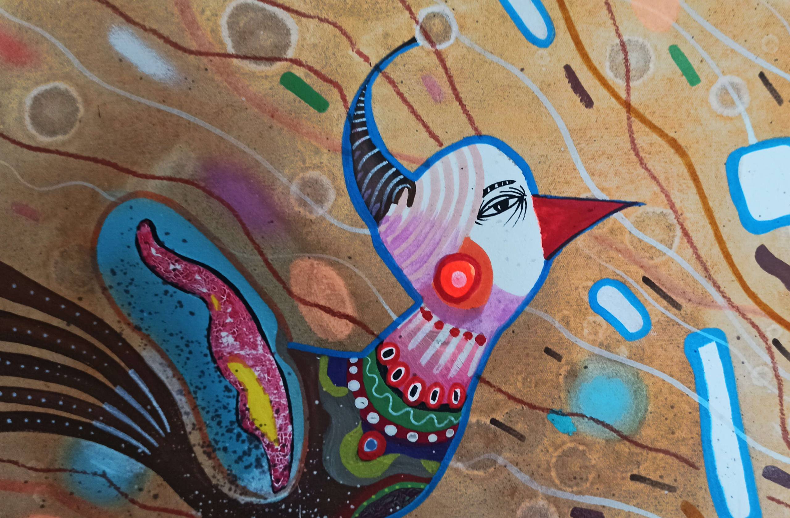 Duży format XL. Obraz na płótnie drobnoziarnistym naciągnięty na blejtram. Magiczny świat autorki, który znajduje się gdzieś pomiędzy snem, marzeniem i radosnym i ciepłym wspomnieniem o dzieciństwie. Oryginalna technika autorska: akryl, tusz, lakiery. Całość zawerniksowana lakierem w połysku, boki są pomalowane na czarno - praca nie wymaga ramy i jest gotowa do powieszenia.
