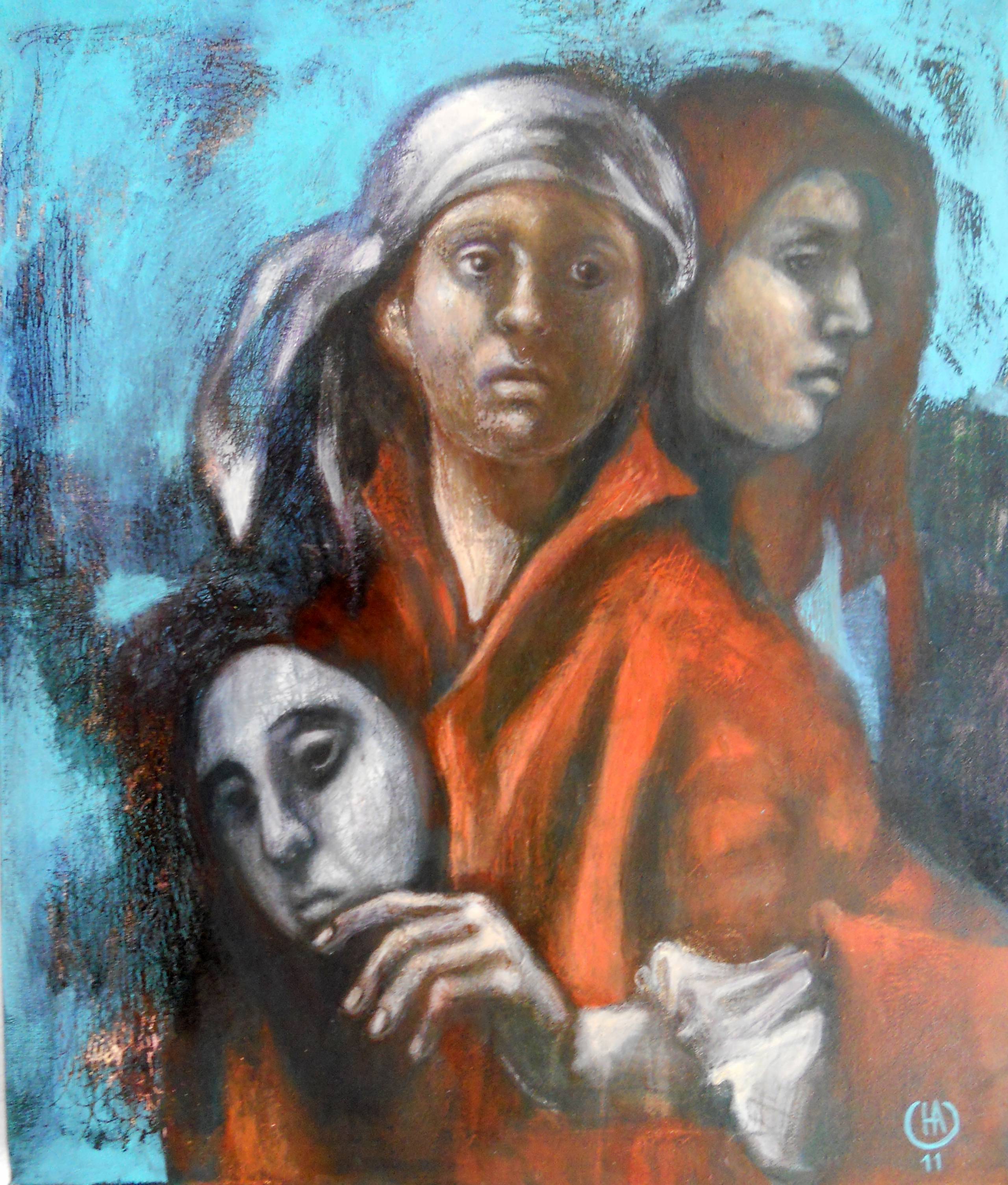 Obraz przedstawia tajemnicze postaci zanurzone w ciemnościach, na tle niebieskiego tła, które przypomina niespokojne niebo. Dominują tutaj ciepłe odcienie czerwieni i pomarańczu, które kontrastują z zimnymi błękitami, tworząc dynamiczną kompozycję. Postacie ukazane są w realistyczny sposób, z wyraźnym akcentem na wyraz twarzy, co nadaje im głębię i wyrazistość. Nastrój, jaki emanuje z dzieła, jest pełen zadumy i niepokoju, jakbyśmy stali przed nieodgadnioną tajemnicą. Styl artysty łączy elementy realizmu z odrobiną impresjonizmu; widoczne są ślady pędzla, które dodają tekstury. Technika, widać, że artysta nie bał się eksperymentować z barwami i cieniami. Widz może odczuwać mieszankę fascynacji i niepewności, zastanawiając się, jakie historie kryją się za pustymi spojrzeniami portretowanych. A może te postaci są zamyślone? Albo smutne? Trudno powiedzieć. Obraz może skłaniać do refleksji nad sensem istnienia. Gdy na niego patrzę, ogarnia mnie swoiste poczucie "wonder", jakby sztuka otwierała przed mną drzwi do innego świata. Jest coś niesamowitego w jego surowej szczerości. Coś, co pozostawia odbiorcę w udziwnionym stanie niemożliwym do zdefiniowania jednym zdaniem na pewno.