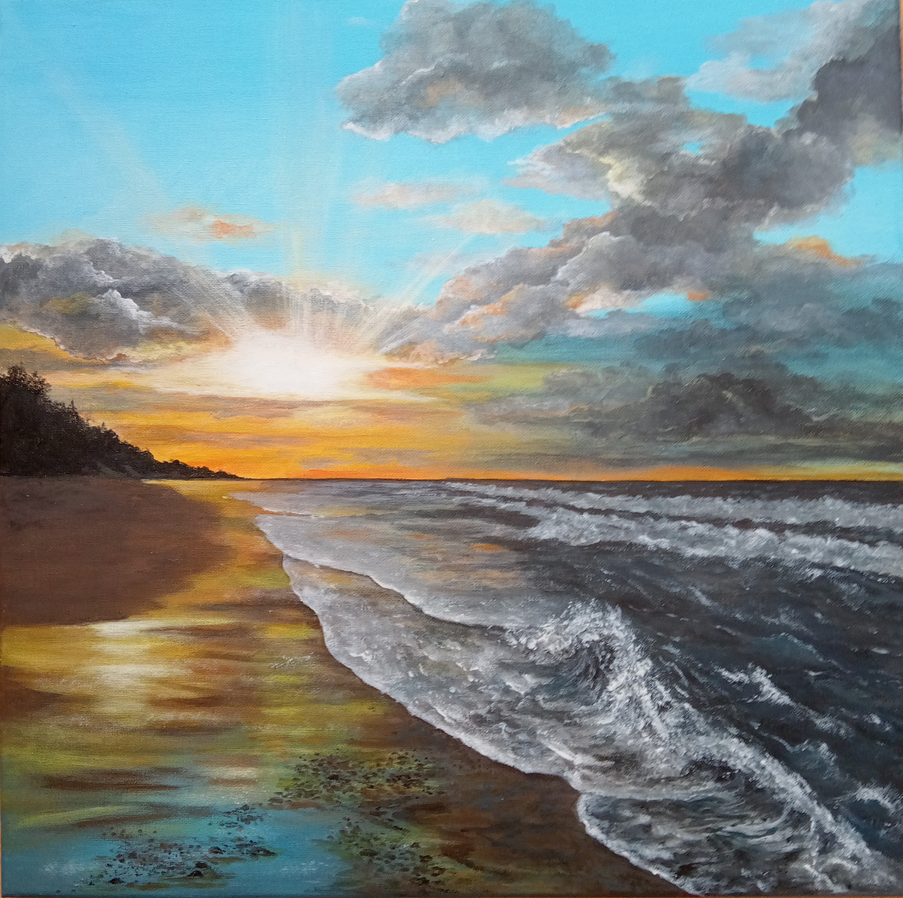 Obraz ukazuje malowniczy zachód słońca nad spokojnym morzem. Kolory są soczyste, żywe - połączenie intensywnego pomarańczu, złota i niebieskiego. Niebo przeplatane jest chmurami, które wydają się niemal miękkie, niczym wata cukrowa. Fale delikatnie uderzają o brzeg, tworząc białą pianę. Kompozycja subtelnie prowadzi wzrok ku horyzontowi, gdzie słońce powoli zanurza się w wodzie. Atmosfera tego dzieła jest pełna spokoju i nostalgii. Czujesz, jakby czas stanął w miejscu. To takie "perfect moment", kiedy wszystko wokół mówi ci, żeby przystanąć i podziwiać. Styl artysty przypomina klasyczne podejście do pejzażu, choć widać tu nutę swobody i pewną lekkość pędzla. Kolorystyka jest przemyślana, tworząc harmonijną całość. Widać, że artysta bawił się światłem i cieniem, nadając obrazowi głębię. Obraz może wywoływać u odbiorcy poczucie tęsknoty za latem i beztroskimi chwilami. Kiedy na to patrzę, czuję się, jakbym miał znów siedem lat, biegnąc boso po plaży i ścigając fale. Niesamowite, jak jedno dzieło może przywołać tyle wspomnień. Wow!