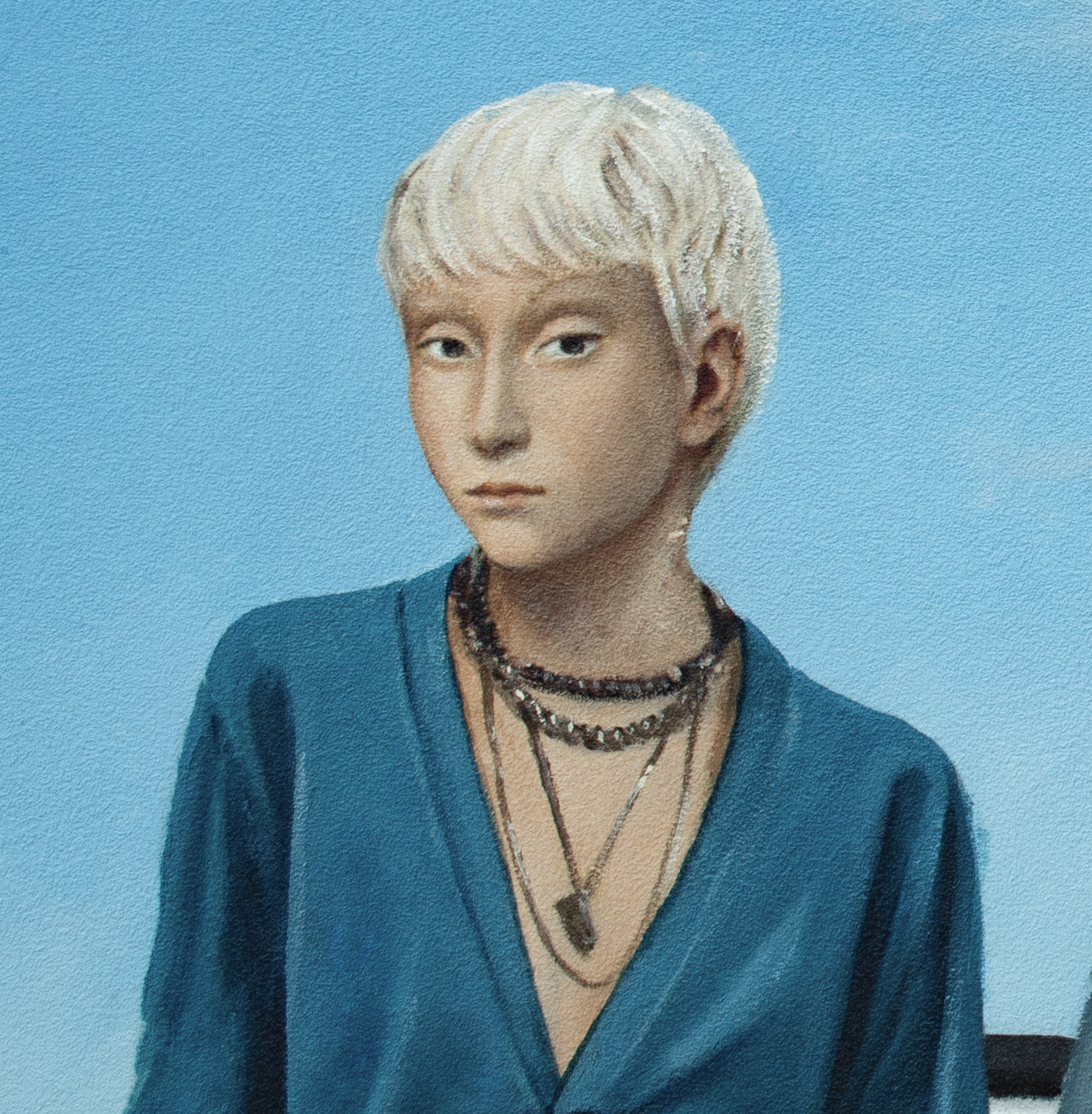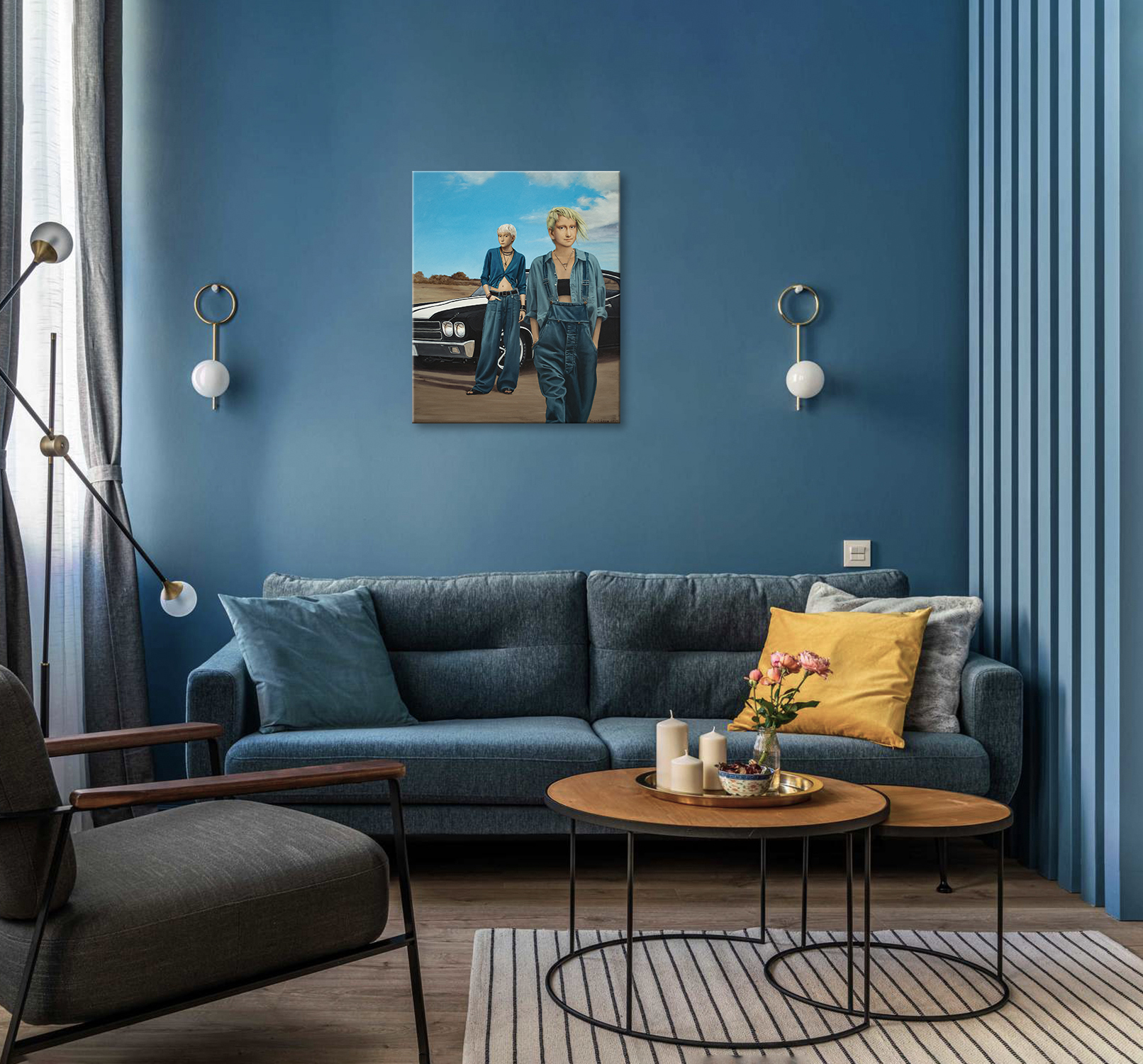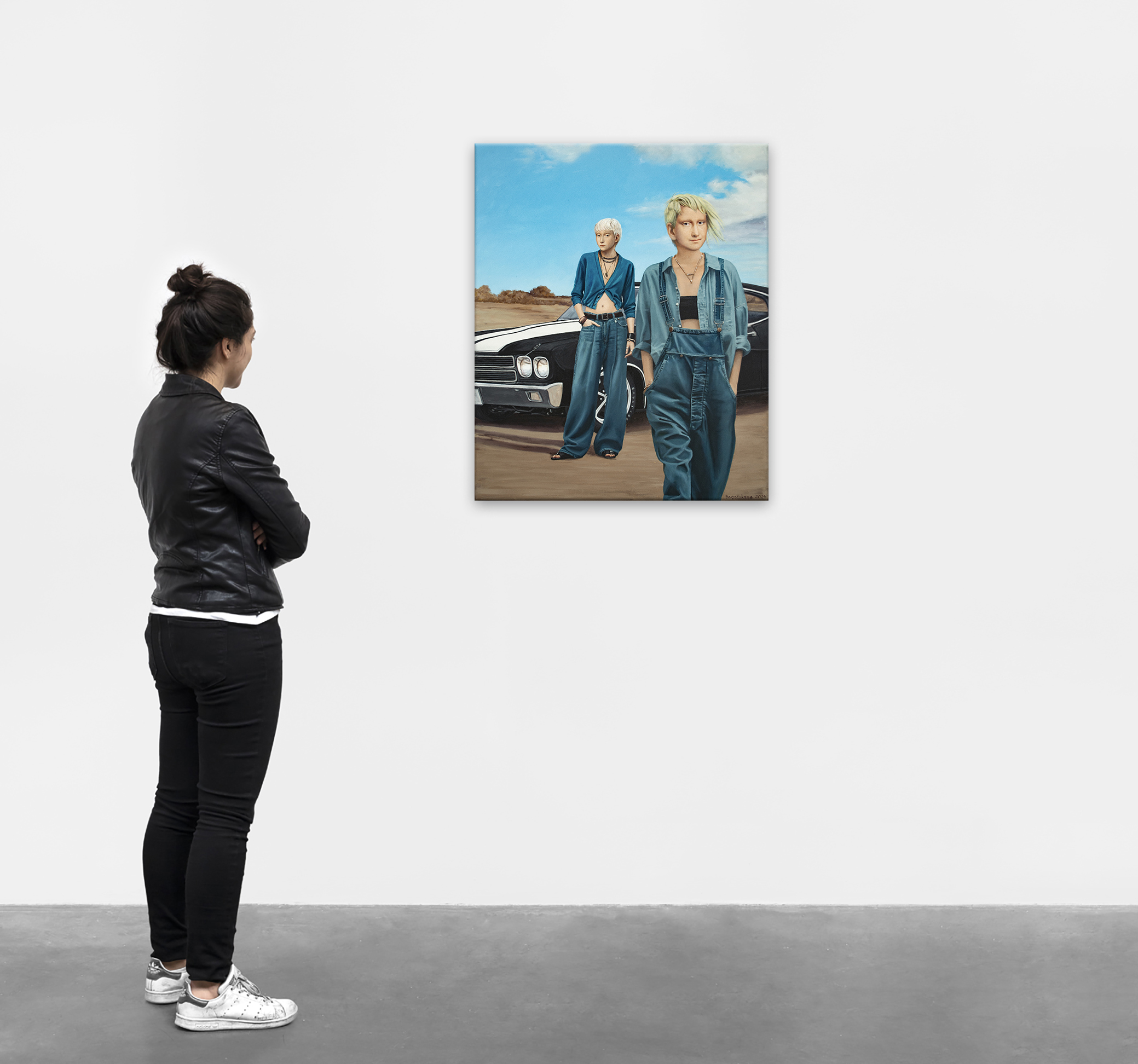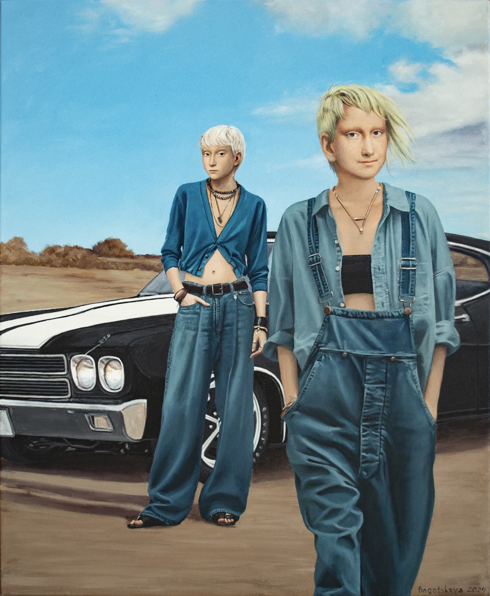 Chciałem uchwycić istotę młodzieńczego buntu i beztroskiego ducha w realistyczny, a zarazem stylowy sposób. Bohaterowie, dzięki śmiałemu spojrzeniu i swobodnemu zachowaniu, ucieleśniają poczucie niezależności. Pewnie stoją na tle klasycznego tła, podkreślając opowieść o wolności i wytrwałym dążeniu do tożsamości. Dzieło to przedstawia dynamiczną scenę na tle rozświetlonego słońcem krajobrazu pod intensywnie błękitnym niebem. Fabuła filmu koncentruje się na dwóch młodych kobietach, których modne wybory i swobodne pozy emanują obojętnością po długiej podróży. Zatrzymali się, by odpocząć, a ich swobodny sposób bycia odzwierciedlał zmęczenie i obojętność. Jedna z kobiet ma na sobie dżinsowy kombinezon nałożony na czarny top, a jej platynowe blond włosy kontrastują z niebem. Druga kobieta, stojąca obok zabytkowego czarno-białego samochodu, odzwierciedla tę obojętność, ubrana w kurtkę dżinsową i czarny top. Klasyczny design samochodu kontrastuje z nowoczesnym wyglądem, symbolizując połączenie epok. Jałowy krajobraz podkreśla izolację, skupiając uwagę na kobietach i ich spokojnej obecności. Dbałość artysty o szczegóły i wykorzystanie kolorów wzbogacają scenę, czyniąc ją dynamiczną i sugestywną. Aby uzyskać fakturę przed malowaniem, nakłada się warstwę pasty teksturowanej z drobinkami szkła, a następnie szlifuje w celu uzyskania gładkości. Do malowania użyto holenderskich farb akrylowych Amsterdam oraz włoskiego płótna Unico. Wykończenie - lakier satynowy. Końce pomalowane są w kolorze tła. Serial „Życie w Avatarze”. Wykonane i wysłane na płótnie rozciągniętym na drewnianej ramie. Obraz zapakowany jest w tekturowe pudełko z warstwami folii bąbelkowej. Praca jest podpisana i posiada certyfikat.