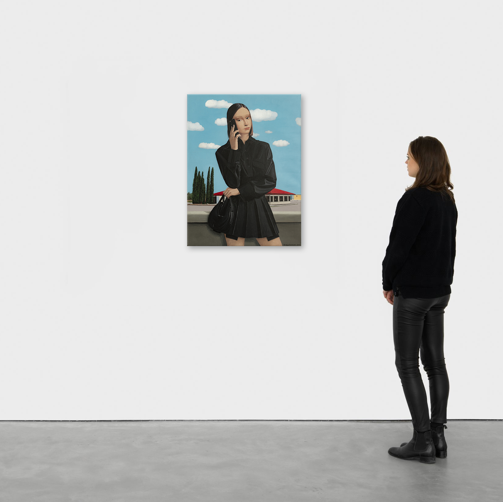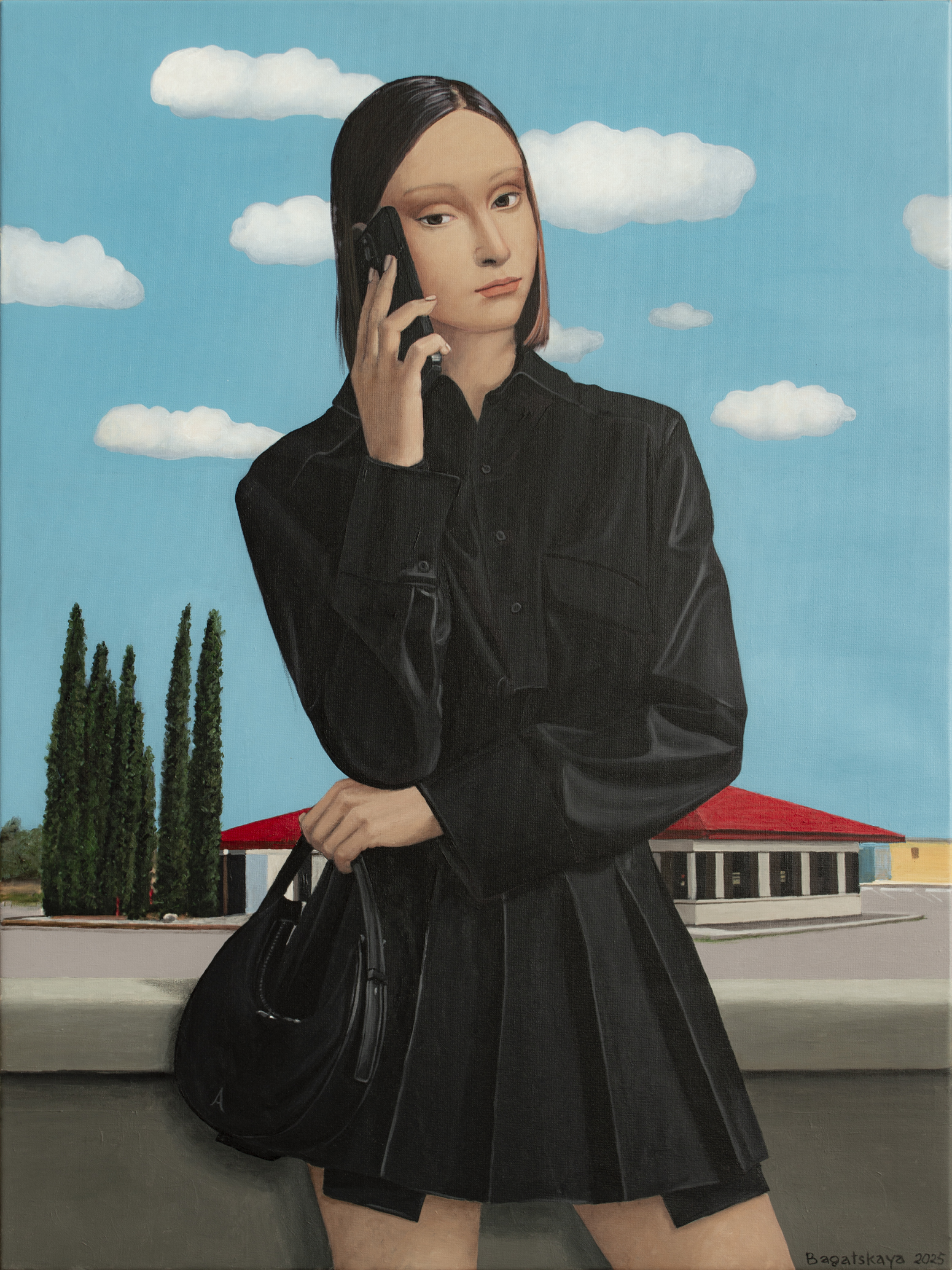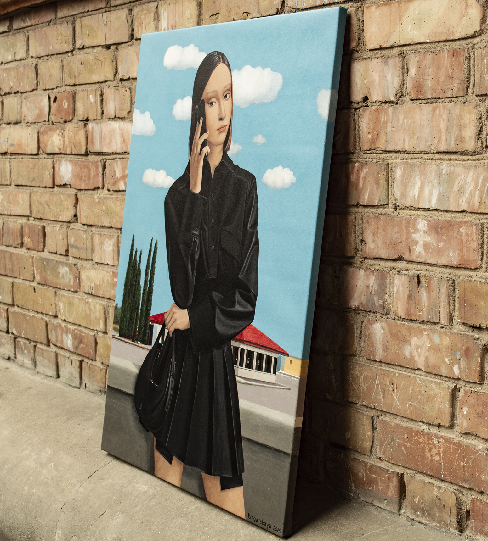 Na obrazie widzimy młodą kobietę w czarnej sukience, trzymającą telefon przy uchu i torebkę w dłoni. Scenę dopełnia jasne, błękitne niebo z puszystymi, białymi chmurami, które nadają całej kompozycji lekkości i świeżości. W tle, za kobietą, rozciągają się zielone drzewa i budynek z czerwonym dachem — ten kontrast kolorystyczny wzmacnia głębię przestrzeni i atmosferę codziennego spokoju. Artysta wykorzystał realistyczny styl z dbałością o szczegóły i wyraziste kontury, zwłaszcza w ubiorze postaci. Czarna sukienka z nowoczesnym fasonem podkreśla jej sylwetkę, dodając elegancji i charakteru. Obraz emanuje spokojem i lekką tajemniczością. Kobieta wydaje się być zamyślona lub pogrążona w ważnej rozmowie. Może to moment zawieszenia — chwila refleksji pośród codziennego zgiełku. Uczucia, jakie budzi ta scena, to nostalgia, ciekawość, może nawet poczucie wolności. Jakby czas na chwilę się zatrzymał. Najbardziej przyciąga wzrok zestawienie intensywnej czerni jej ubioru z subtelnym błękitem nieba. Gra światła i cienia dodaje głębi, tworząc atmosferę przestrzeni i oddechu. Można odnieść wrażenie, że jesteśmy tuż obok niej — czując letni wiatr i słuchając dźwięków rozmowy niesionych w przestrzeń. A może ten telefon w jej ręku to nie tylko narzędzie, ale pomost do innego świata? Podpisano z przodu i z tyłu, uwierzytelniono przez artystę, z pomalowanymi krawędziami i bezpiecznym opakowaniem. Stworzone przy użyciu profesjonalnych holenderskich farb akrylowych (Amsterdam) na wysokiej jakości drobnoziarnistym włoskim płótnie bawełnianym (Unico). Wykończone ochronnym lakierem satynowym. Część serii „Życie w Avatarze”. Dzieło jest dostarczane z certyfikatem autentyczności.