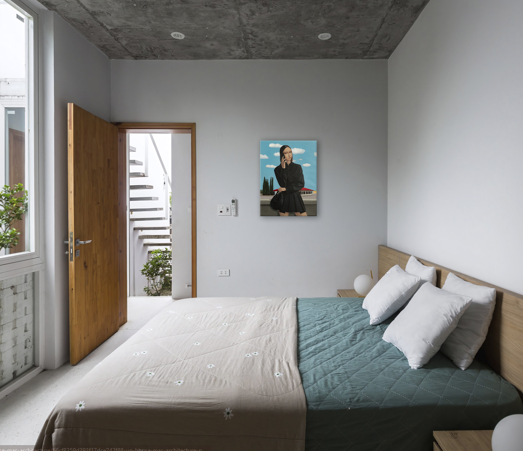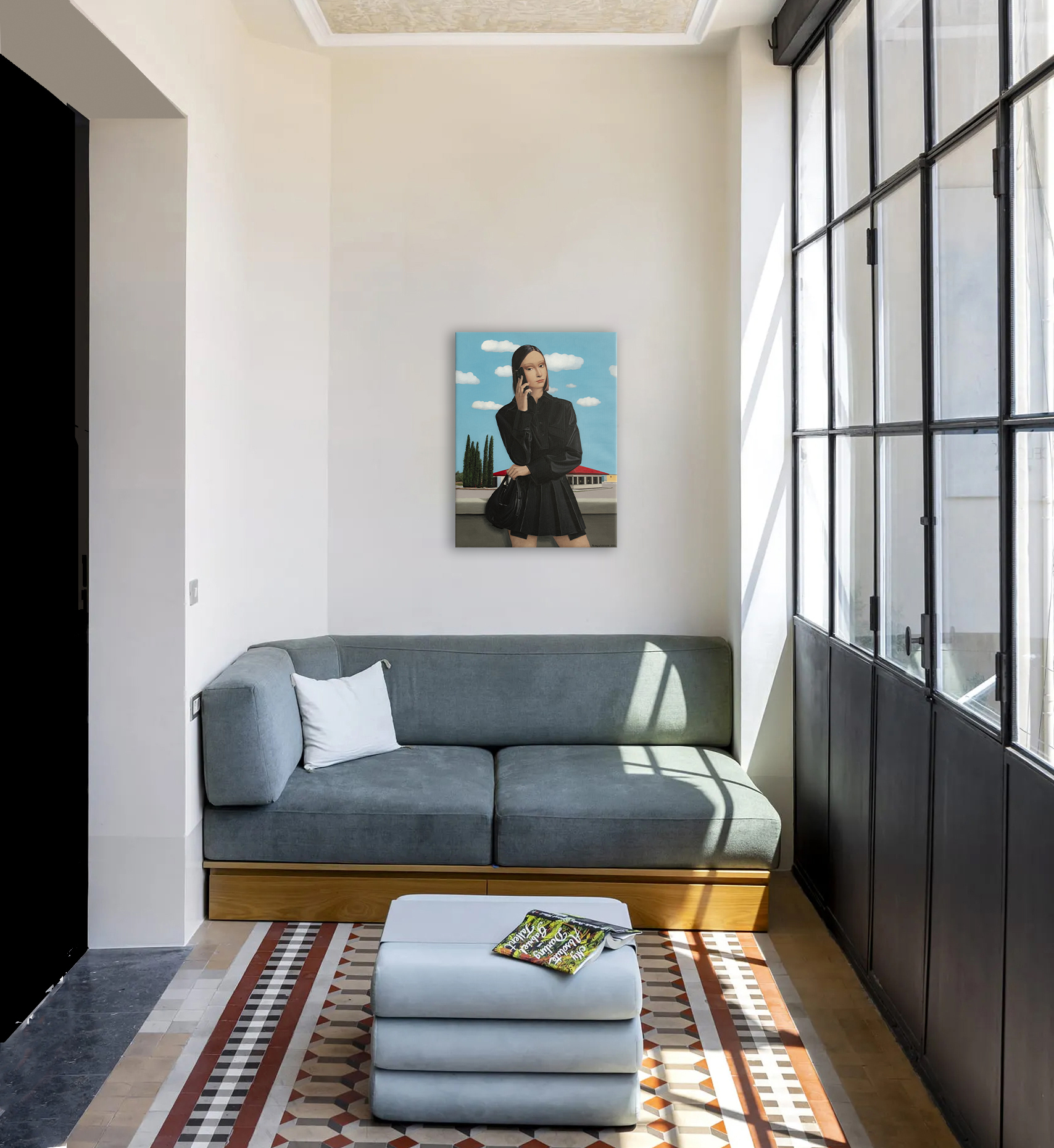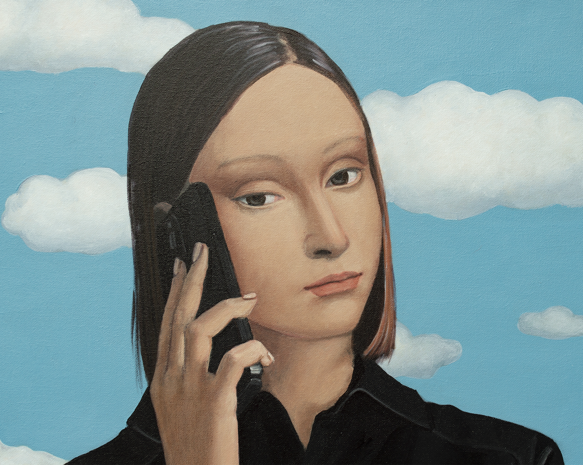 Na obrazie widzimy młodą kobietę w czarnej sukience, trzymającą telefon przy uchu i torebkę w dłoni. Scenę dopełnia jasne, błękitne niebo z puszystymi, białymi chmurami, które nadają całej kompozycji lekkości i świeżości. W tle, za kobietą, rozciągają się zielone drzewa i budynek z czerwonym dachem — ten kontrast kolorystyczny wzmacnia głębię przestrzeni i atmosferę codziennego spokoju. Artysta wykorzystał realistyczny styl z dbałością o szczegóły i wyraziste kontury, zwłaszcza w ubiorze postaci. Czarna sukienka z nowoczesnym fasonem podkreśla jej sylwetkę, dodając elegancji i charakteru. Obraz emanuje spokojem i lekką tajemniczością. Kobieta wydaje się być zamyślona lub pogrążona w ważnej rozmowie. Może to moment zawieszenia — chwila refleksji pośród codziennego zgiełku. Uczucia, jakie budzi ta scena, to nostalgia, ciekawość, może nawet poczucie wolności. Jakby czas na chwilę się zatrzymał. Najbardziej przyciąga wzrok zestawienie intensywnej czerni jej ubioru z subtelnym błękitem nieba. Gra światła i cienia dodaje głębi, tworząc atmosferę przestrzeni i oddechu. Można odnieść wrażenie, że jesteśmy tuż obok niej — czując letni wiatr i słuchając dźwięków rozmowy niesionych w przestrzeń. A może ten telefon w jej ręku to nie tylko narzędzie, ale pomost do innego świata? Podpisano z przodu i z tyłu, uwierzytelniono przez artystę, z pomalowanymi krawędziami i bezpiecznym opakowaniem. Stworzone przy użyciu profesjonalnych holenderskich farb akrylowych (Amsterdam) na wysokiej jakości drobnoziarnistym włoskim płótnie bawełnianym (Unico). Wykończone ochronnym lakierem satynowym. Część serii „Życie w Avatarze”. Dzieło jest dostarczane z certyfikatem autentyczności.