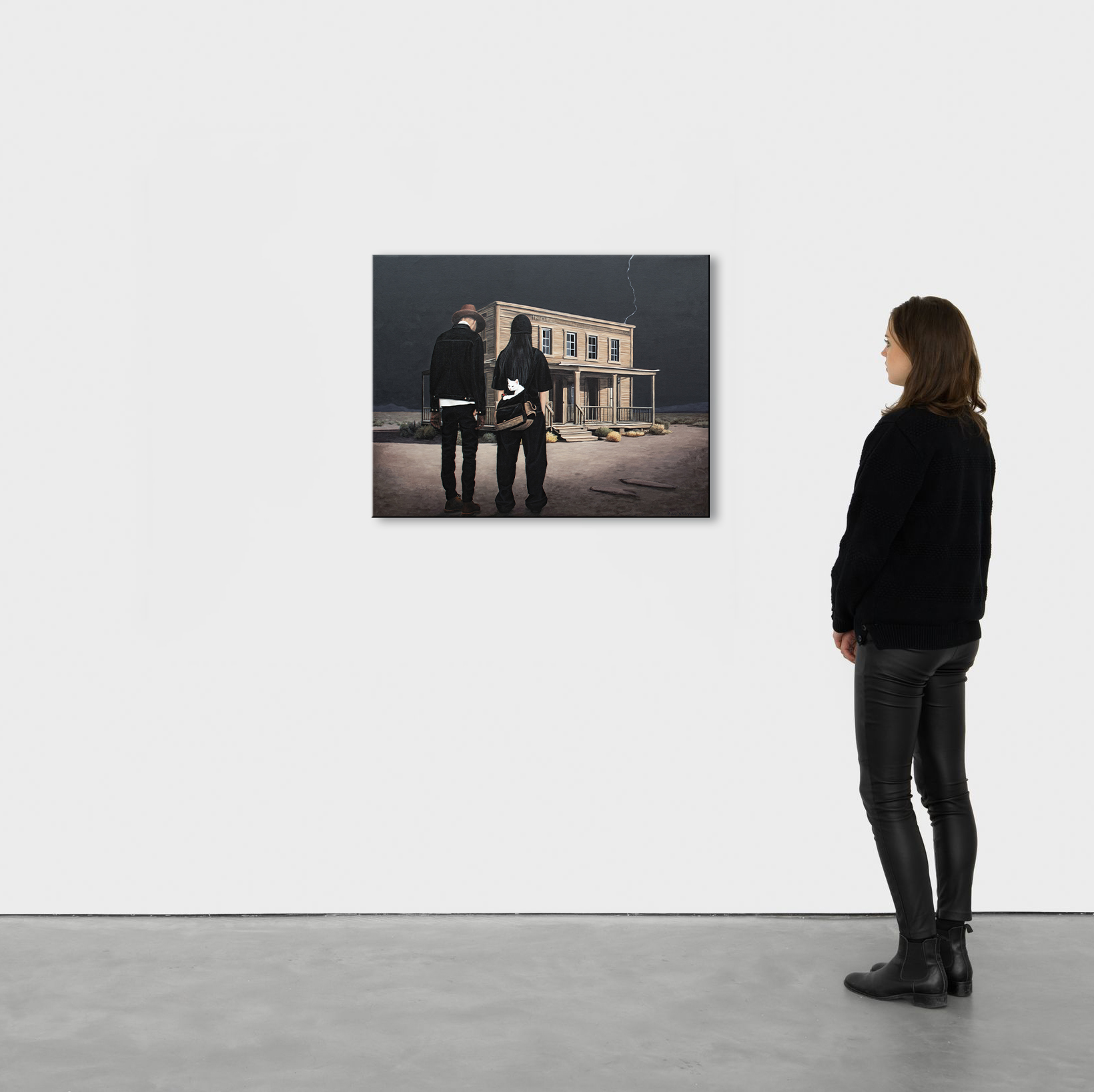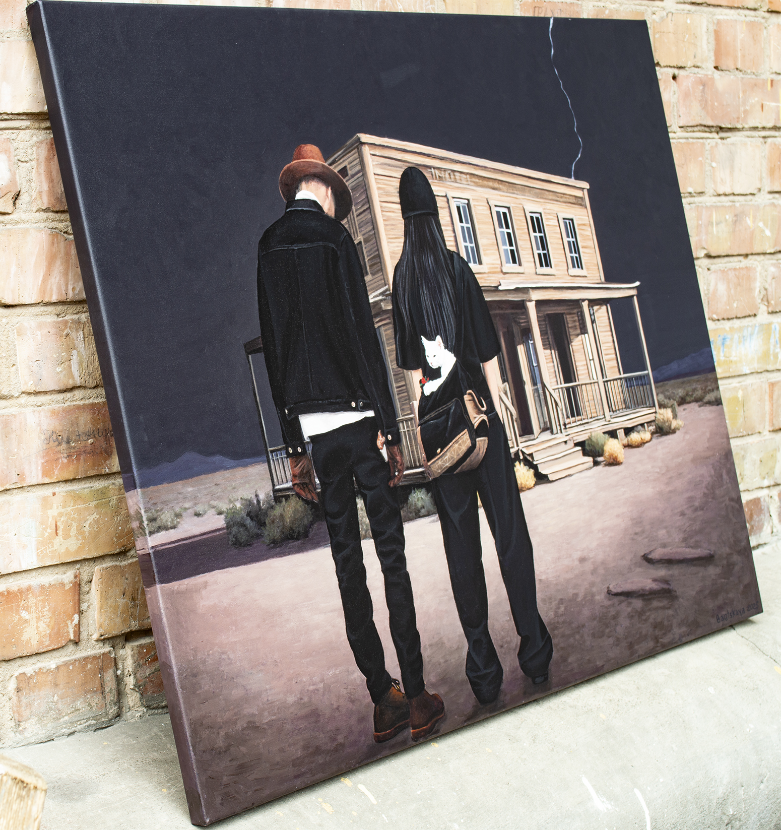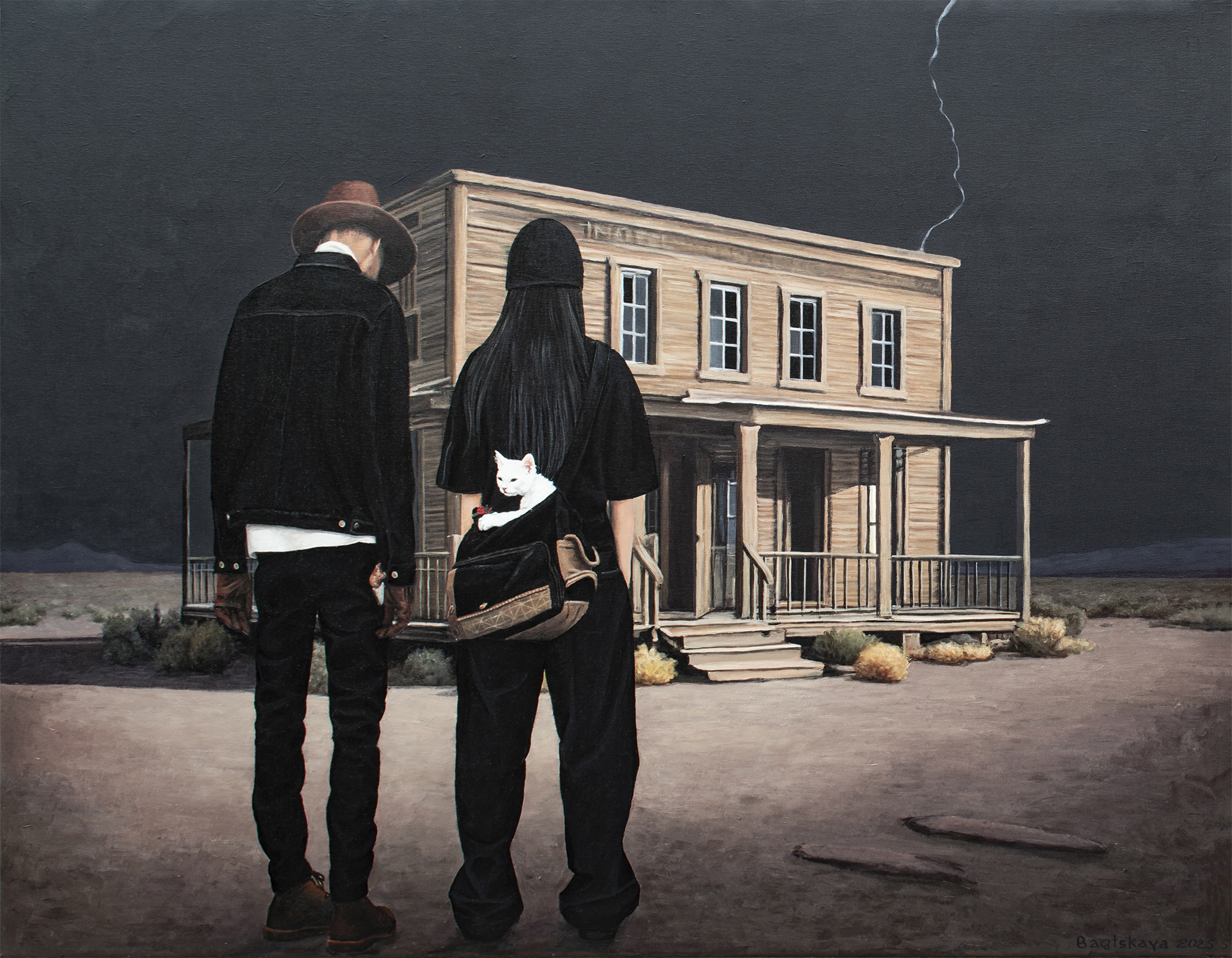 Przed Tobą tajemnicza scena, która hipnotyzuje od pierwszego spojrzenia. Pod pochmurnym, burzowym niebem, przeciętym perłową błyskawicą, stoją dwie postaci przed starym, opuszczonym drewnianym budynkiem przypominającym saloon z dzikiego zachodu. Ich ciemne sylwetki kontrastują z surowym, wysuszonym krajobrazem, a biały kot cicho obserwuje z torby jednej z nich — mały, milczący świadek tej dramatycznej chwili. To dzieło to nie tylko obraz, to okno do świata napięcia, tajemnicy i nieznanego. Tutaj łączy się realizm z surrealizmem, tworząc atmosferę, w której każdy szczegół, każda faktura drewna czy fałda ubrania przemawia językiem emocji i opowieści. Poczuj delikatne dreszcze „thrillu” i jednocześnie chłód samotności, które przenikają się w tej kompozycji. Technika, jaką wykonano ten arcydzieło, jest bezbłędna: włoskie płótno Unico, holenderskie farby akrylowe Amsterdam, satynowy lakier podkreślający głębię kolorów i chroniący dzieło na lata. Krawędzie obrazu pomalowane są na kolor tła, dlatego nie wymaga dodatkowej oprawy. Praca należy do serii "Life in Avatar", jest sygnowana z obu stron i posiada certyfikat autentyczności. Kupując ten obraz, zyskujesz nie tylko dzieło sztuki, ale cały wszechświat, który zaprasza do refleksji: kim są te postacie? Co je tutaj przywiodło? I jakie będzie dalsze rozwinięcie tej tajemniczej historii, którą odkryjesz właśnie Ty?