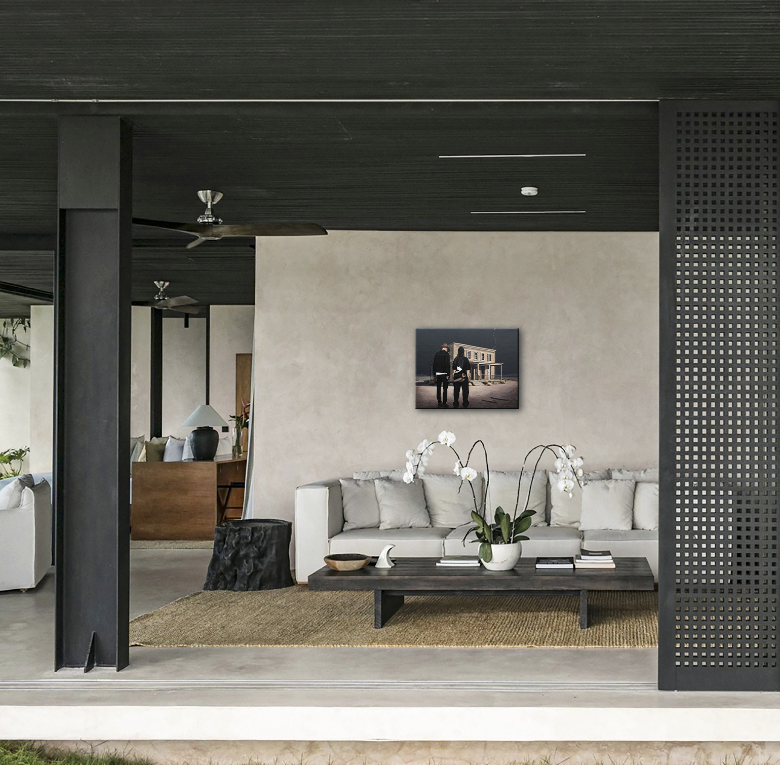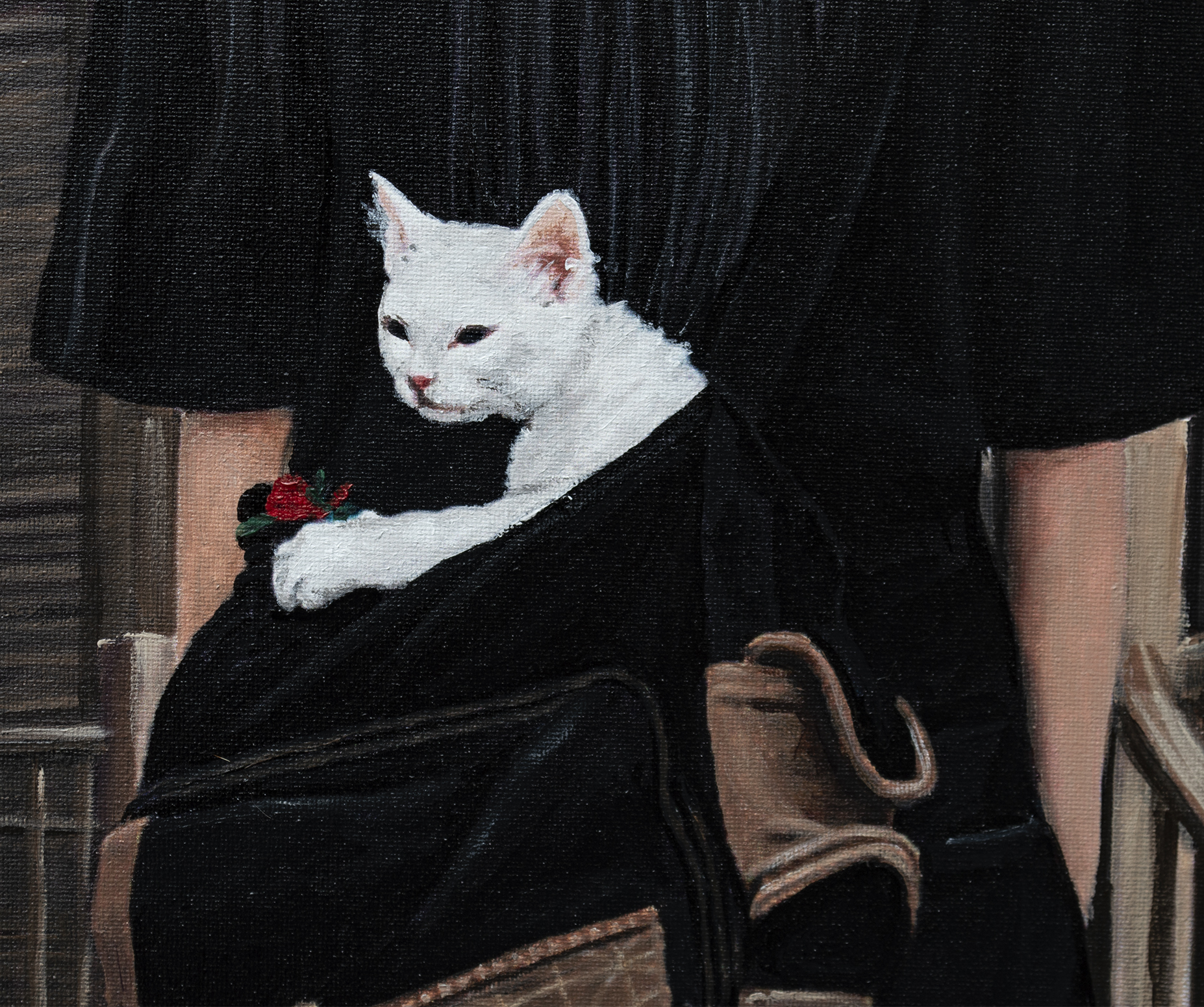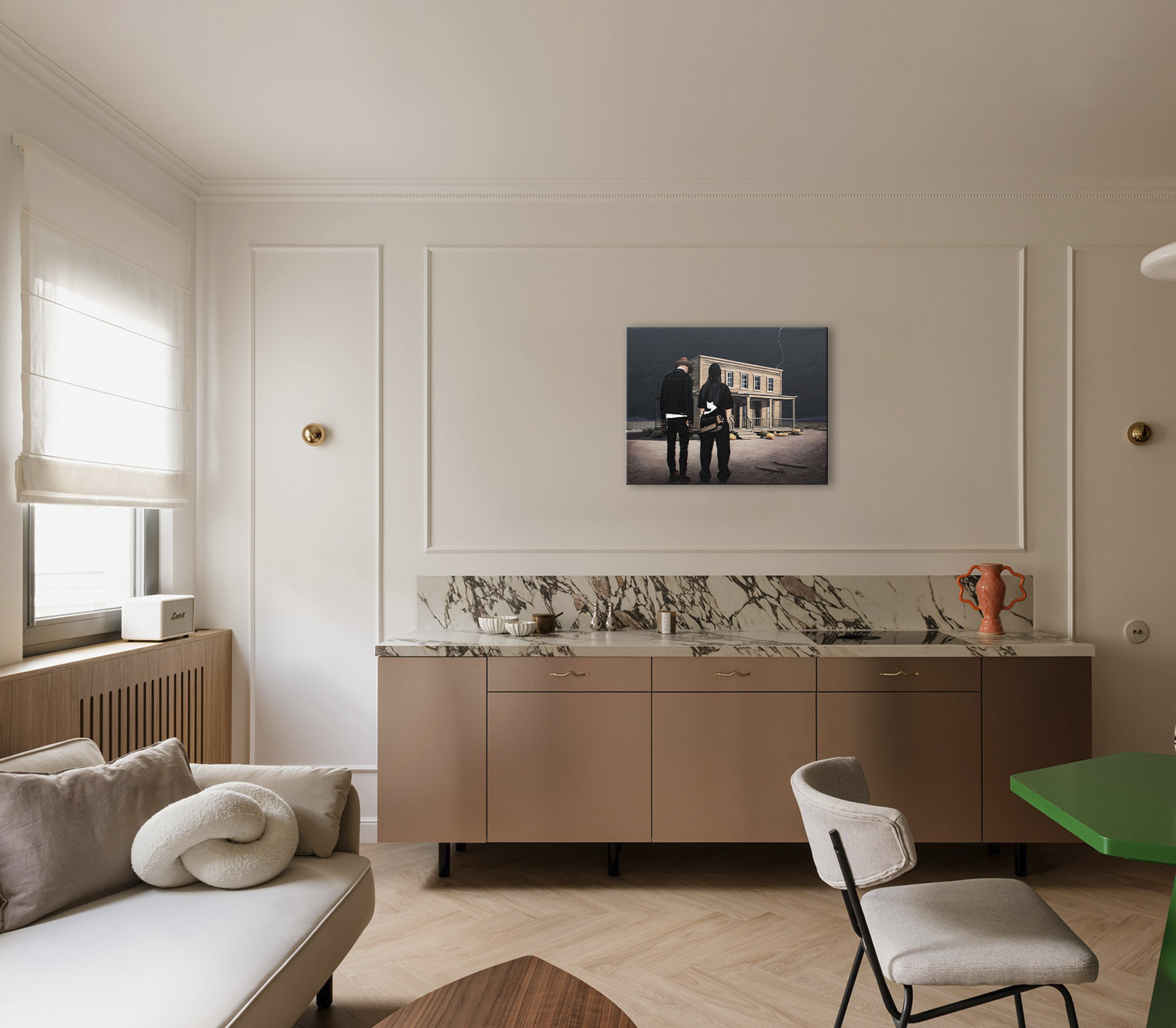 Przed Tobą tajemnicza scena, która hipnotyzuje od pierwszego spojrzenia. Pod pochmurnym, burzowym niebem, przeciętym perłową błyskawicą, stoją dwie postaci przed starym, opuszczonym drewnianym budynkiem przypominającym saloon z dzikiego zachodu. Ich ciemne sylwetki kontrastują z surowym, wysuszonym krajobrazem, a biały kot cicho obserwuje z torby jednej z nich — mały, milczący świadek tej dramatycznej chwili. To dzieło to nie tylko obraz, to okno do świata napięcia, tajemnicy i nieznanego. Tutaj łączy się realizm z surrealizmem, tworząc atmosferę, w której każdy szczegół, każda faktura drewna czy fałda ubrania przemawia językiem emocji i opowieści. Poczuj delikatne dreszcze „thrillu” i jednocześnie chłód samotności, które przenikają się w tej kompozycji. Technika, jaką wykonano ten arcydzieło, jest bezbłędna: włoskie płótno Unico, holenderskie farby akrylowe Amsterdam, satynowy lakier podkreślający głębię kolorów i chroniący dzieło na lata. Krawędzie obrazu pomalowane są na kolor tła, dlatego nie wymaga dodatkowej oprawy. Praca należy do serii "Life in Avatar", jest sygnowana z obu stron i posiada certyfikat autentyczności. Kupując ten obraz, zyskujesz nie tylko dzieło sztuki, ale cały wszechświat, który zaprasza do refleksji: kim są te postacie? Co je tutaj przywiodło? I jakie będzie dalsze rozwinięcie tej tajemniczej historii, którą odkryjesz właśnie Ty?