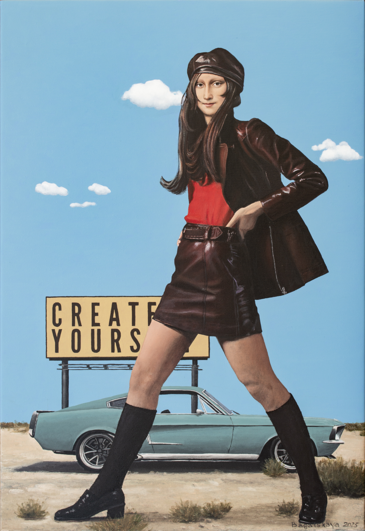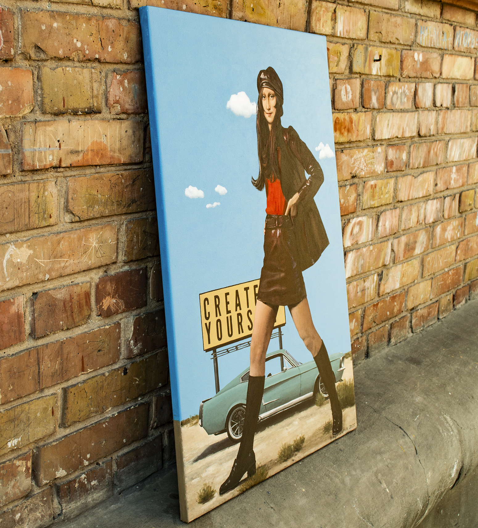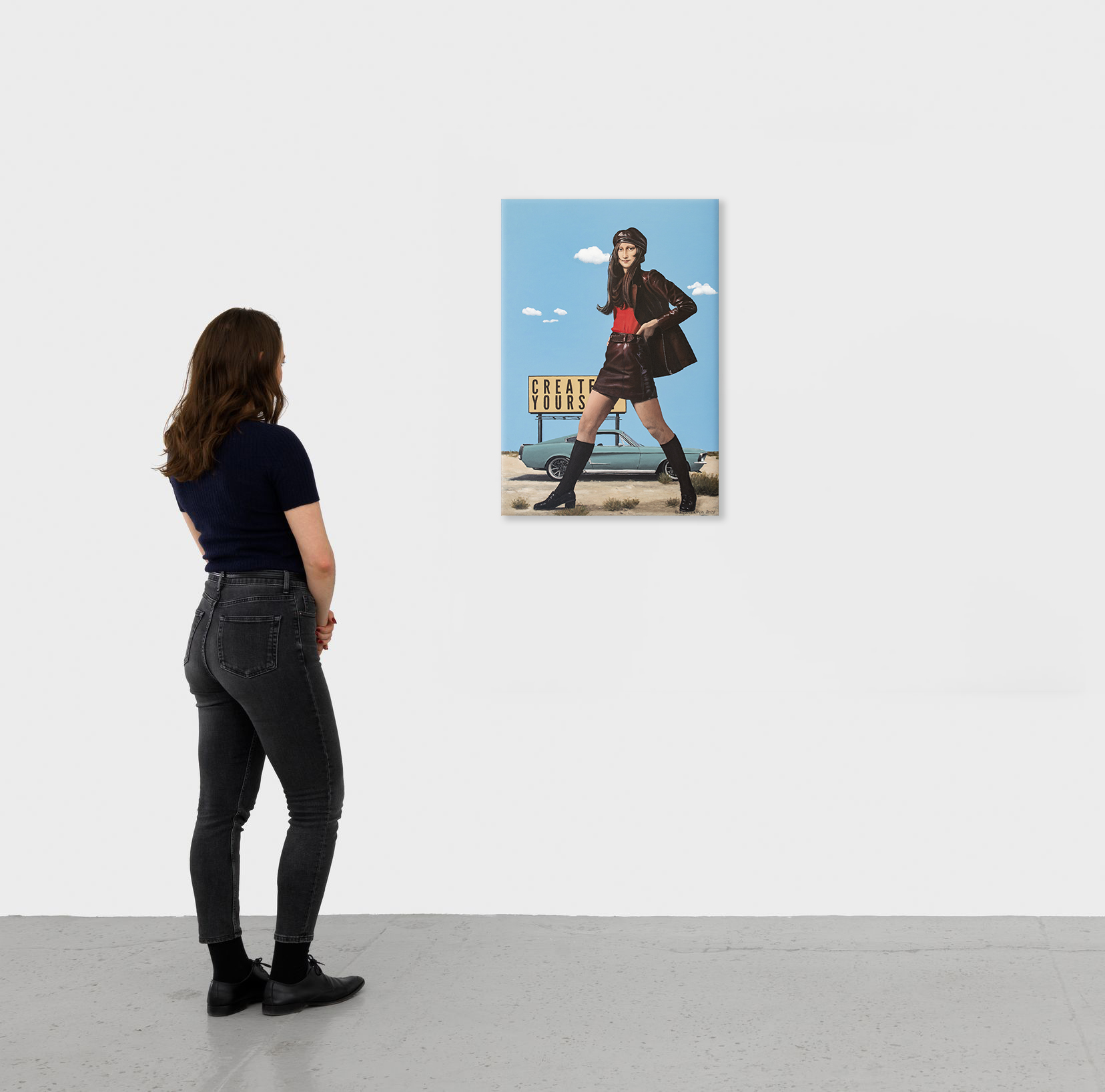 Na obrazie dominuje błękitne niebo – niemal bezkresne, zaledwie ozdobione kilkoma puszystymi chmurkami, które dodają scenie lekkości i przestrzeni. Centralną postacią jest kobieta w intensywnie czerwonym topie i brązowej spódniczce – ucieleśnienie retro stylu i niezależnej energii. Jej postawa emanuje pewnością siebie, a ciemne, długie włosy spływające po ramionach porządkują całą kompozycję niczym rama. W tle widnieje turkusowy samochód w stylu vintage oraz żółty billboard z hasłem „CREATE YOURSELF” – przesłaniem, które wybrzmiewa jak manifest wolności i samostanowienia. Całość wpisuje się w estetykę pop-artu: intensywne kolory, płaskie plamy barwne i wyraziste kontury dominują nad delikatnym cieniowaniem. Mimo graficznego uproszczenia, obraz pozostaje szczegółowy i dopracowany. To dzieło prowokuje emocje. Jest w nim nuta nostalgii za dekadami minionymi, ale też potężna dawka inspiracji. Dla mnie to przypomnienie, że każdego dnia możemy na nowo tworzyć siebie. Dziewczynka patrząc na ten obraz mogłaby powiedzieć: „Wygląda jak superbohaterka!”. To hołd dla wolności, odwagi i kobiecej siły. Wow, ten samochód wygląda jak z bajki – aż chce się ruszyć w podróż ku sobie! Obraz powstał z użyciem holenderskich farb akrylowych Amsterdam na włoskim płótnie bawełnianym Unico o drobnym splocie. Satynowy werniks pogłębia kolory i dodaje eleganckiego wykończenia. Boczne krawędzie zostały zamalowane w kolorze tła, dzięki czemu nie wymaga dodatkowego ramowania. Praca należy do serii Life in Avatar, posiada sygnaturę artystki i certyfikat autentyczności.