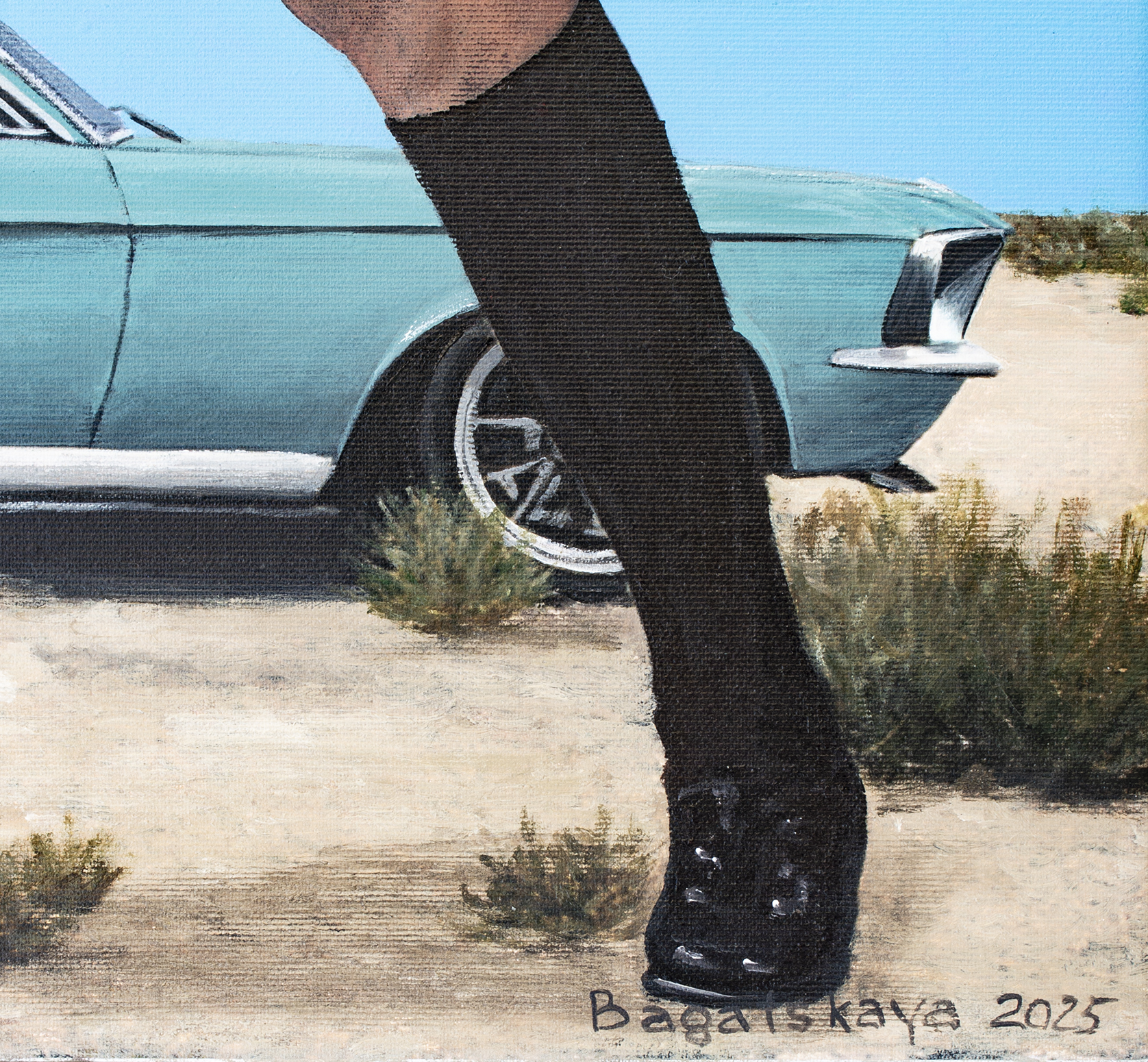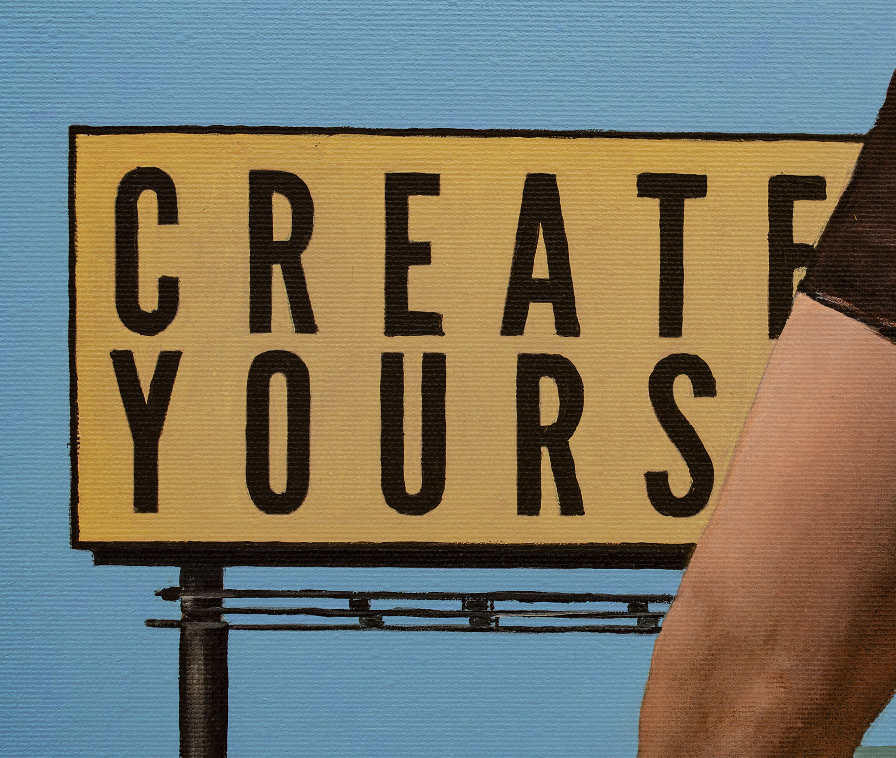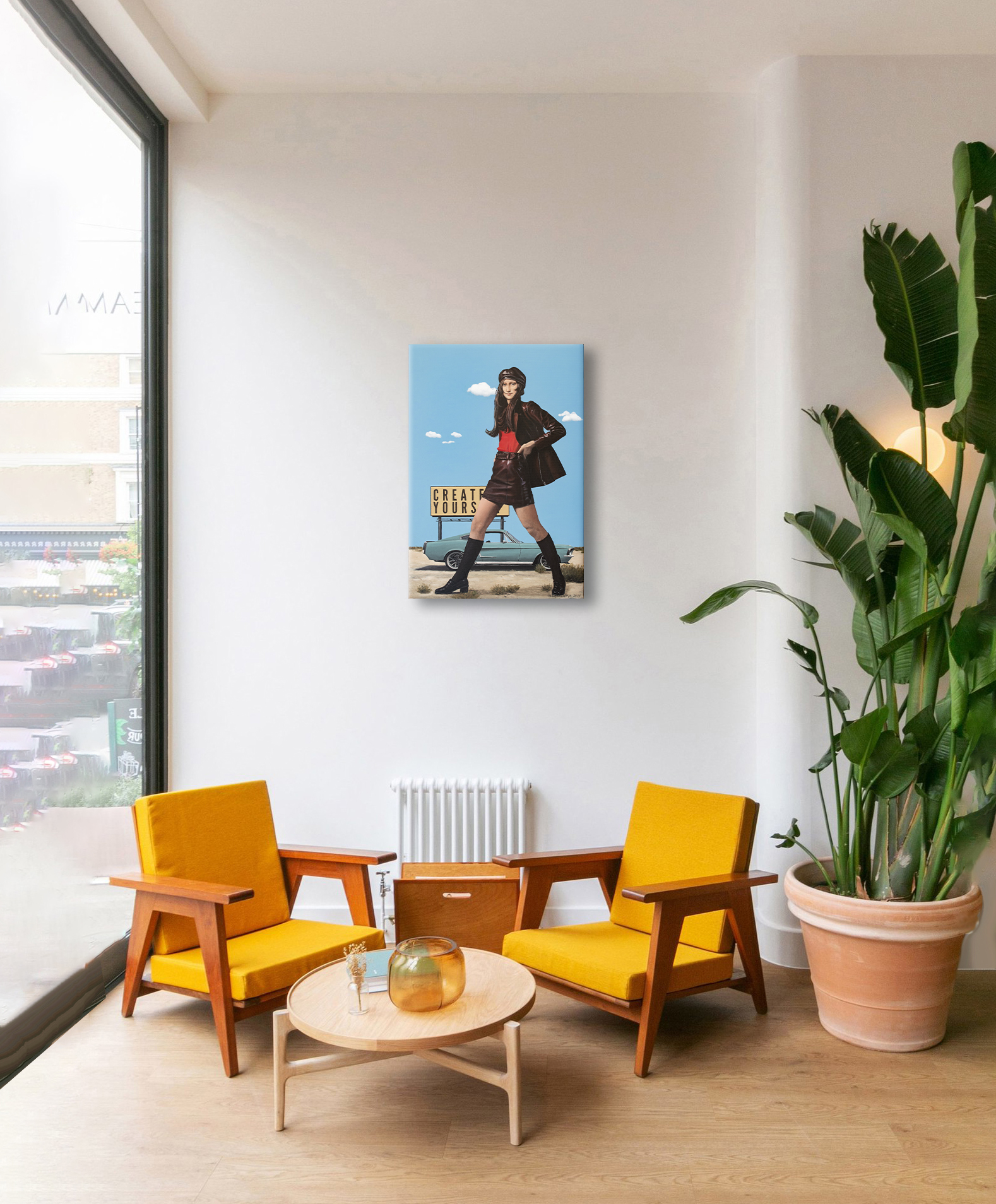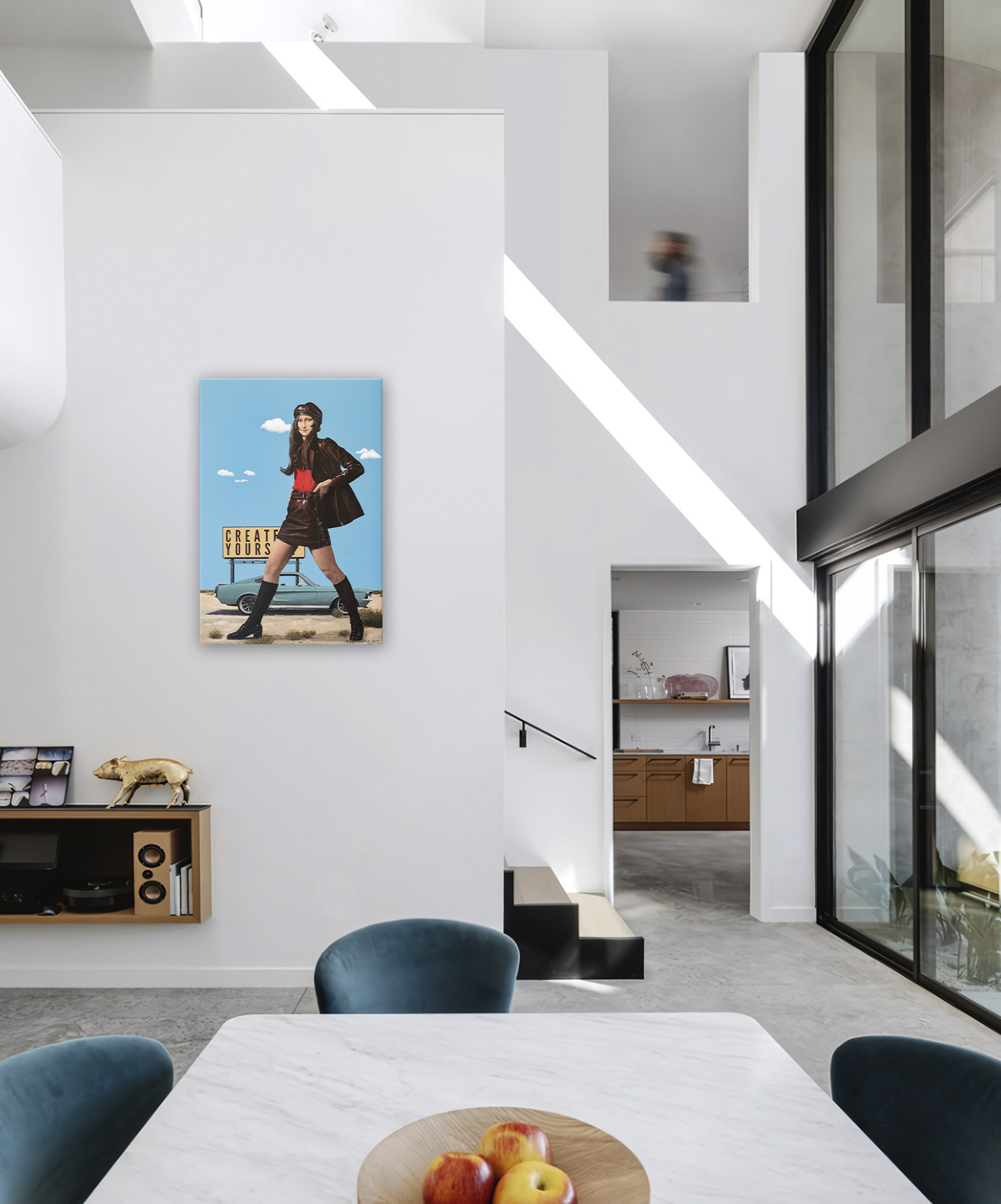 Na obrazie dominuje błękitne niebo – niemal bezkresne, zaledwie ozdobione kilkoma puszystymi chmurkami, które dodają scenie lekkości i przestrzeni. Centralną postacią jest kobieta w intensywnie czerwonym topie i brązowej spódniczce – ucieleśnienie retro stylu i niezależnej energii. Jej postawa emanuje pewnością siebie, a ciemne, długie włosy spływające po ramionach porządkują całą kompozycję niczym rama. W tle widnieje turkusowy samochód w stylu vintage oraz żółty billboard z hasłem „CREATE YOURSELF” – przesłaniem, które wybrzmiewa jak manifest wolności i samostanowienia. Całość wpisuje się w estetykę pop-artu: intensywne kolory, płaskie plamy barwne i wyraziste kontury dominują nad delikatnym cieniowaniem. Mimo graficznego uproszczenia, obraz pozostaje szczegółowy i dopracowany. To dzieło prowokuje emocje. Jest w nim nuta nostalgii za dekadami minionymi, ale też potężna dawka inspiracji. Dla mnie to przypomnienie, że każdego dnia możemy na nowo tworzyć siebie. Dziewczynka patrząc na ten obraz mogłaby powiedzieć: „Wygląda jak superbohaterka!”. To hołd dla wolności, odwagi i kobiecej siły. Wow, ten samochód wygląda jak z bajki – aż chce się ruszyć w podróż ku sobie! Obraz powstał z użyciem holenderskich farb akrylowych Amsterdam na włoskim płótnie bawełnianym Unico o drobnym splocie. Satynowy werniks pogłębia kolory i dodaje eleganckiego wykończenia. Boczne krawędzie zostały zamalowane w kolorze tła, dzięki czemu nie wymaga dodatkowego ramowania. Praca należy do serii Life in Avatar, posiada sygnaturę artystki i certyfikat autentyczności.