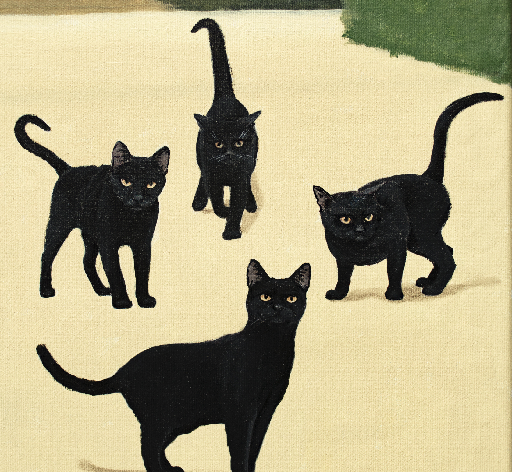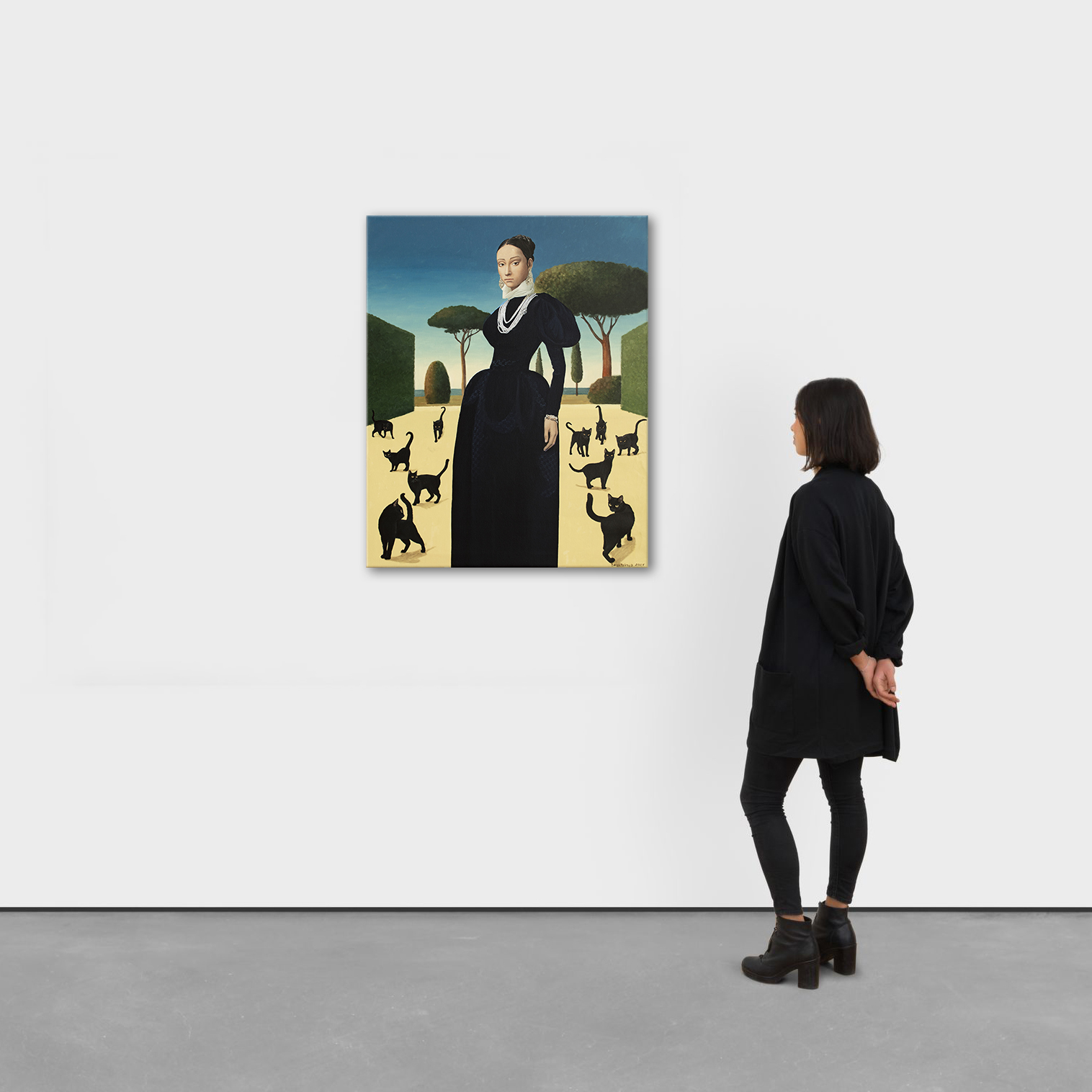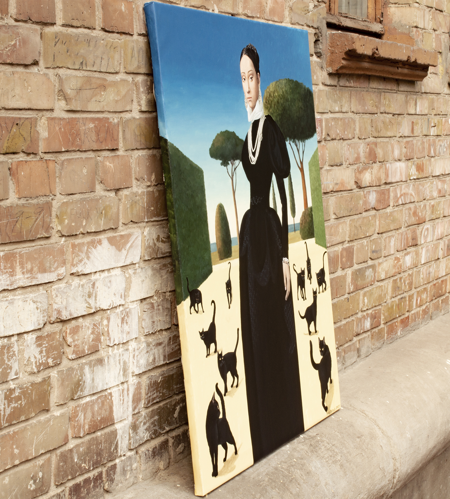 Na obrazie widzimy elegancko ubraną kobietę stojącą w otoczeniu czarnych kotów. Scena jest pełna kontrastów — intensywny błękit nieba i ciemna suknia bohaterki tworzą intrygujący efekt. Drzewa na horyzoncie mają nietypowe, kuliste kształty, co nadaje całemu krajobrazowi nieco surrealistycznego charakteru. Koty, z ogonkami uniesionymi do góry, wydają się być zaintrygowane obecnością kobiety. Obraz emanuje pewnym tajemniczym spokojem. Styl nawiązuje do klasycznych portretów renesansowych, ale ma w sobie coś współczesnego. Technika wydaje się być precyzyjna, z dużym naciskiem na detale — jakby artysta chciał nam coś important przekazać, coś ukrytego między liniami i cieniami. Można się zastanawiać, o czym myśli ta kobieta. Czy te koty to zwykłe, ciekawskie futrzaki czy może symbol czegoś głębszego? Obraz może budzić różne emocje, od fascynacji po lekki niepokój. Czuję, że ten obraz mówi o samotności, ale w taki piękny sposób, że aż chce się go oglądać bez końca. Można się w nim łatwo zatracić, jak w dobrej książce, gdzie każdy detal ma znaczenie. Do stworzenia obrazu użyto holenderskich farb akrylowych Amsterdam™ oraz włoskiego płótna marki Unico. Powierzchnię zabezpieczono satynowym werniksem, a boki zostały pomalowane w kolorze tła. Obraz powstał na naciągniętym płótnie na drewnianej ramie, jest sygnowany i opatrzony certyfikatem autentyczności. Starannie zapakowany – owinięty w folię bąbelkową i umieszczony w kartonowym pudełku – gotowy, by wyruszyć w swoją własną podróż.